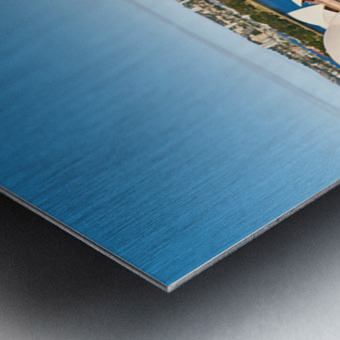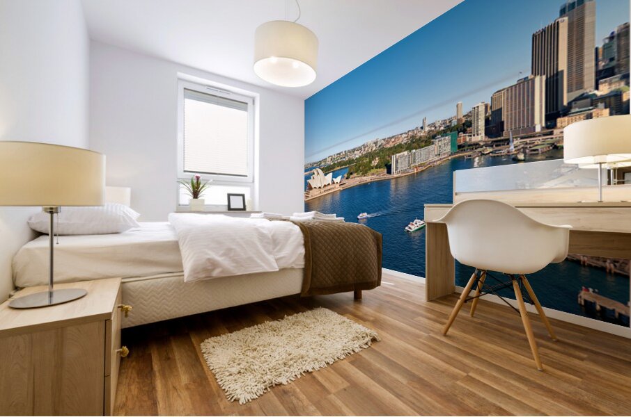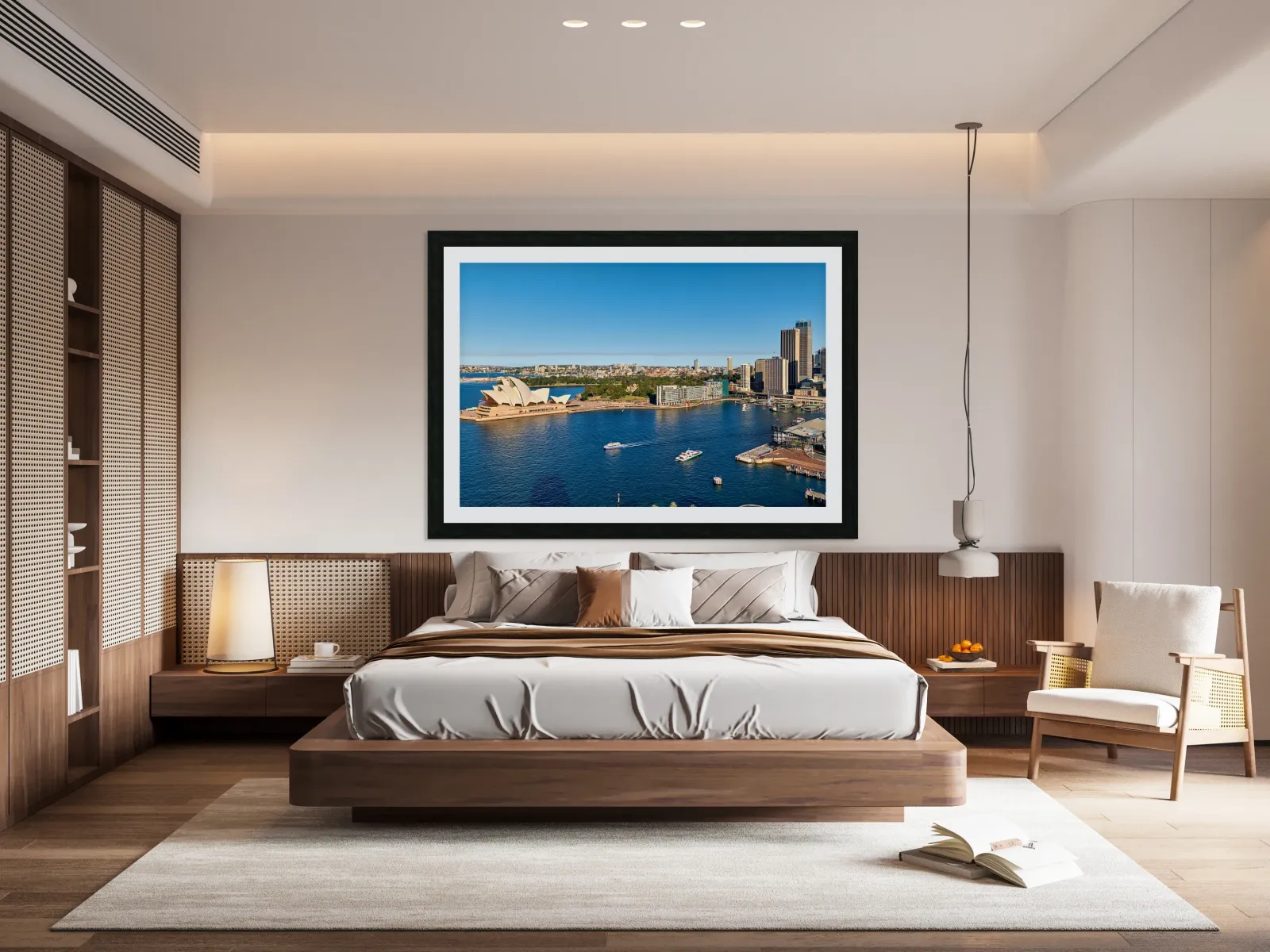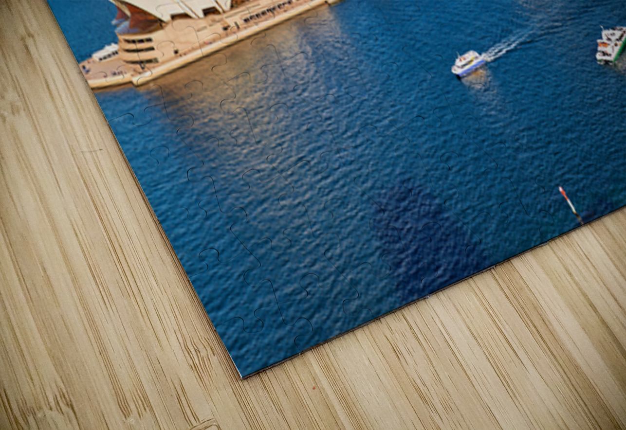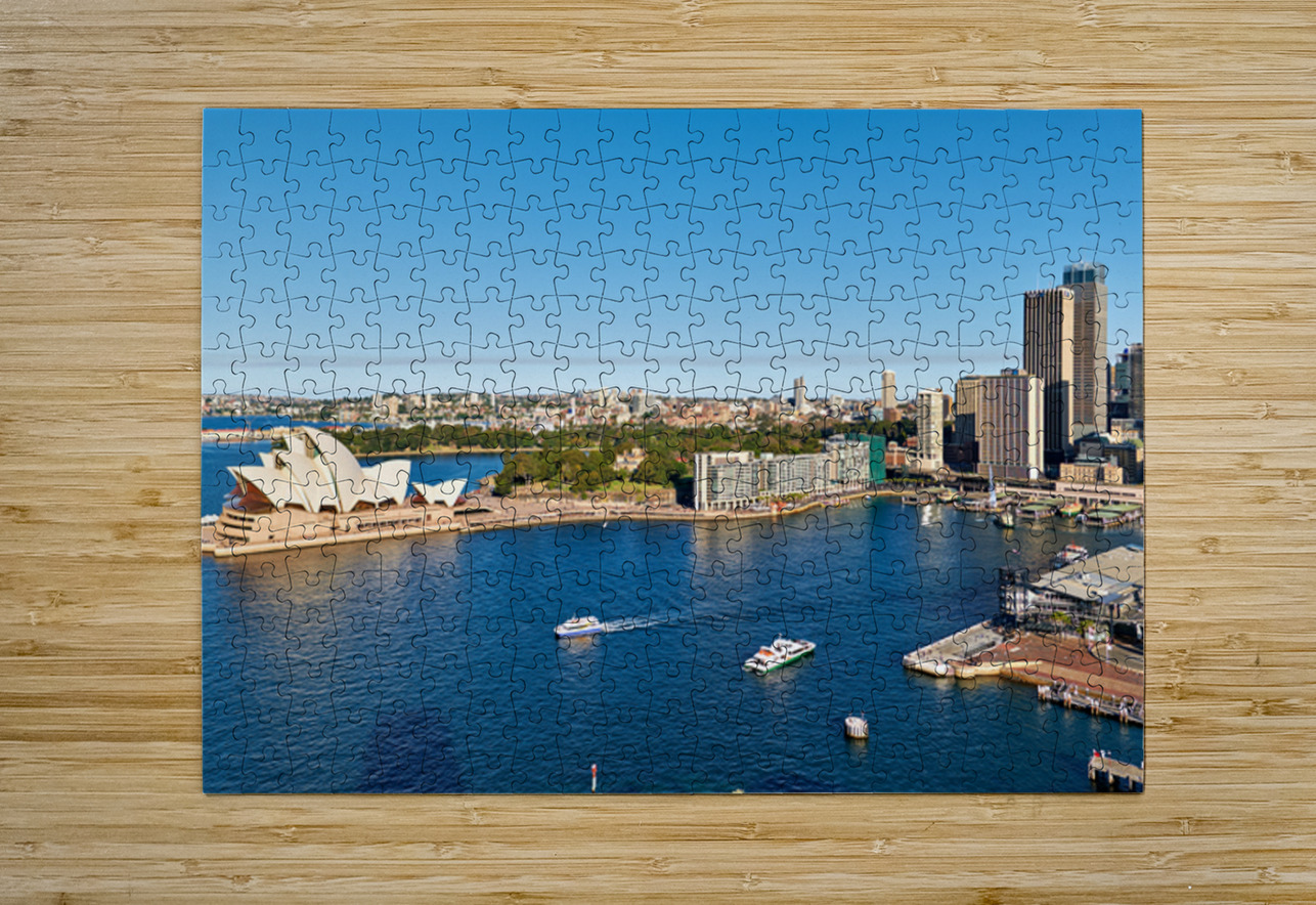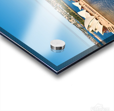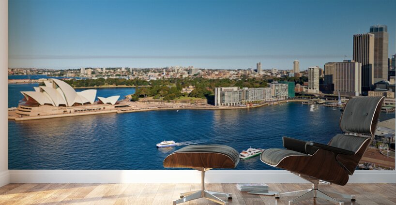 "Sydney Opera House and harbor with ferries on a sunny day." in a framed print.