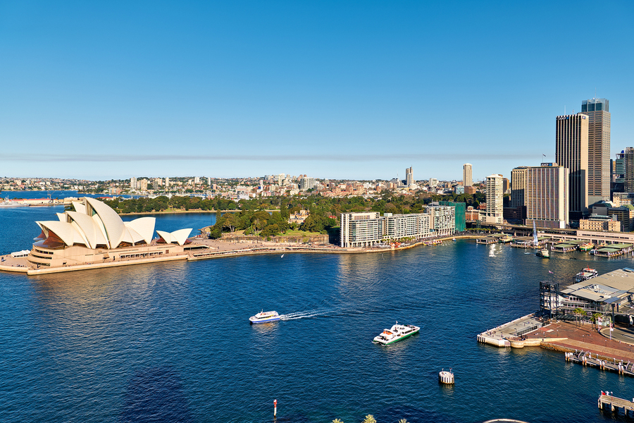 Sydney Australia - Ferries navigate the waters of Sydney Harbour with the iconic Opera House and city skyline in the background.