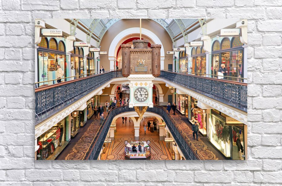 ABOUT THIS ARTWORK: ELEGANT VICTORIAN SHOPPING ARCADE WITH CLOCK TOWER AND SHOPPERS.