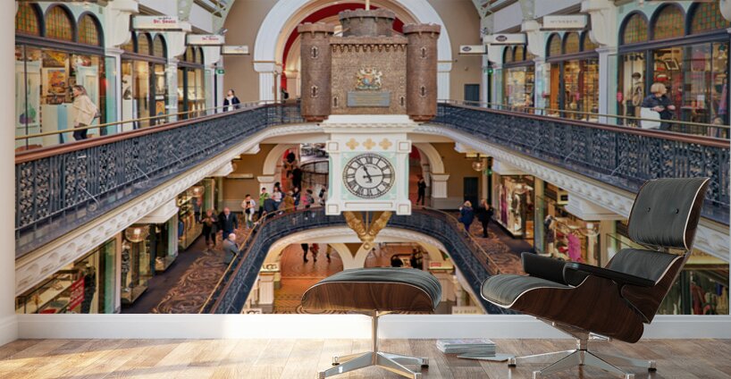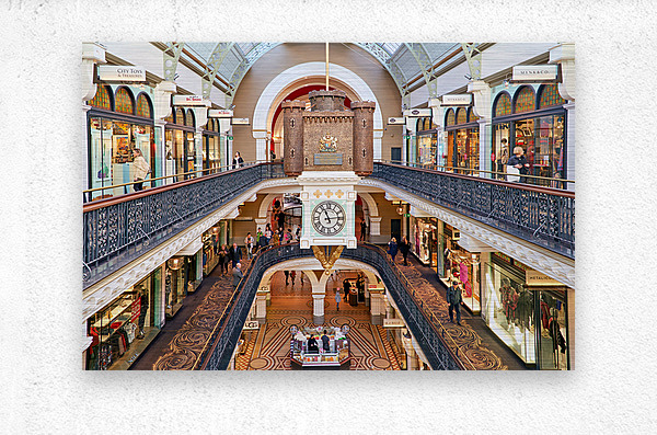 ELEGANT VICTORIAN SHOPPING ARCADE WITH CLOCK TOWER AND SHOPPERS.