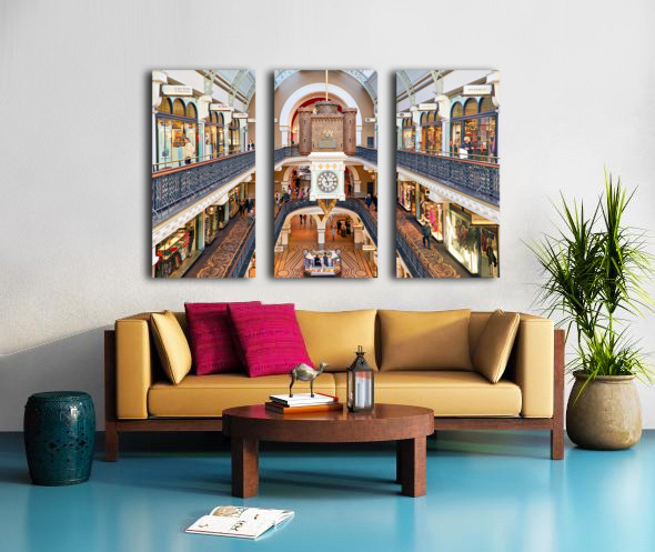 Elegant Victorian shopping arcade with clock tower and shoppers. Frame print