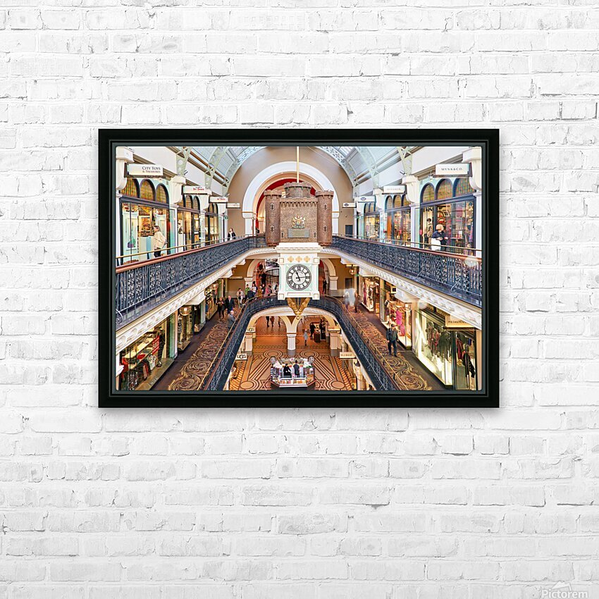 Elegant Victorian shopping arcade with clock tower and shoppers. Picture Frame Printing