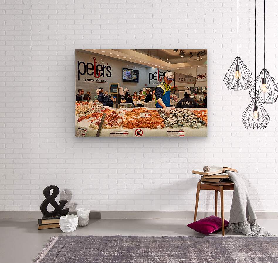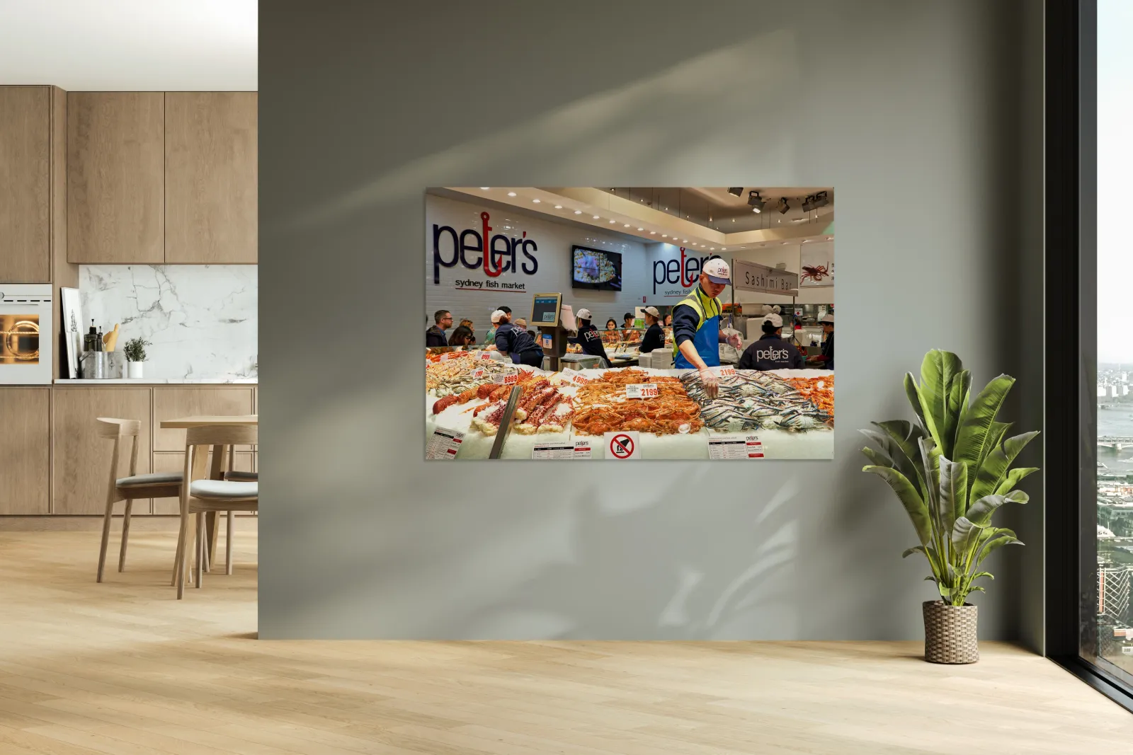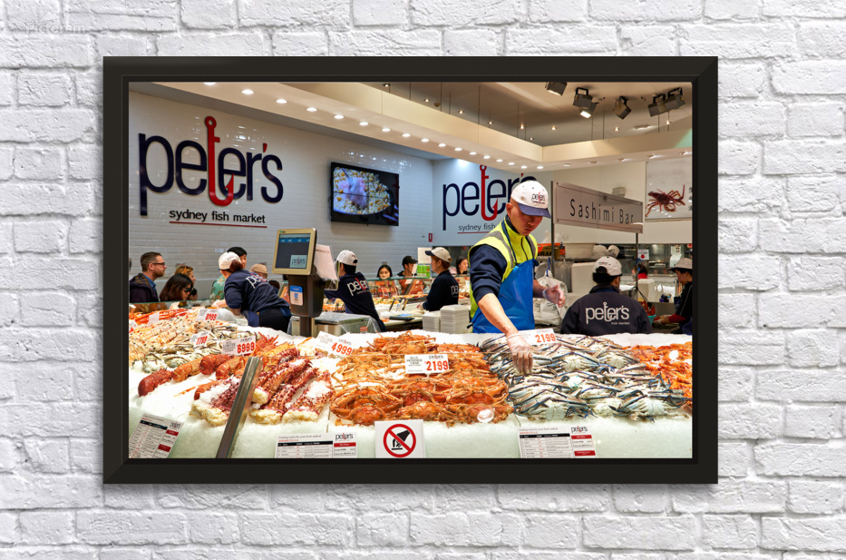 A vendor serves customers at Peters Sydney Fish Market displaying a variety of fresh seafood including crabs lobsters and prawns.