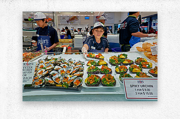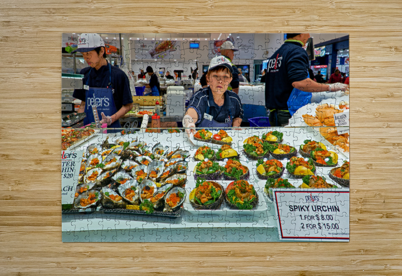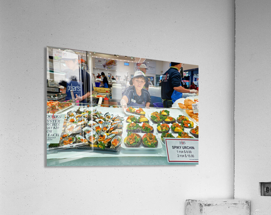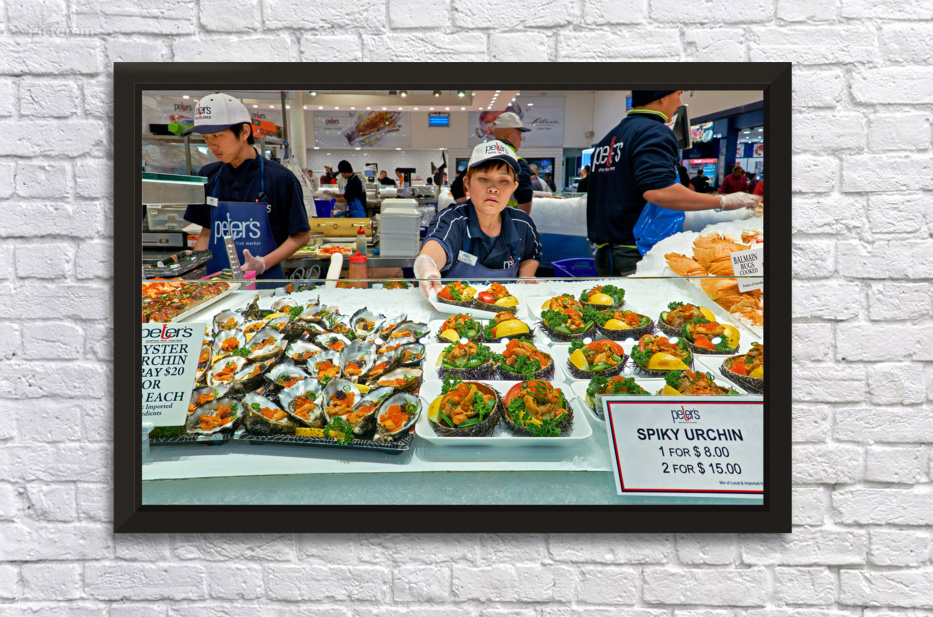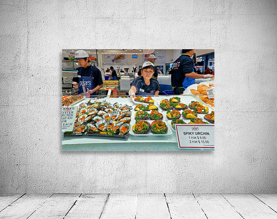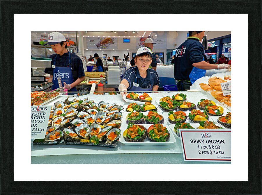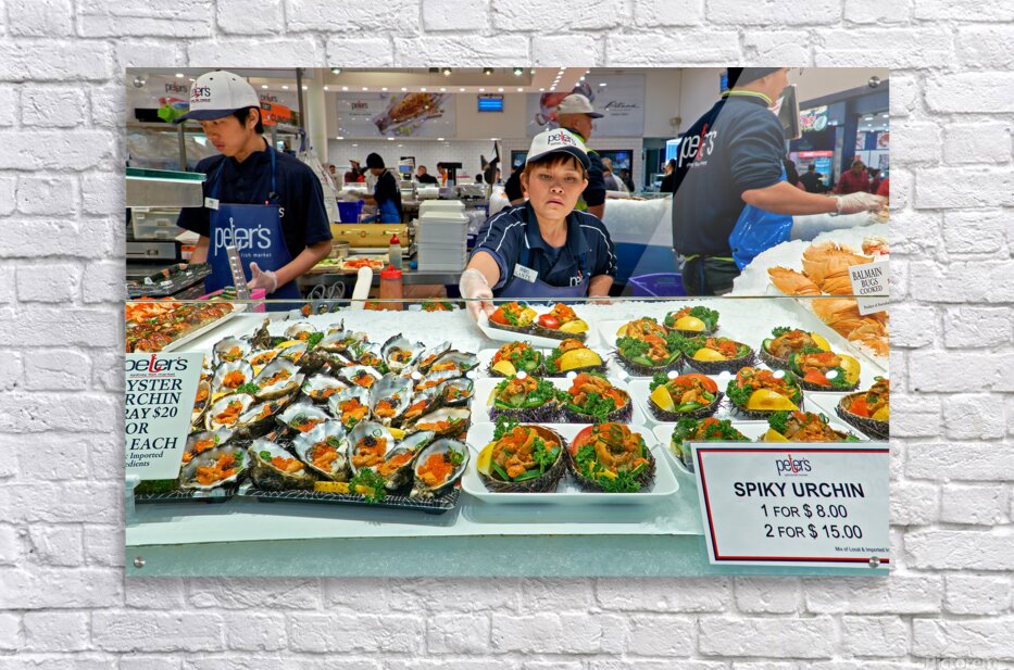 A vendor at Peters Sydney Fish Market serves customers with fresh oysters and spiky urchin dishes. The market offers a variety of seafood options.