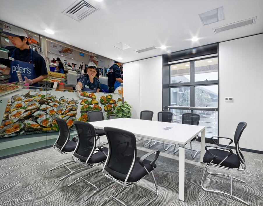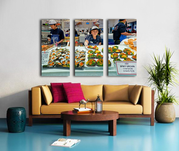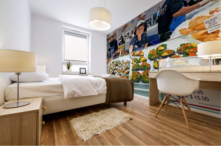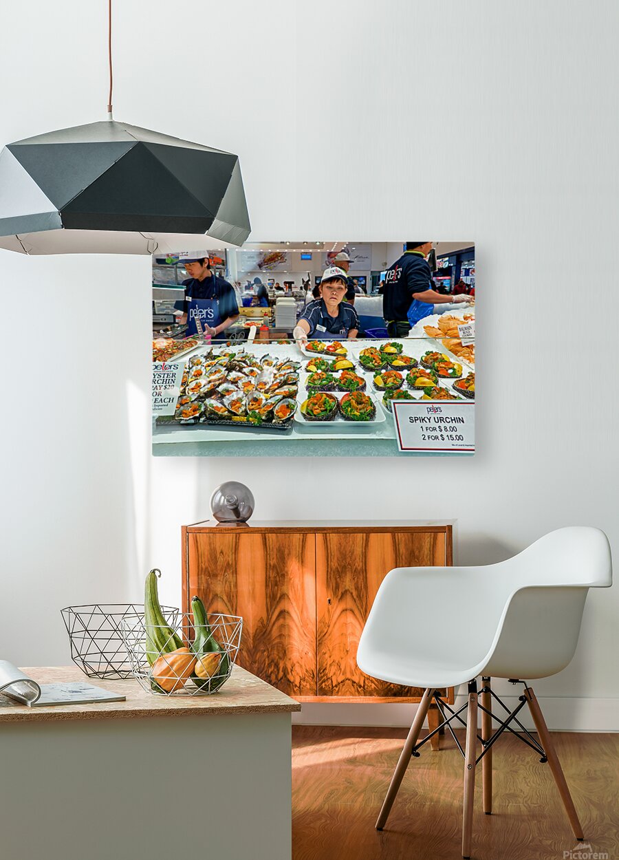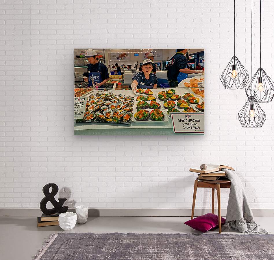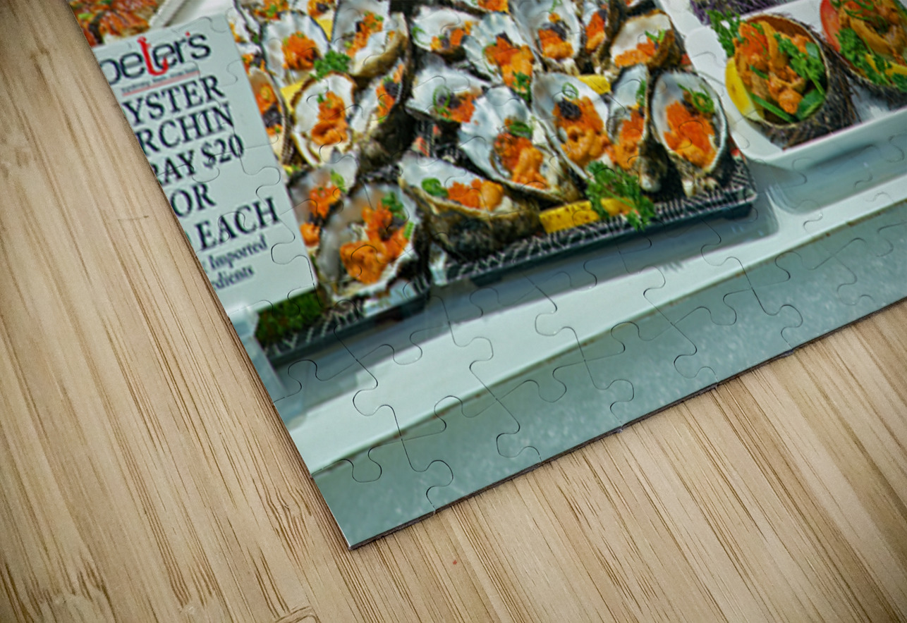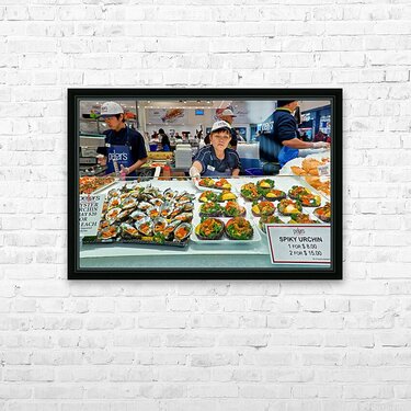 A vendor at Peters Sydney Fish Market serves customers with fresh oysters and spiky urchin dishes. The market offers a variety of seafood options.