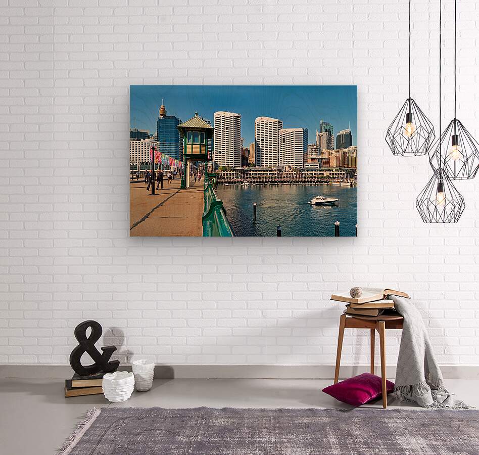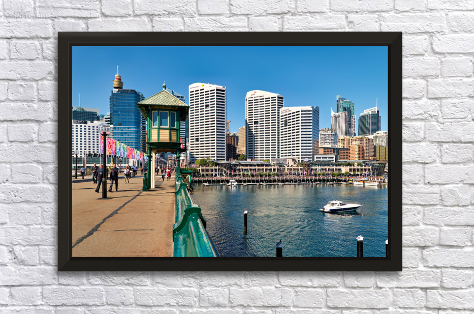 Sydney Australia - People stroll along the waterfront at Darling Harbour with the citys iconic skyline featuring the Sydney Tower and Commonwealth Ban
