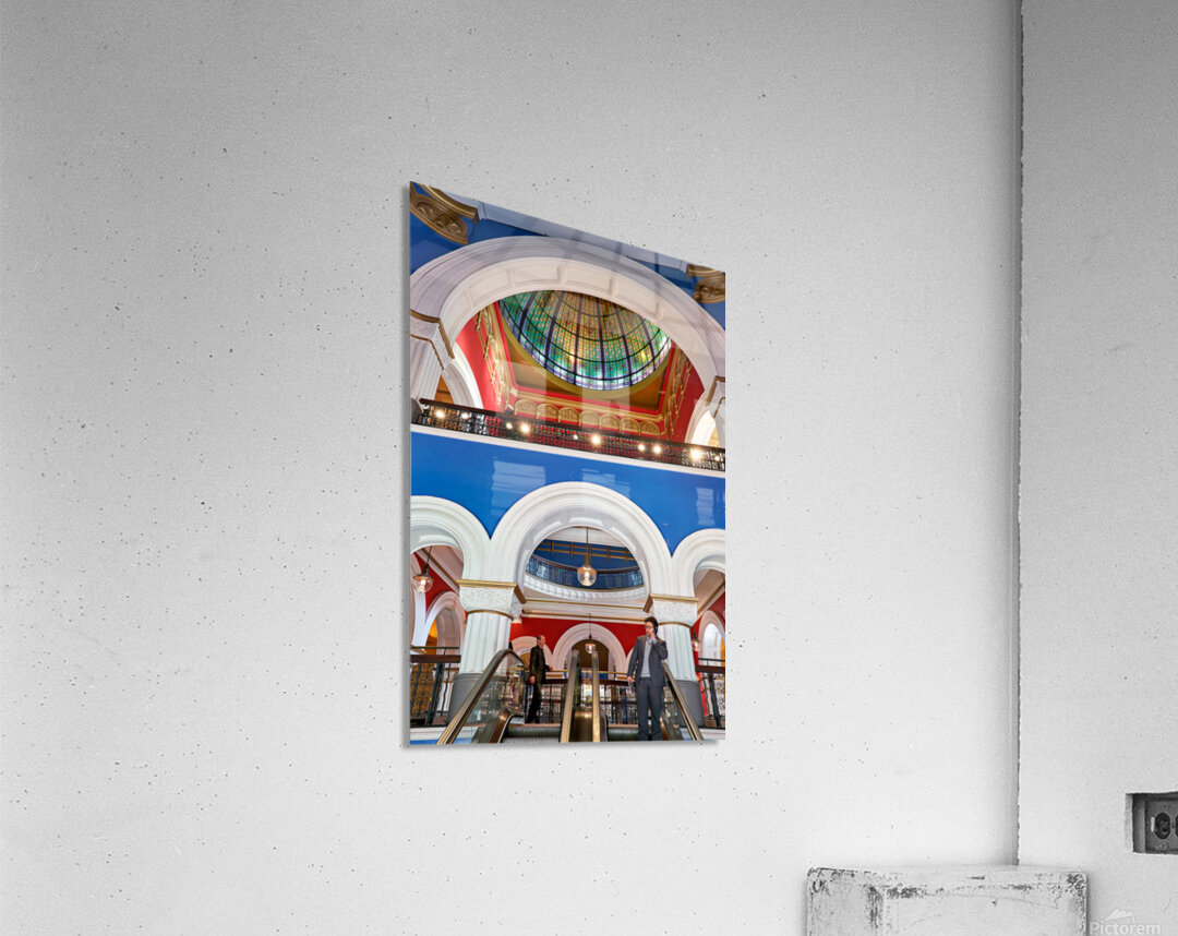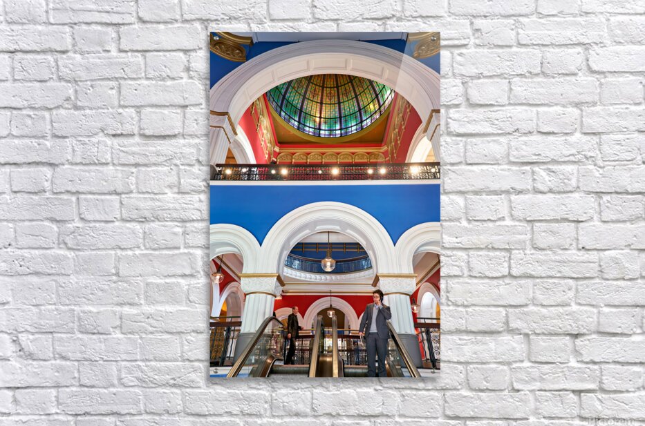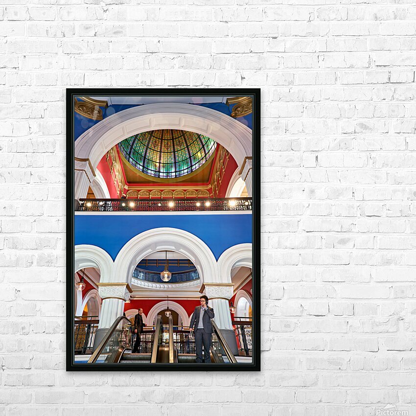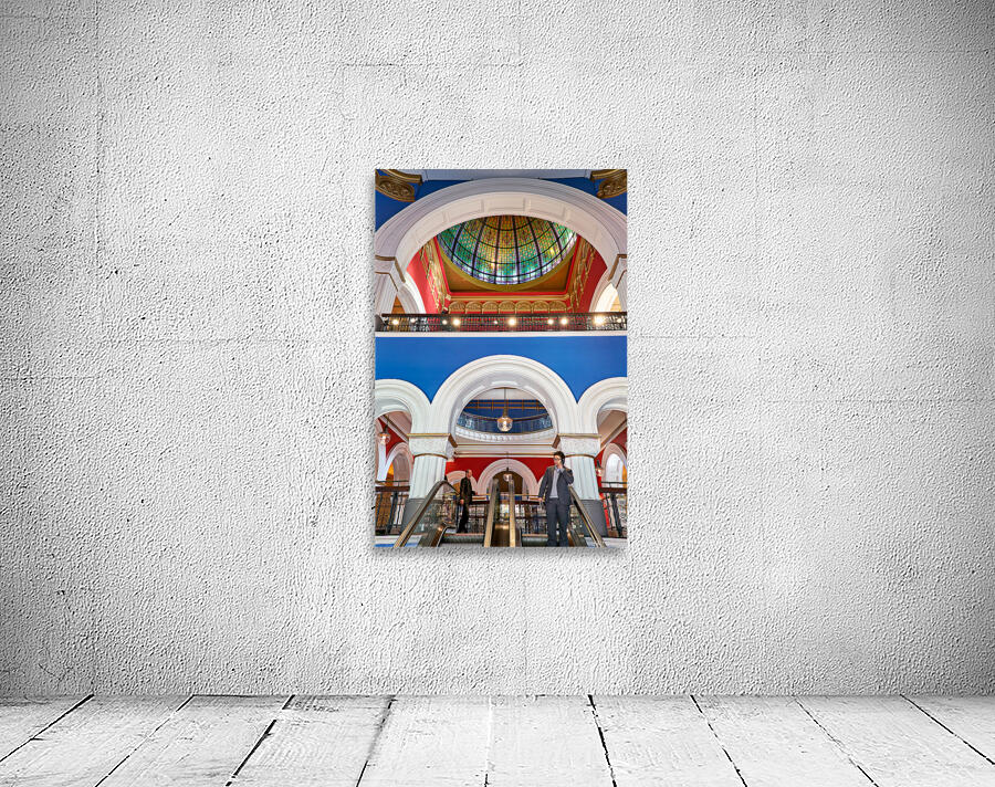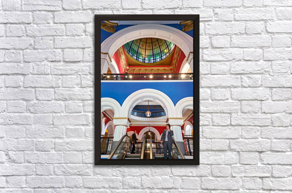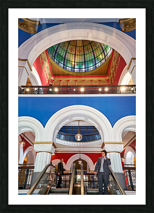 "Men ride escalators in Queen Victoria Building in Sydney" in a framed print.