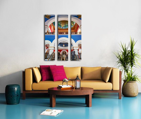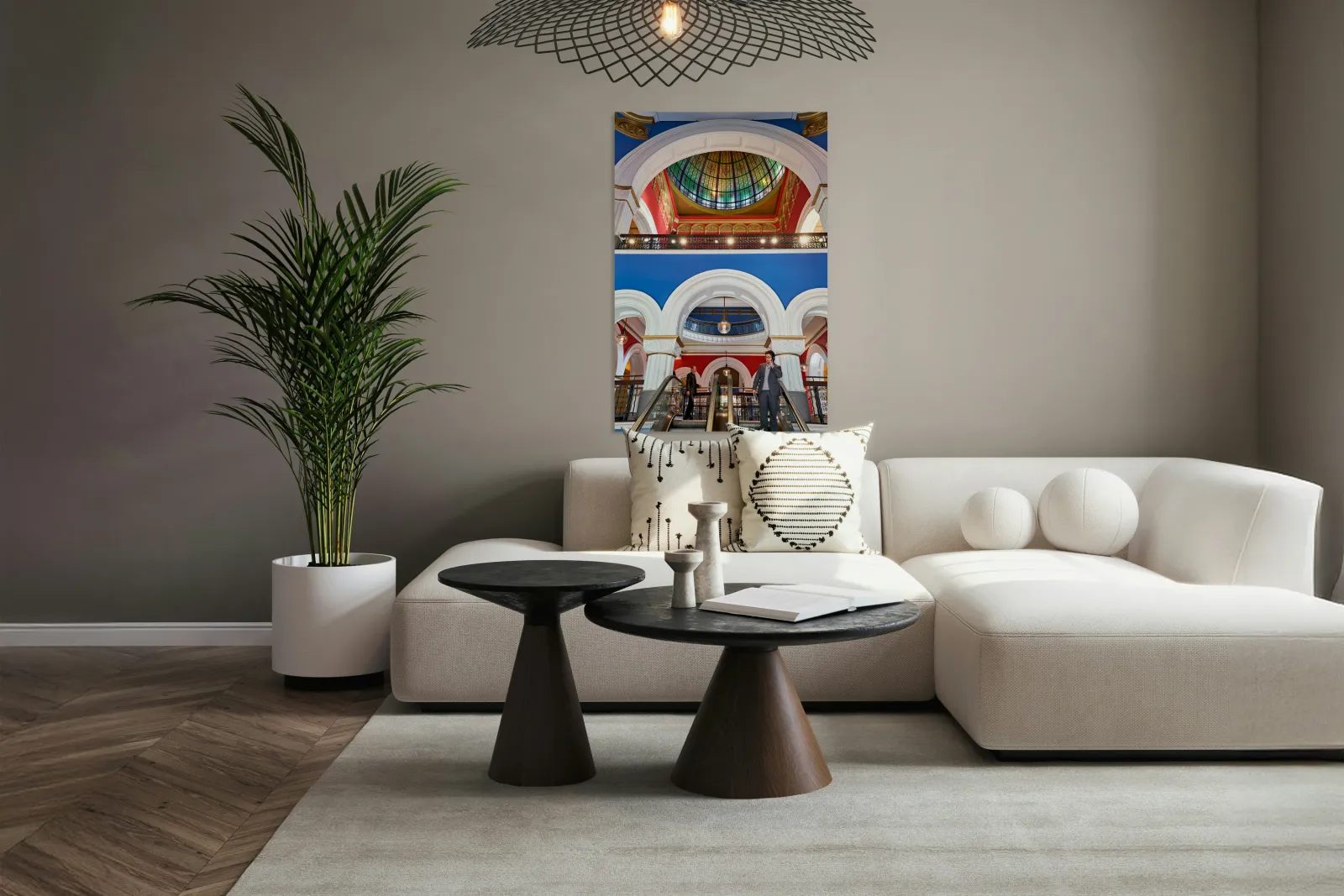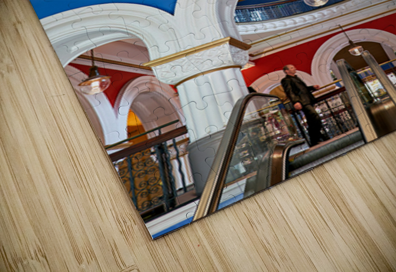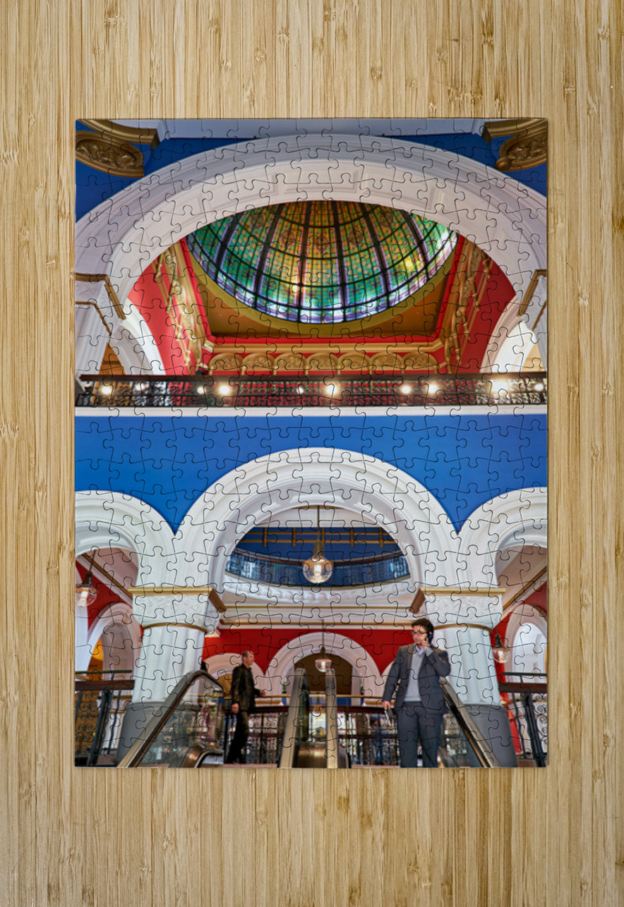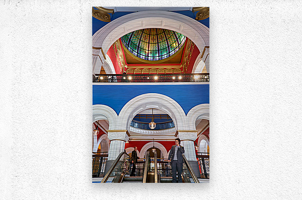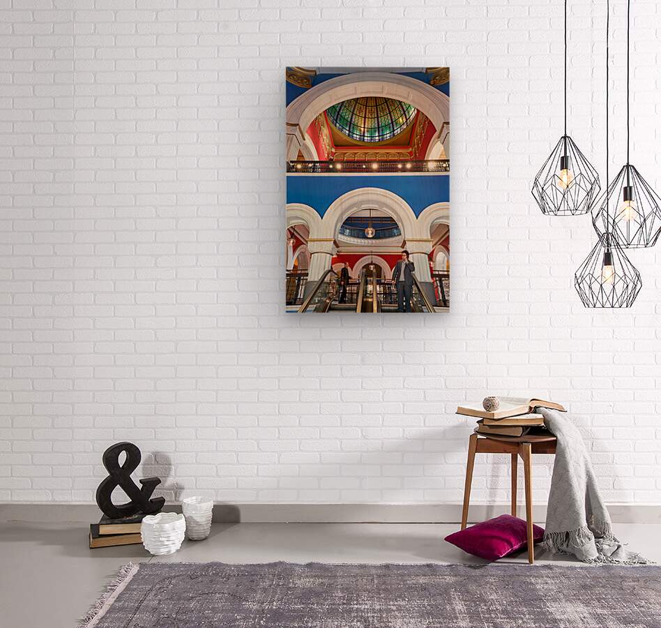 "Men ride escalators in Queen Victoria Building in Sydney" in a framed print.