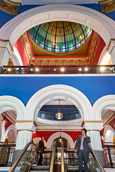 Men use escalators inside the Queen Victoria Building in Sydney. The historic structure features a large stained glass dome above.