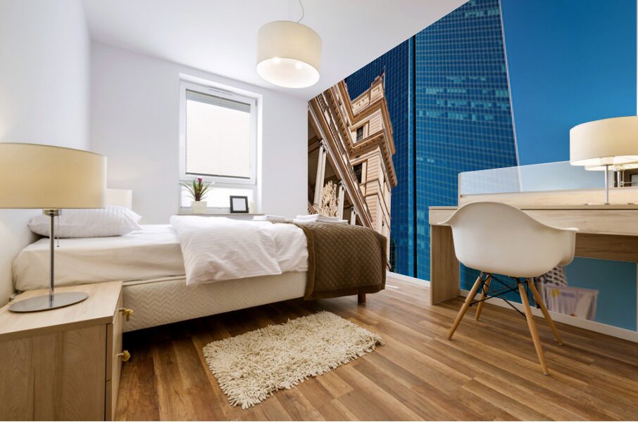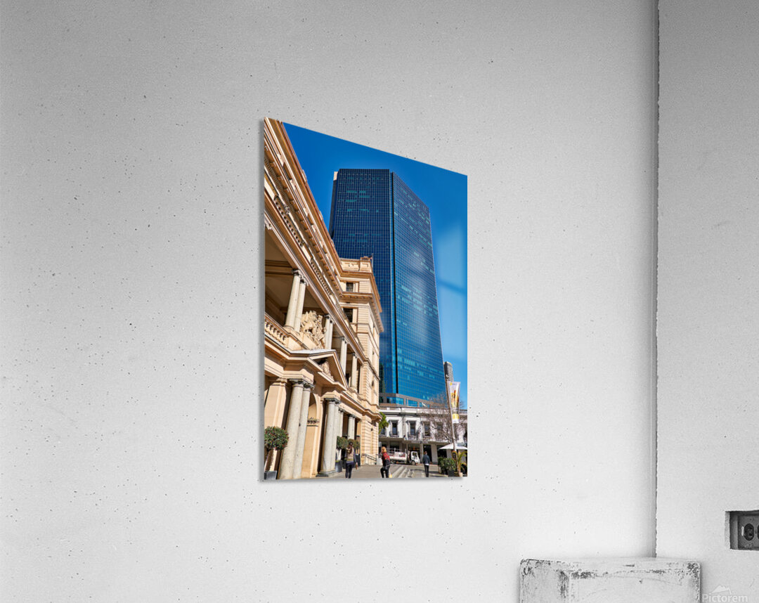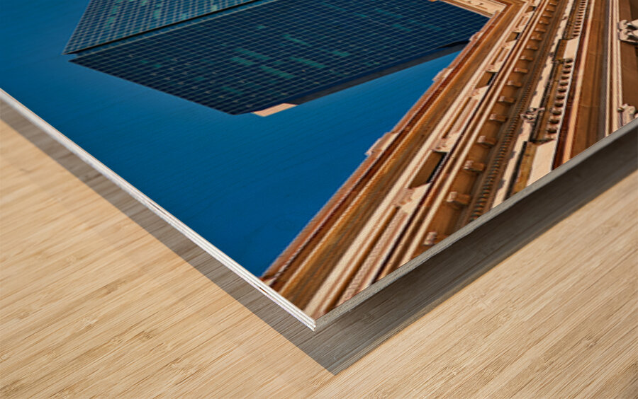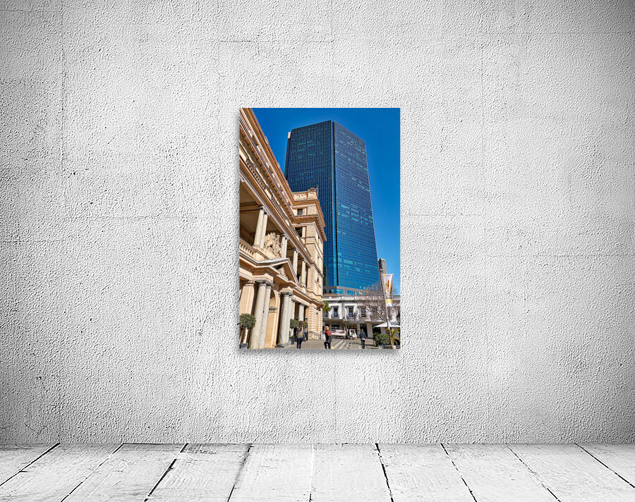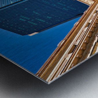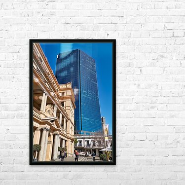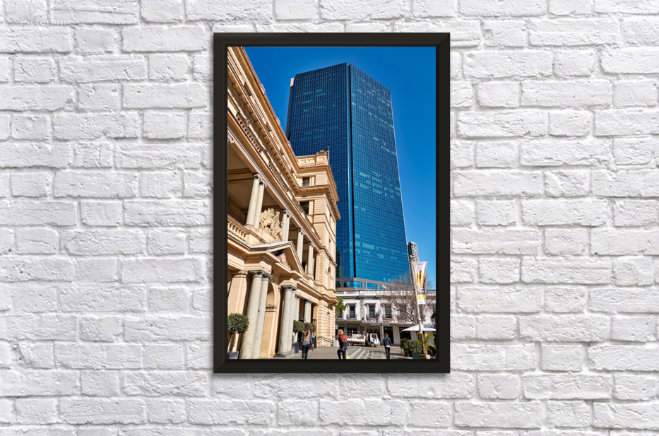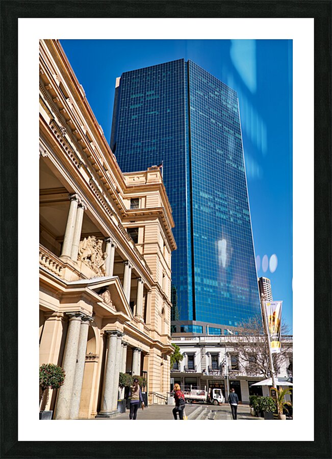 "Modern skyscraper dwarfs historic building under clear blue sky." in a framed print.