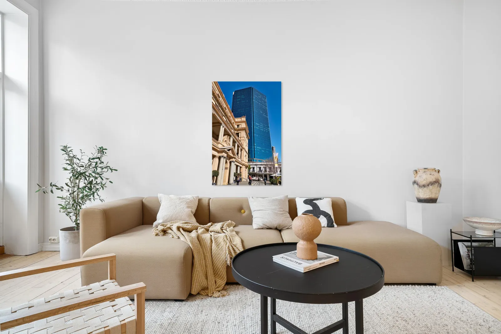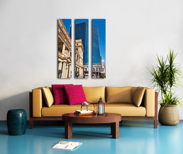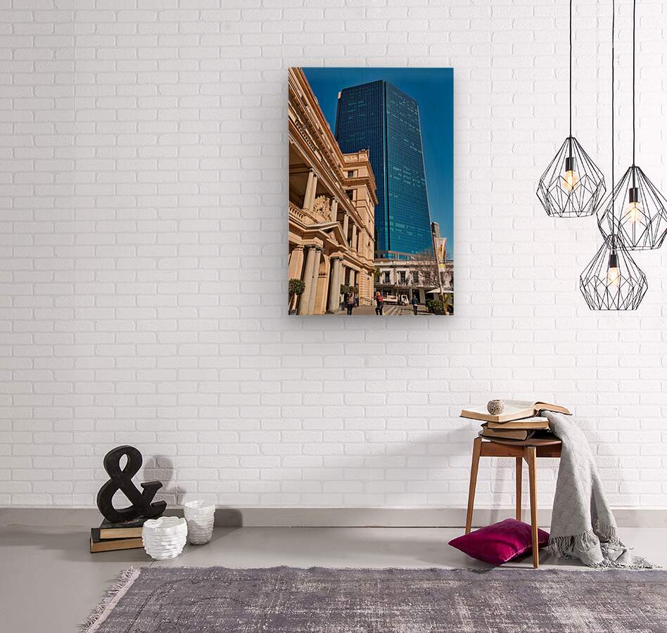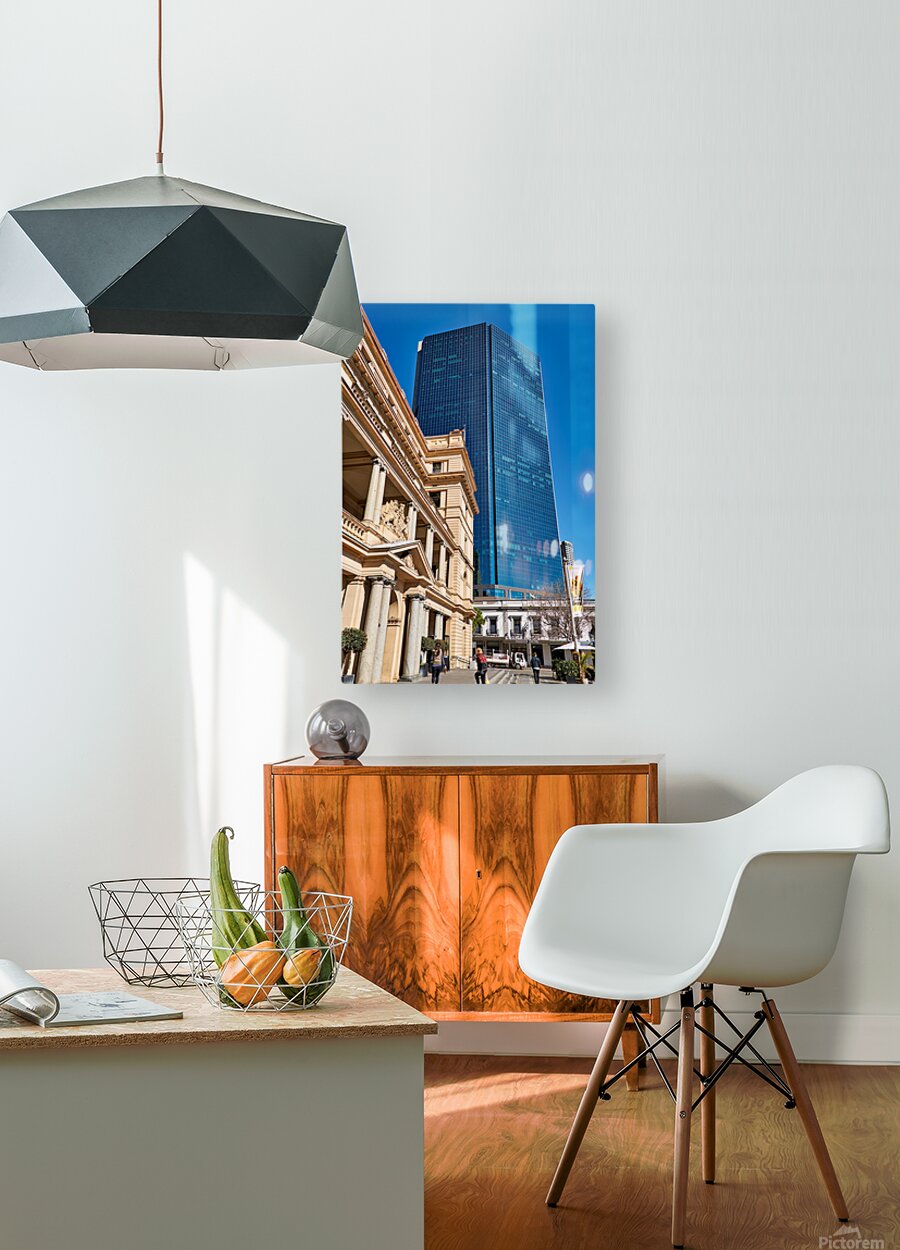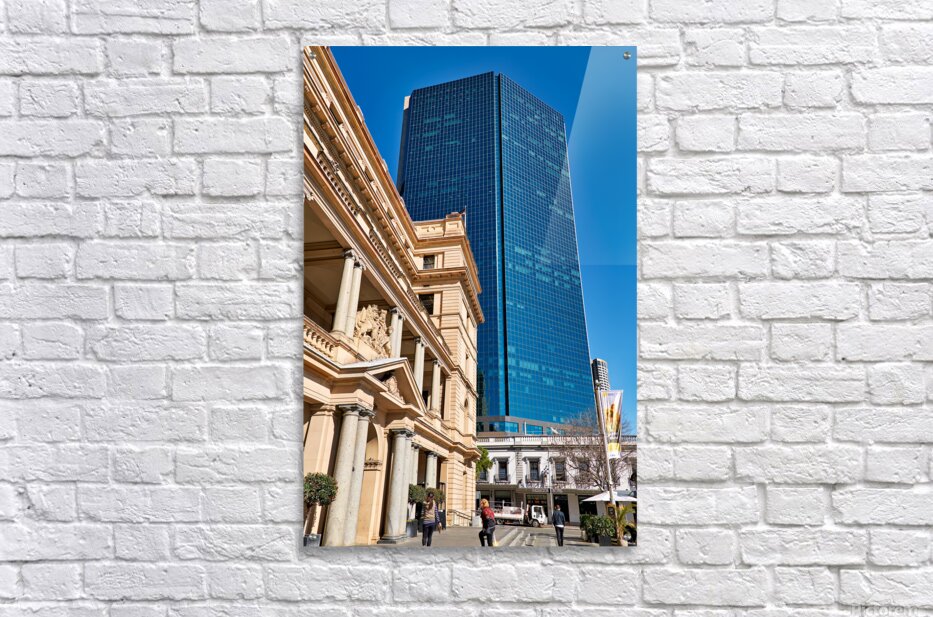 "Modern skyscraper dwarfs historic building under clear blue sky." in a framed print.