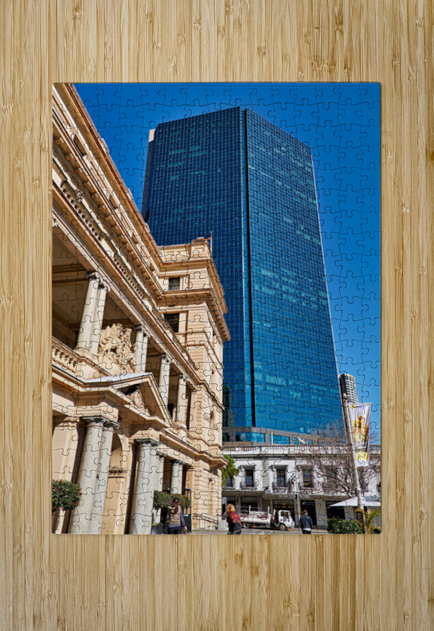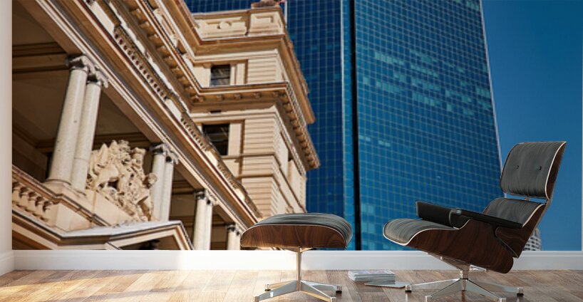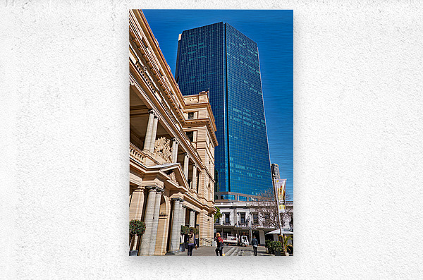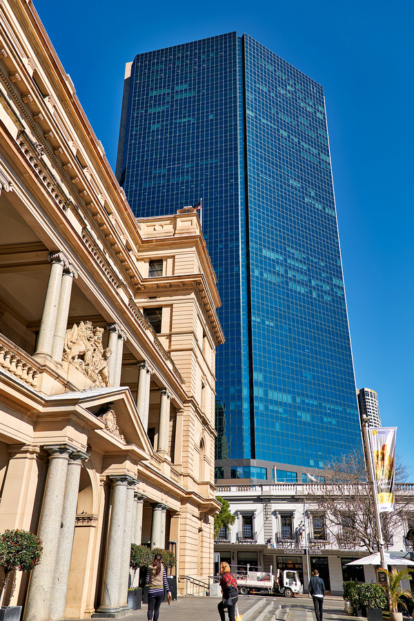 A modern blue glass skyscraper looms behind a classical sandstone building in Sydney Australia.