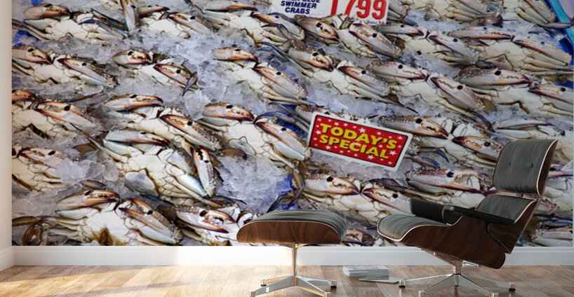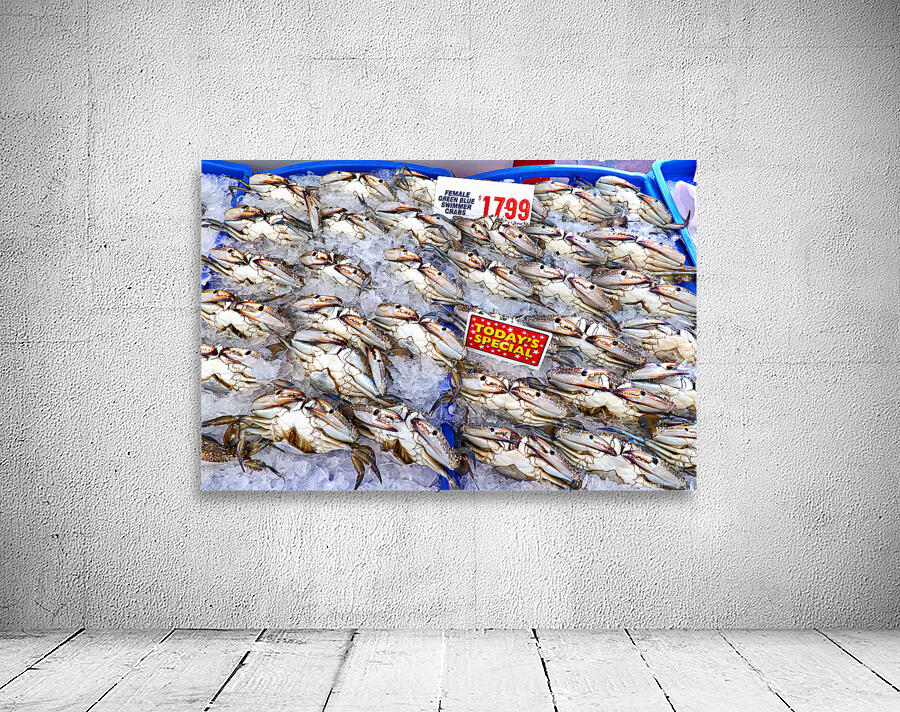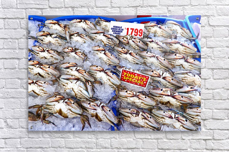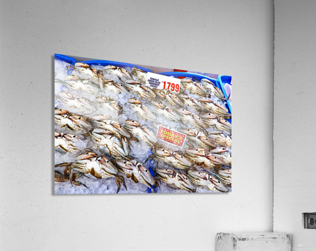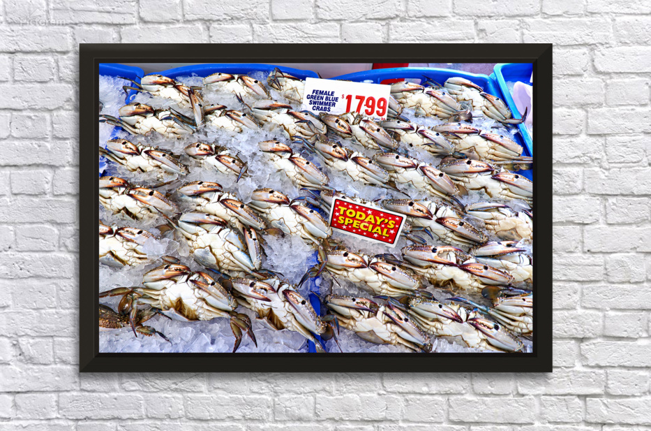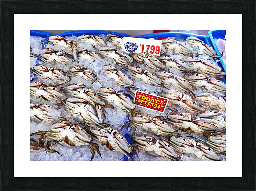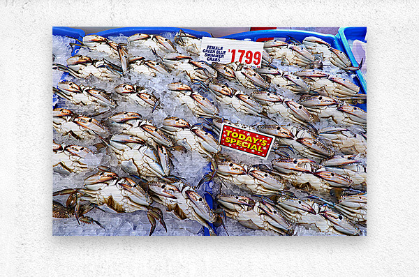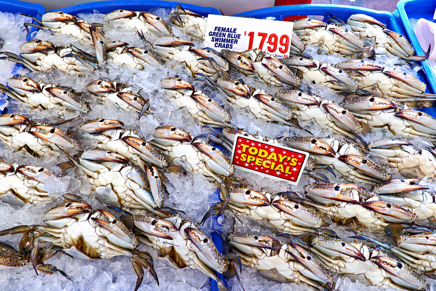 Fresh female green blue swimmer crabs are on display for sale at a market priced at $17.99 as a special offer.