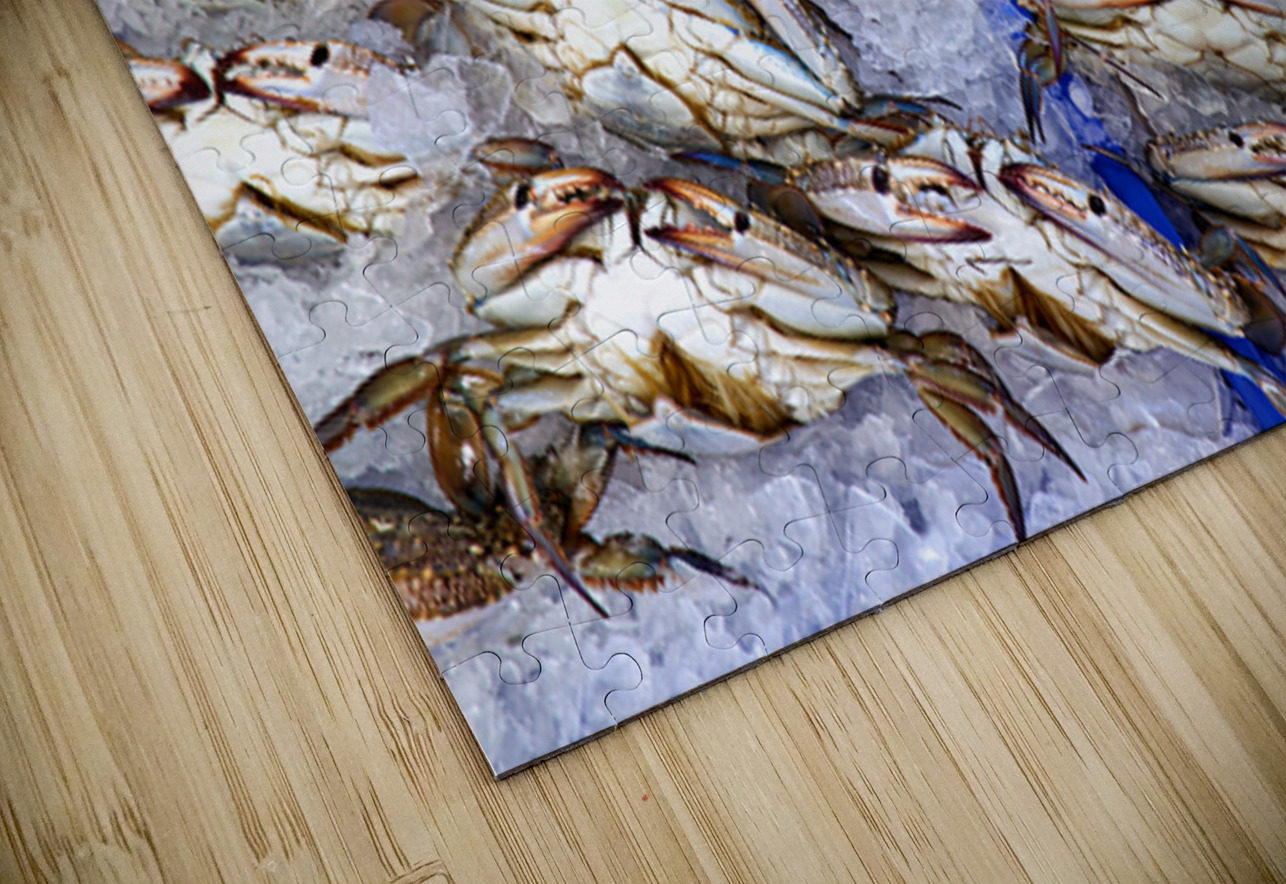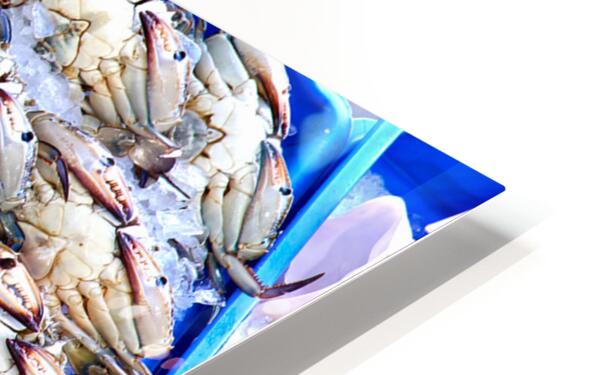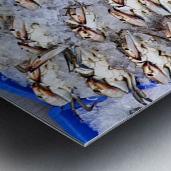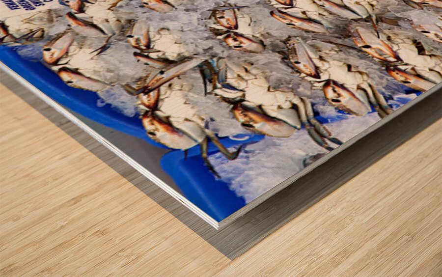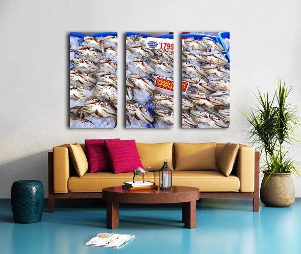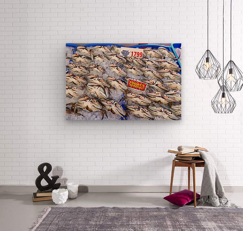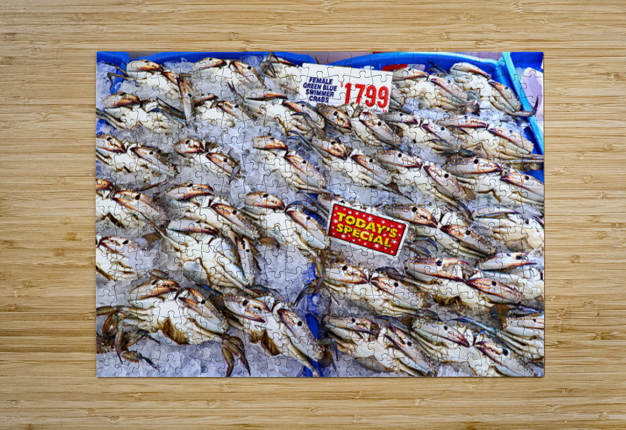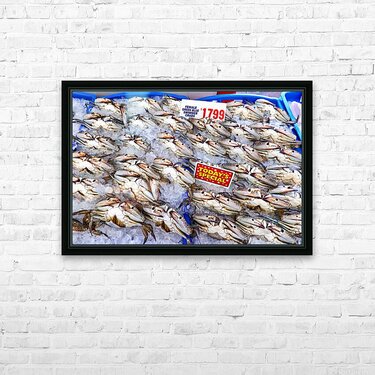 Fresh female green blue swimmer crabs are on display for sale at a market priced at $17.99 as a special offer.