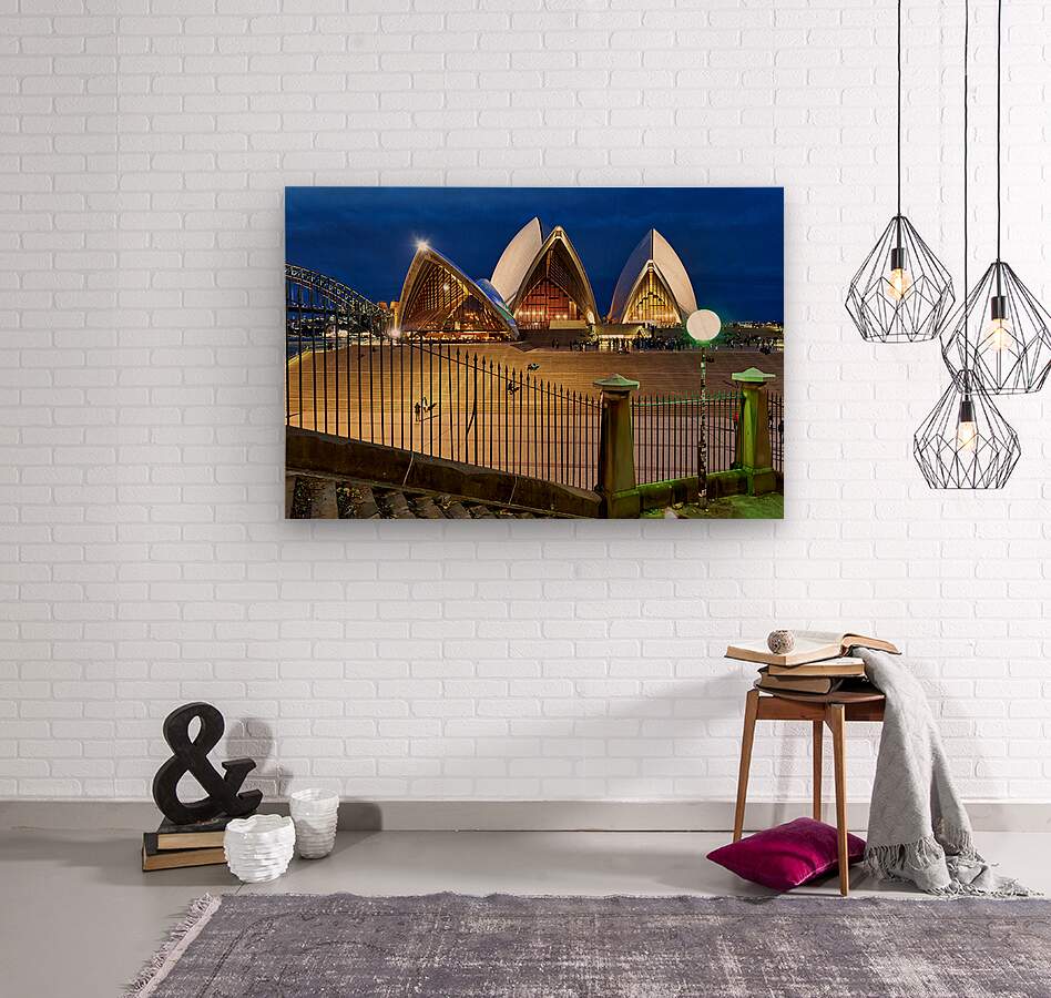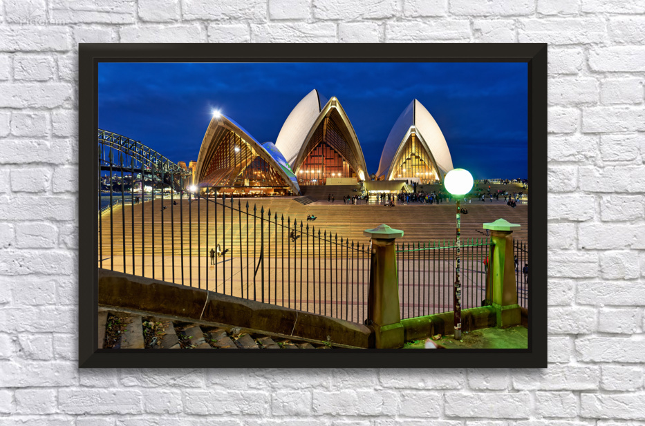 Sydney Opera House at dusk with people gathering on the steps and the Harbour Bridge visible in the background.