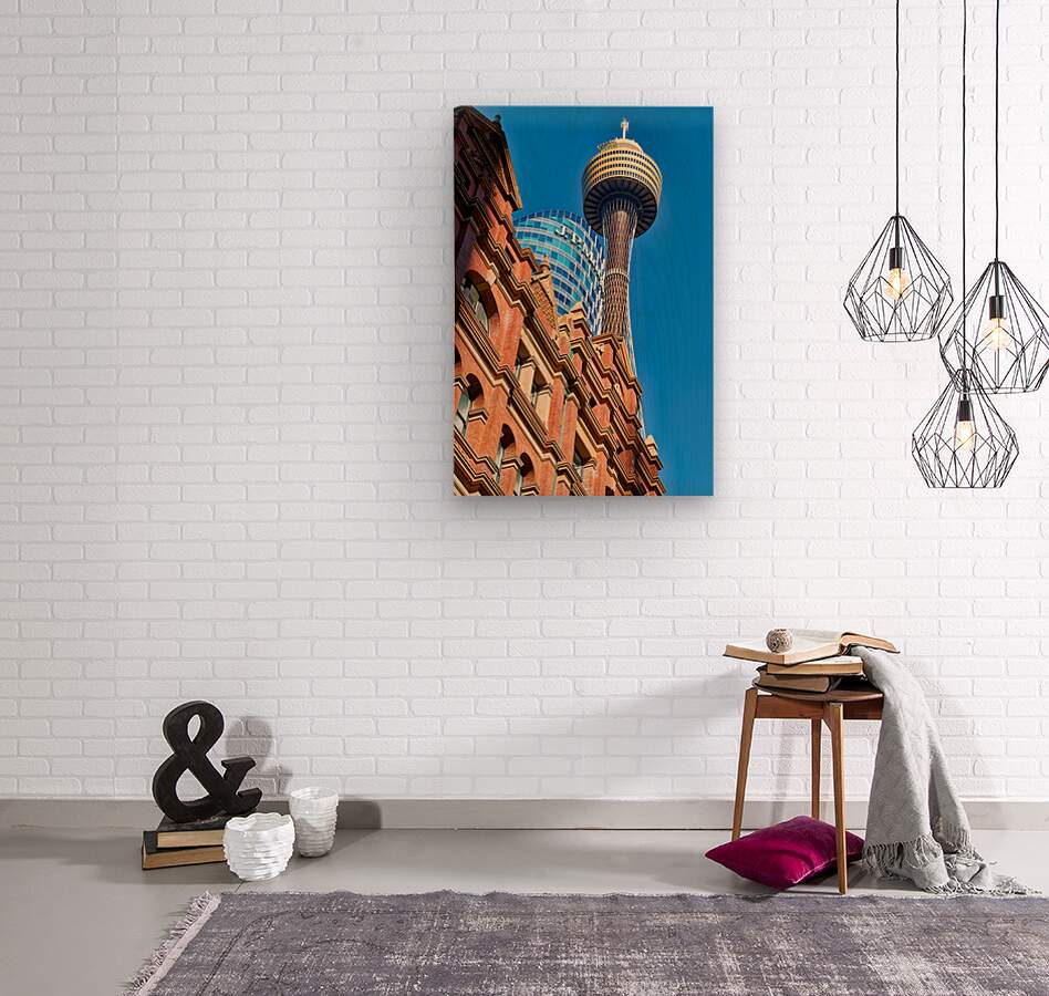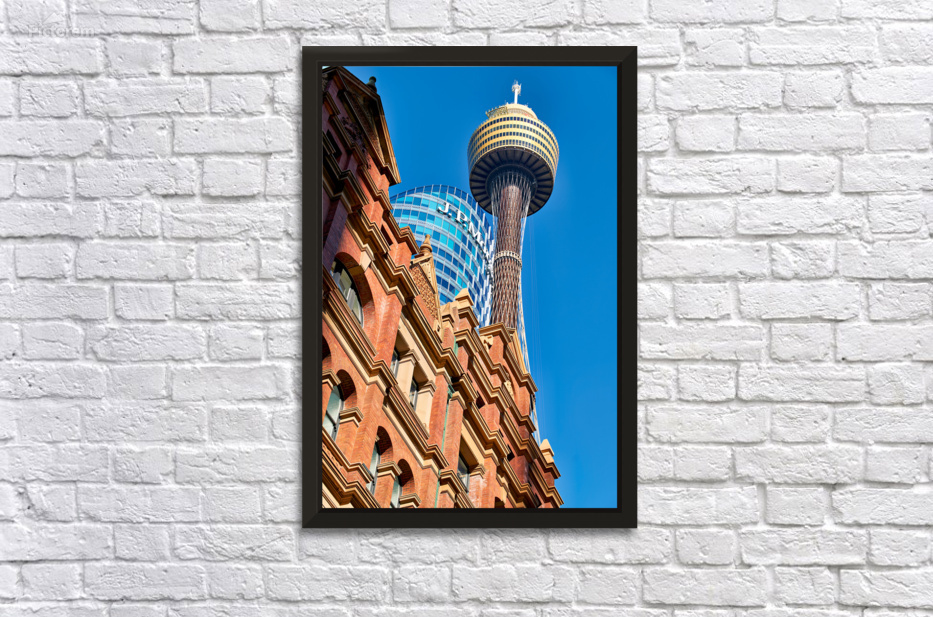 Sydney Tower Eye Australias tallest structure stands behind a historic brick building with the J.P. Morgan building in the background.