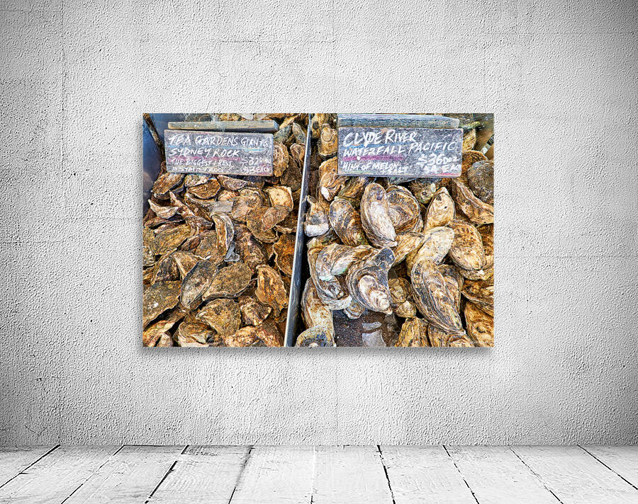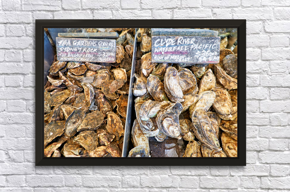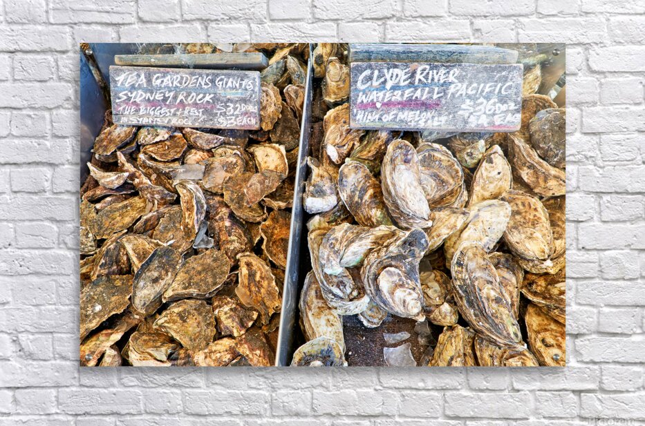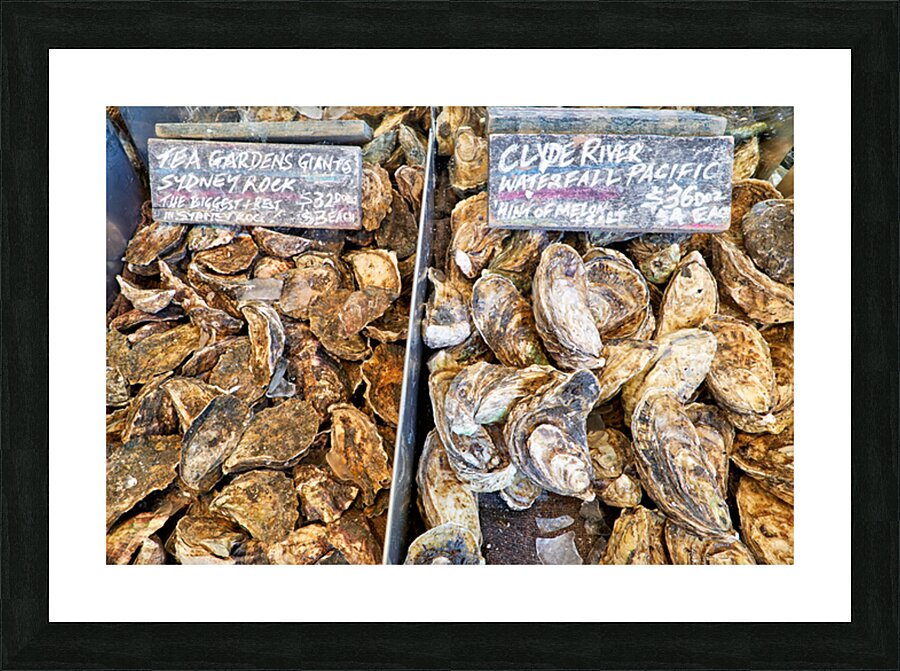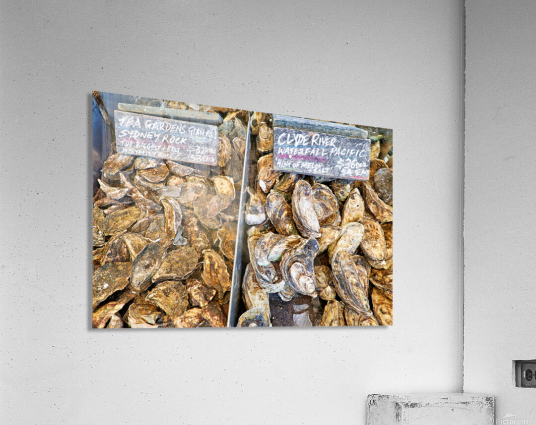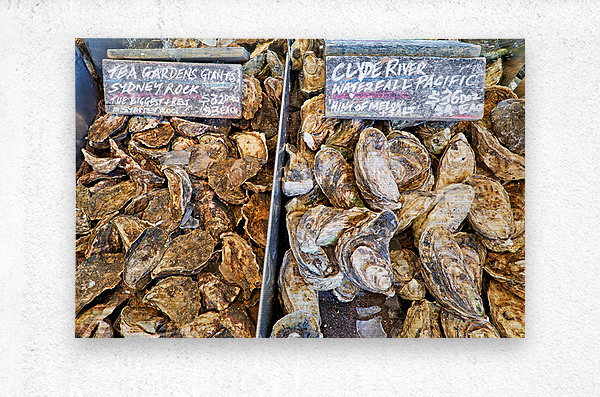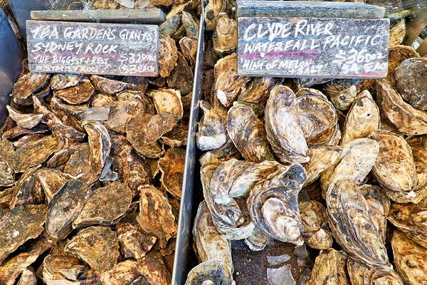 Fresh Sydney Rock and Clyde River oysters are displayed for sale at a market in Australia. The oysters are priced per dozen and per each.