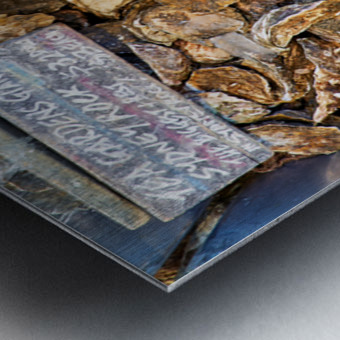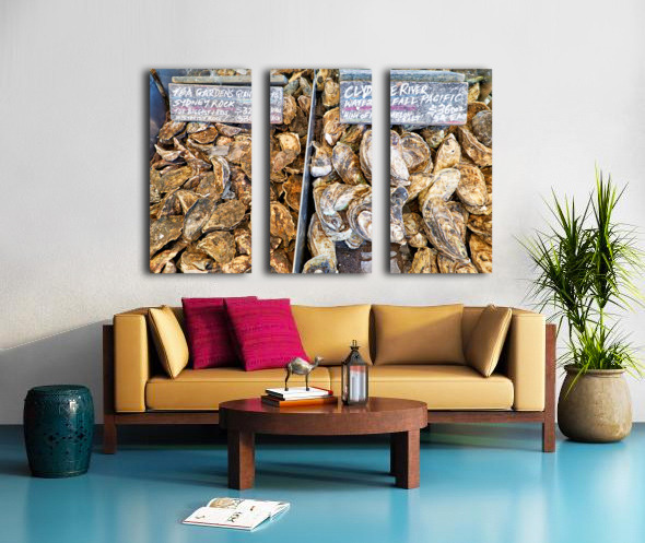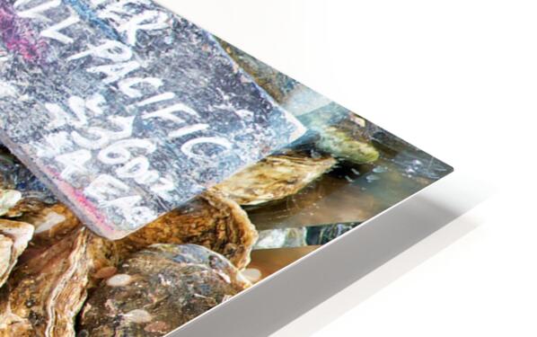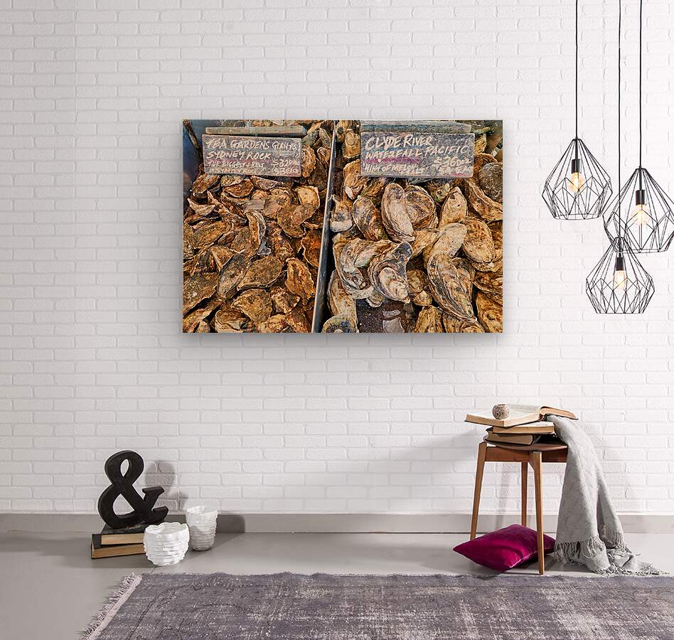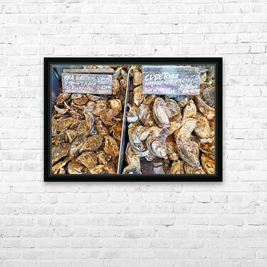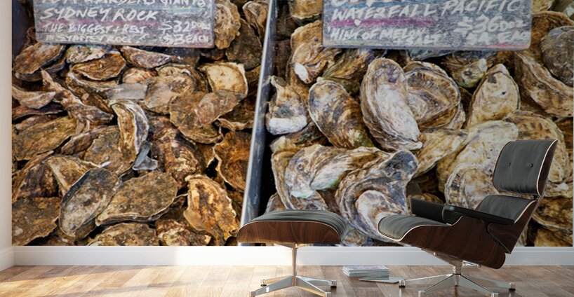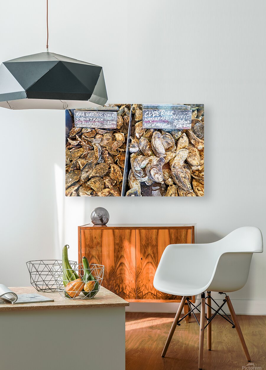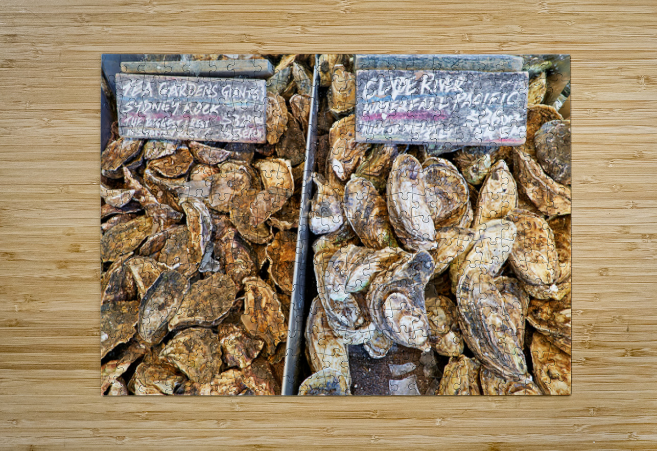Fresh Sydney Rock and Clyde River oysters are displayed for sale at a market in Australia. The oysters are priced per dozen and per each.