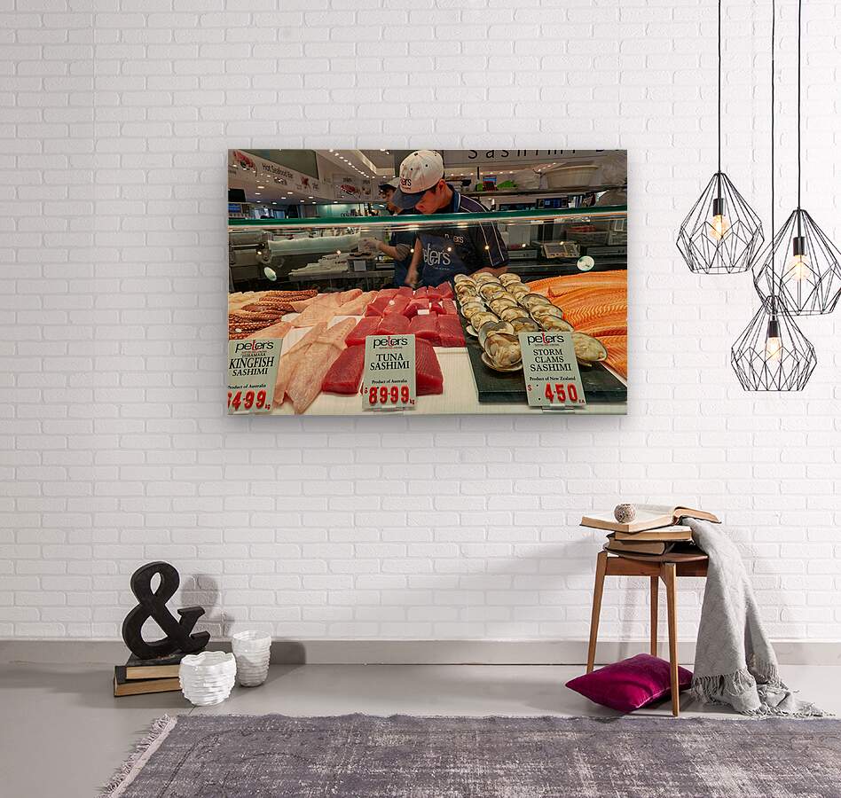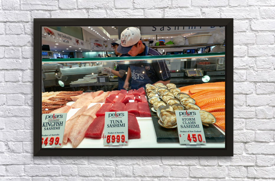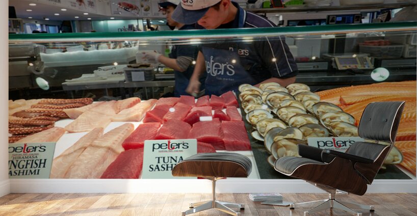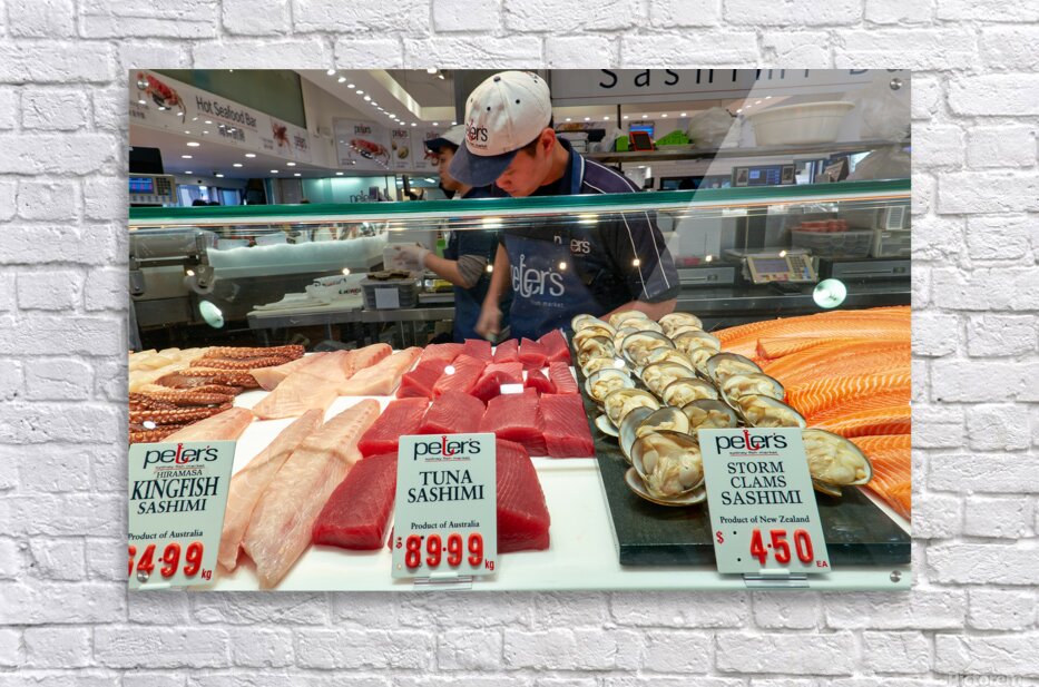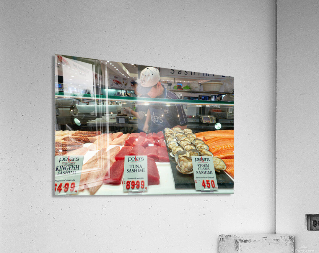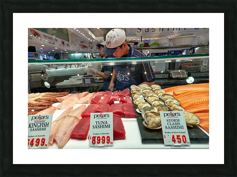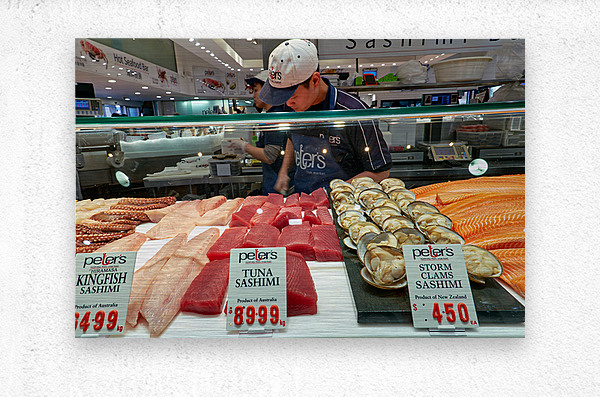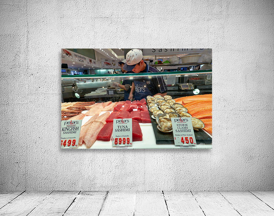 A fishmonger at Peters Sydney Fish Market prepares sashimi for customers. The display features Kingfish Tuna Storm Clams and Salmon.