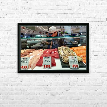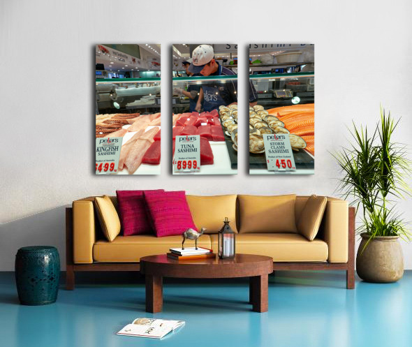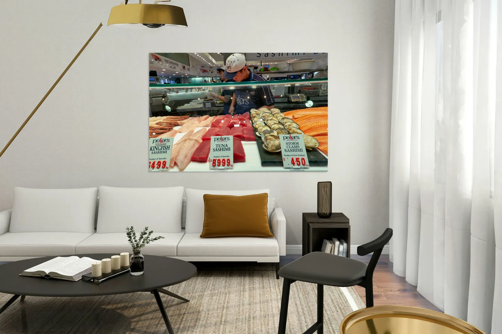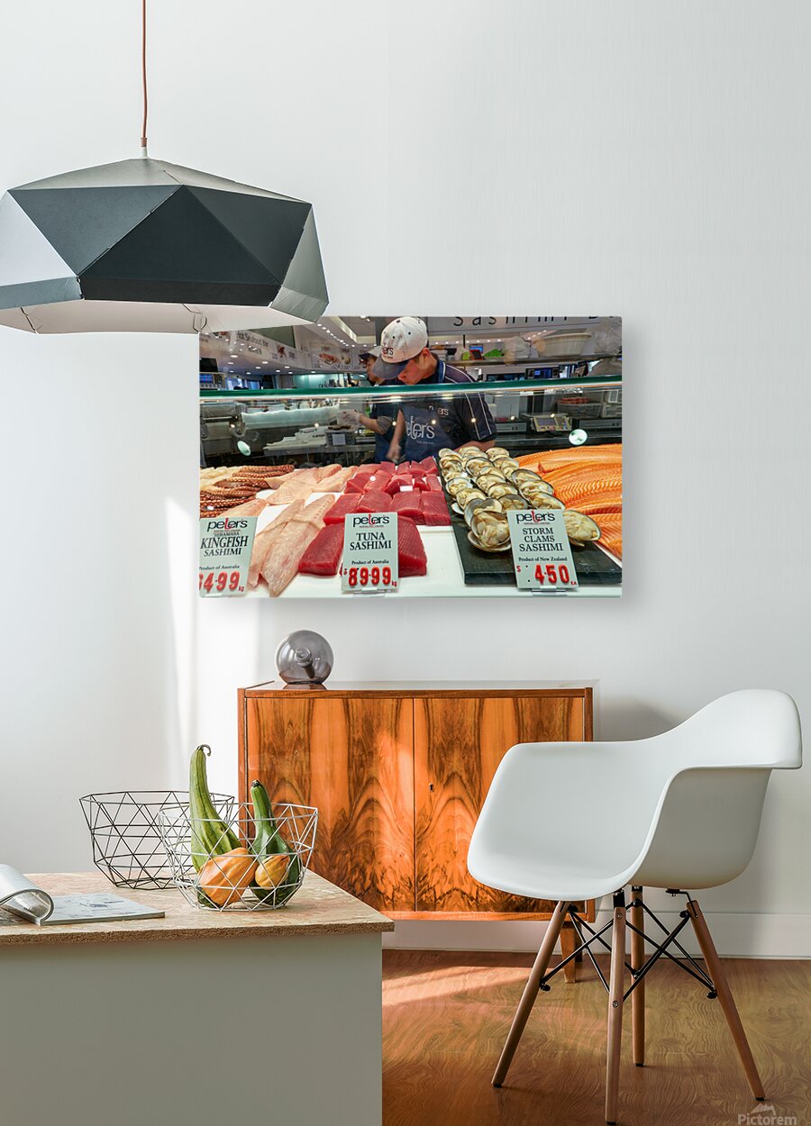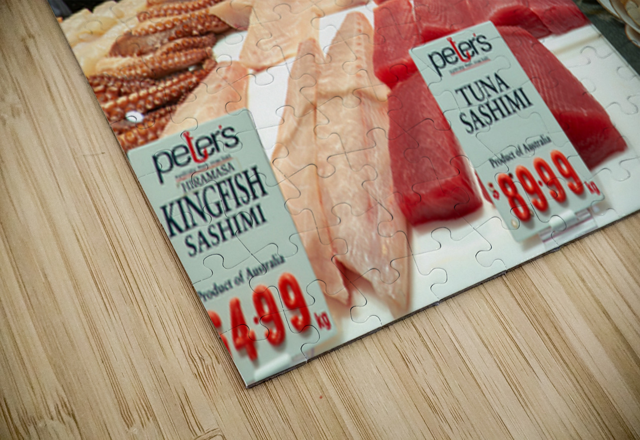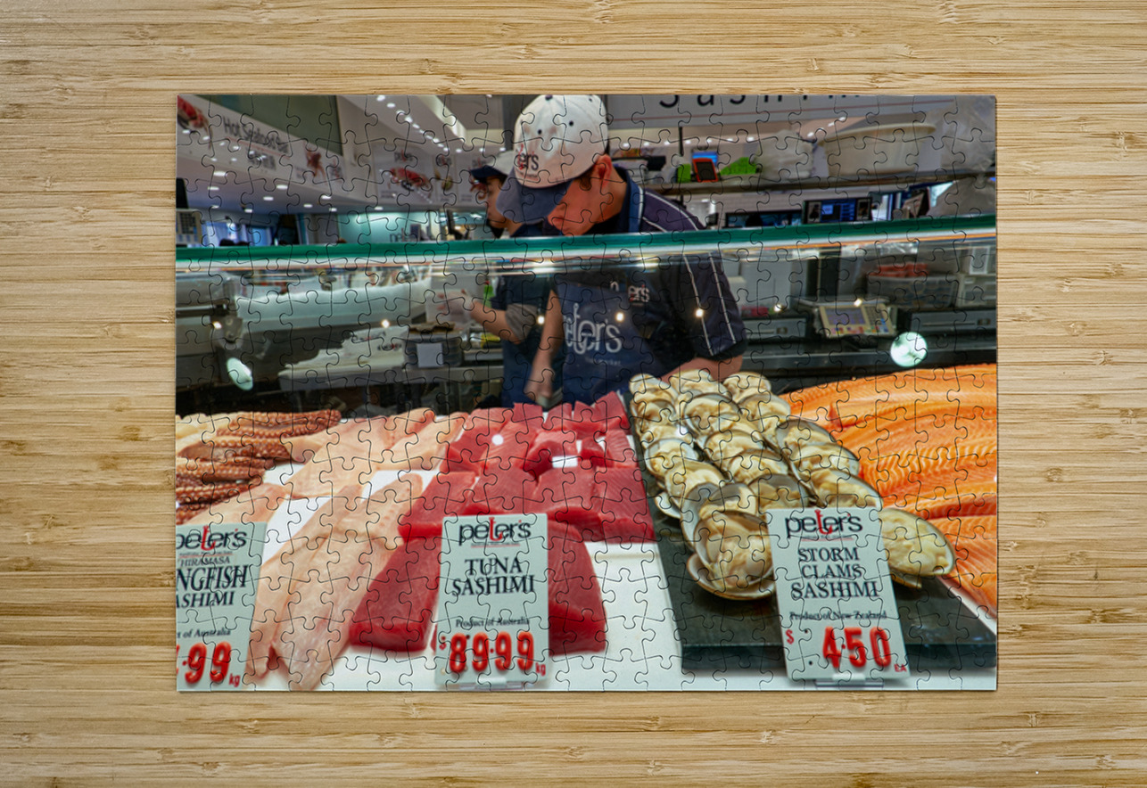 A fishmonger at Peters Sydney Fish Market prepares sashimi for customers. The display features Kingfish Tuna Storm Clams and Salmon.