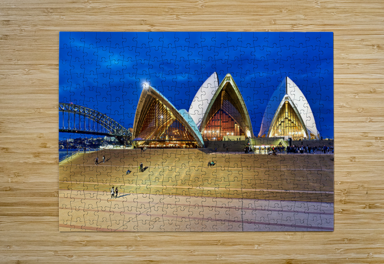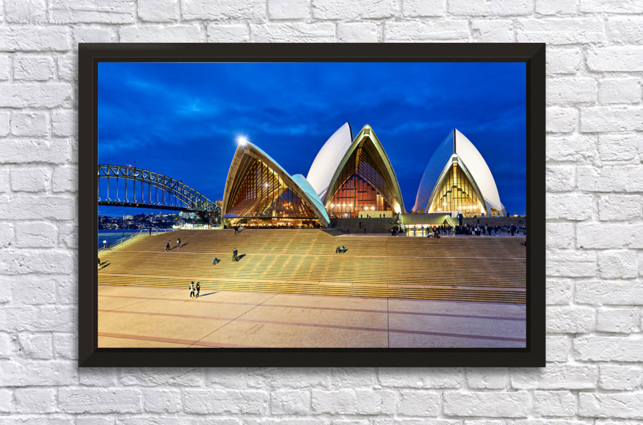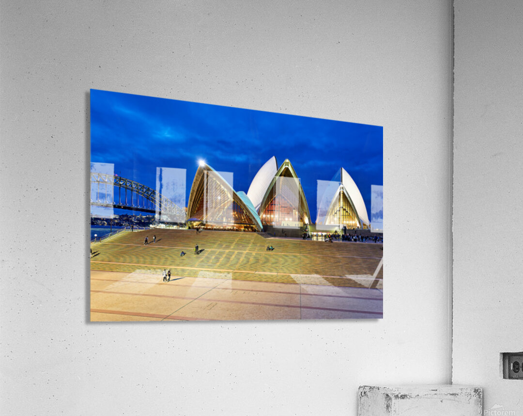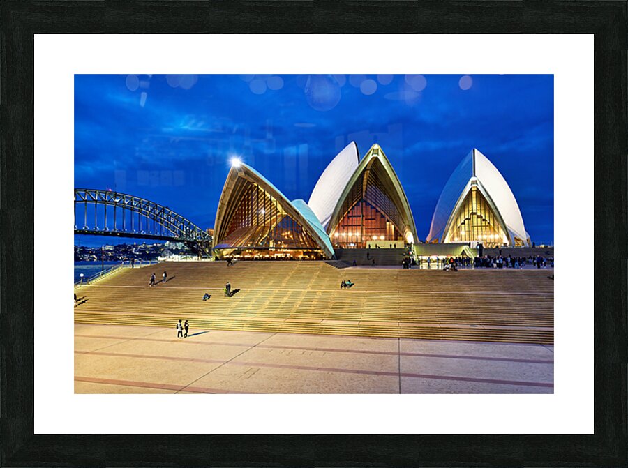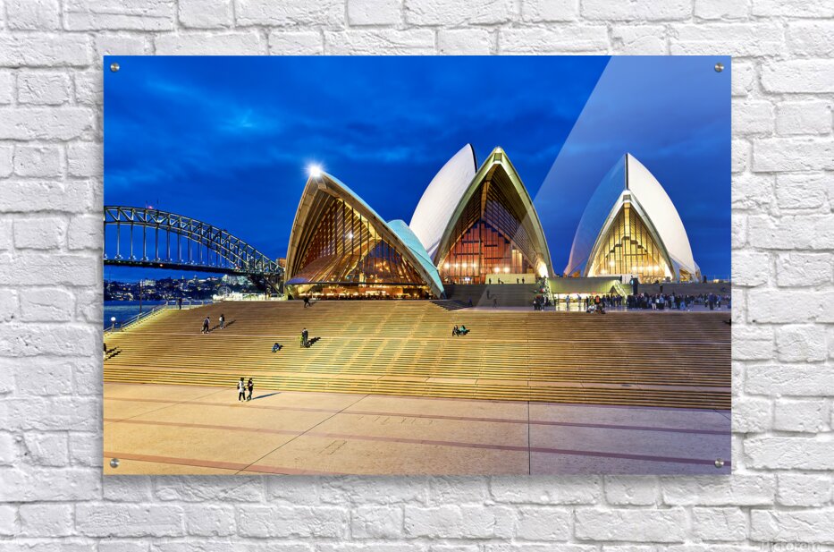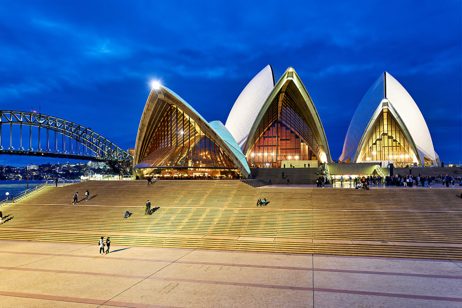 Sydney Opera House and Harbour Bridge at dusk Australia. People are seen walking on the steps and enjoying the view.