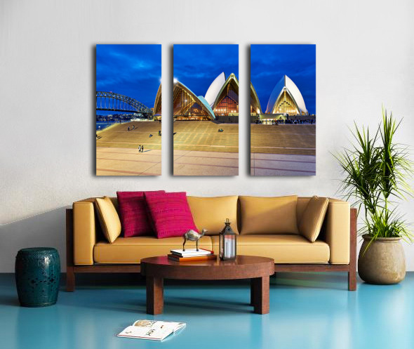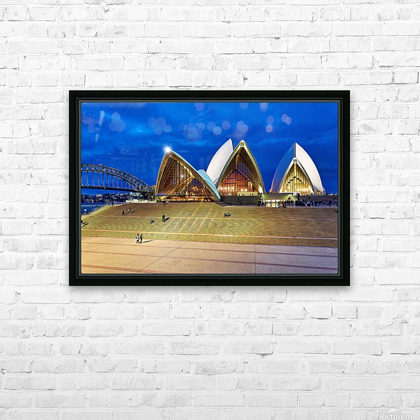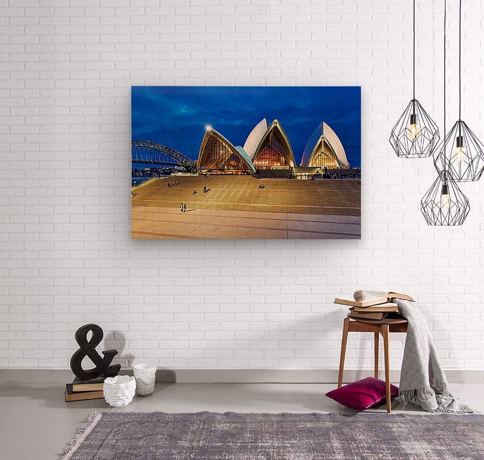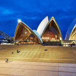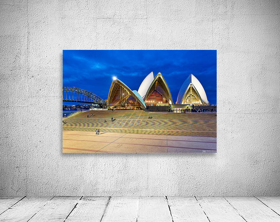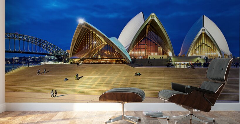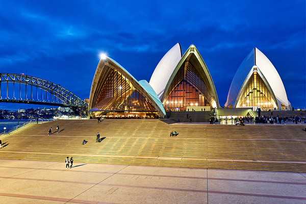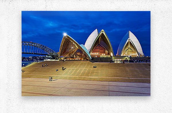 Sydney Opera House and Harbour Bridge at dusk Australia. People are seen walking on the steps and enjoying the view.