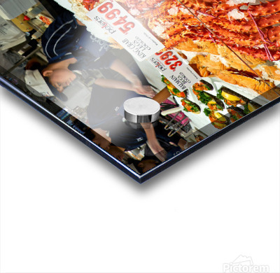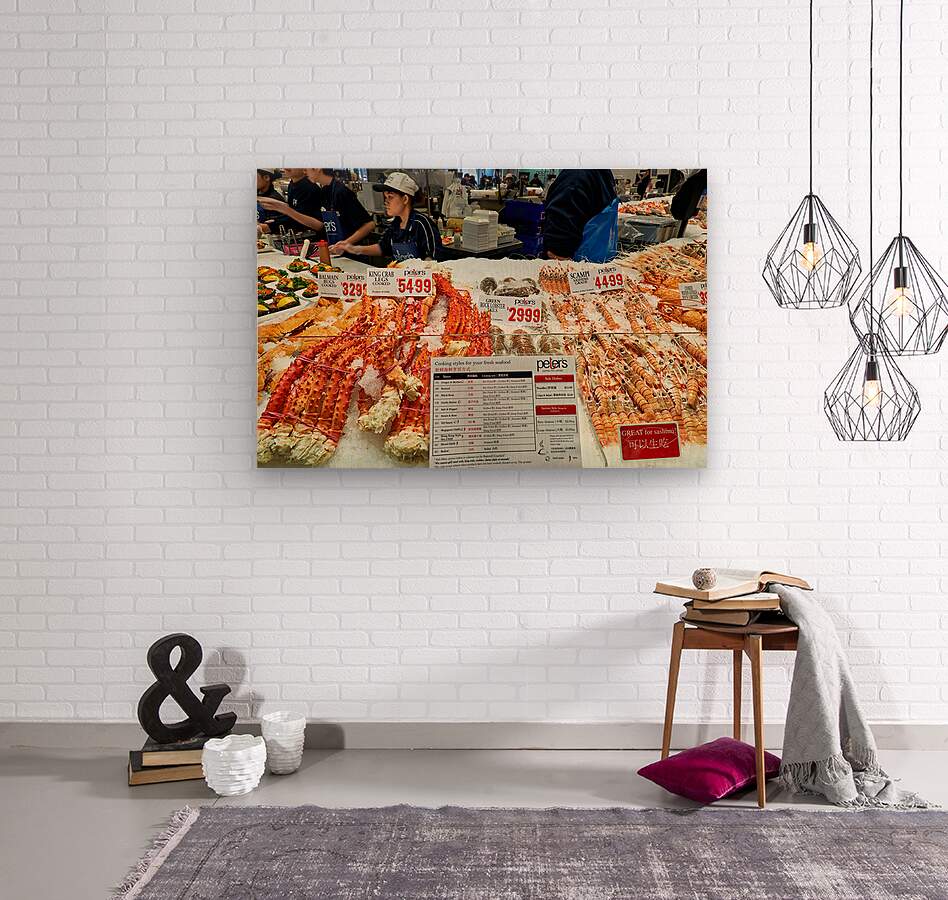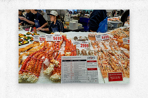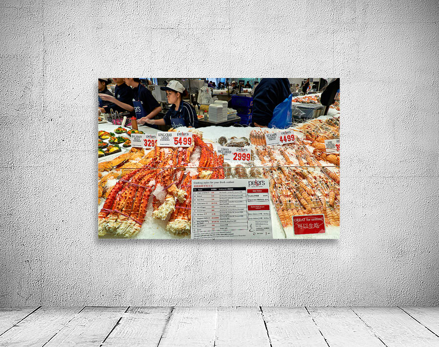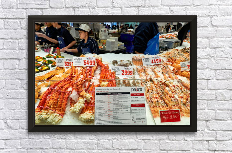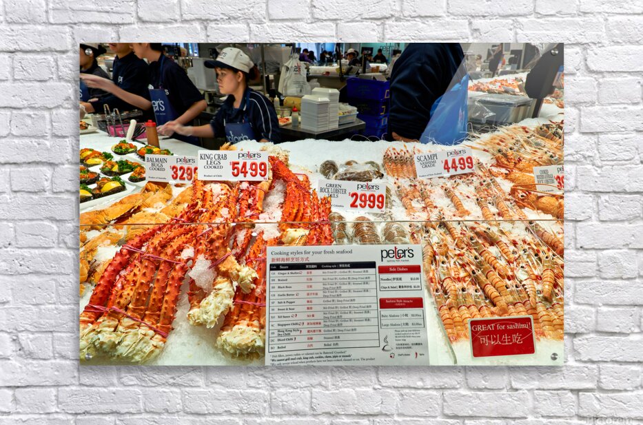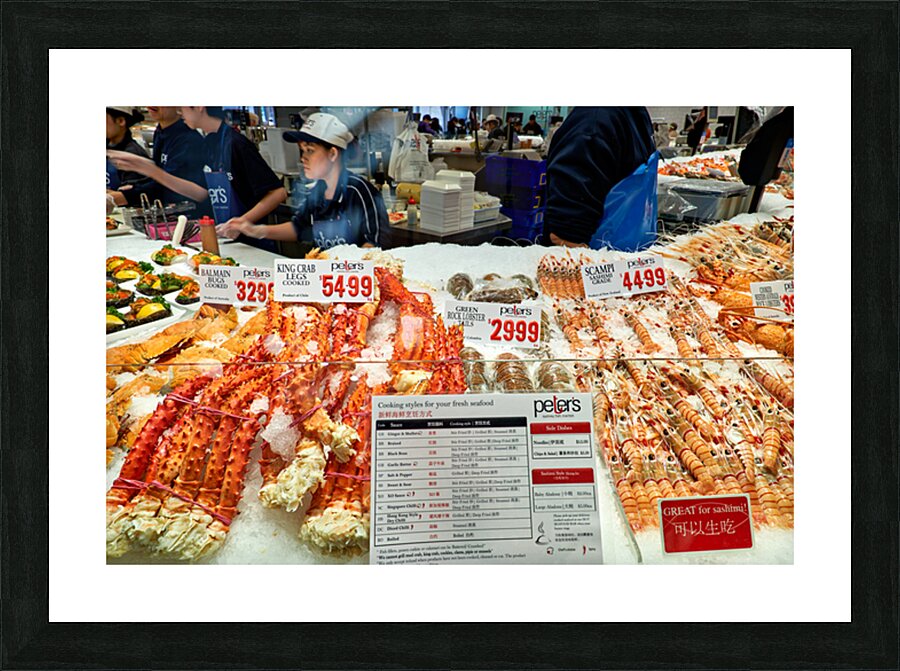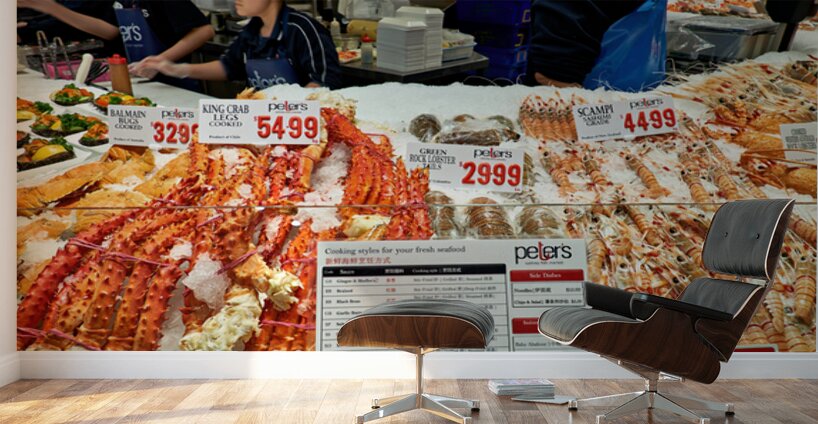 Sydney Fish Market staff serve customers with fresh seafood including king crab legs scampi and lobsters. The market offers various cooking styles and