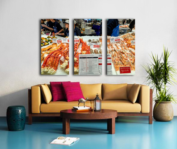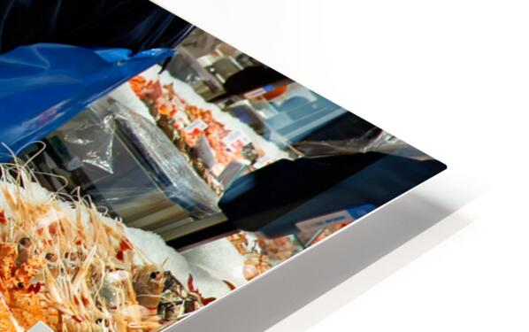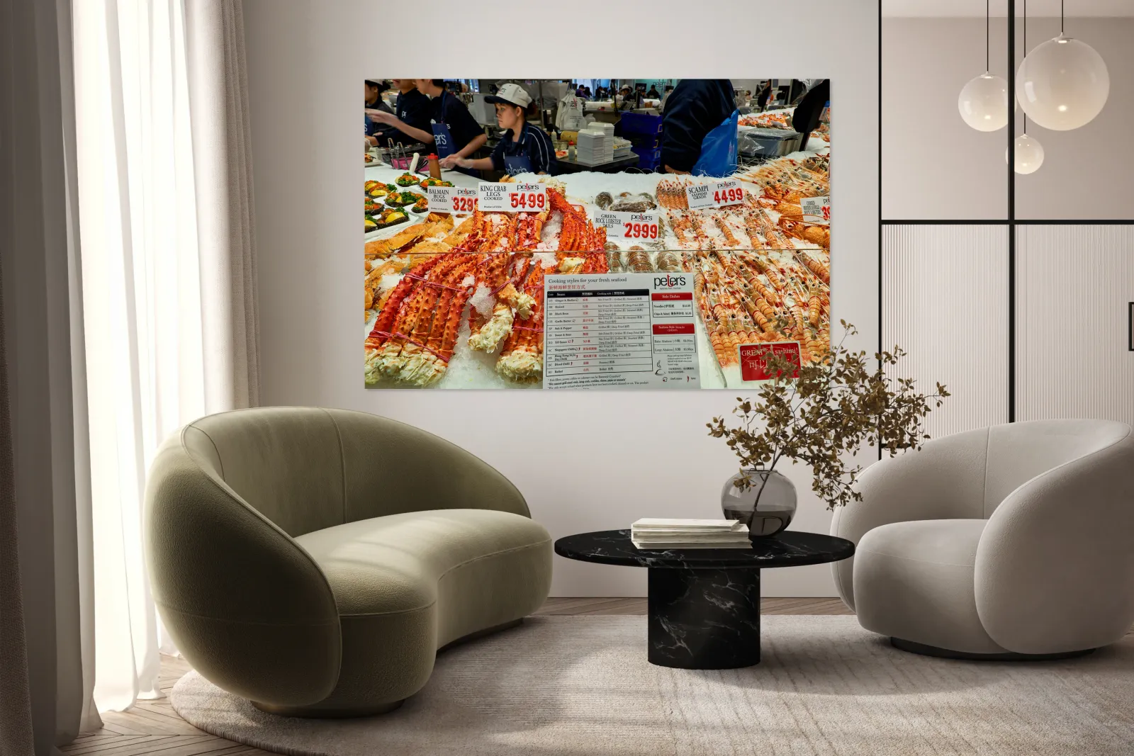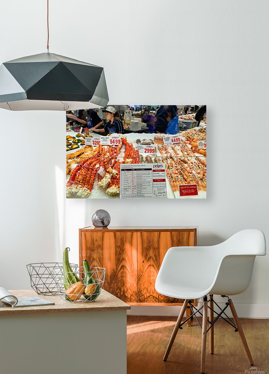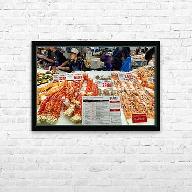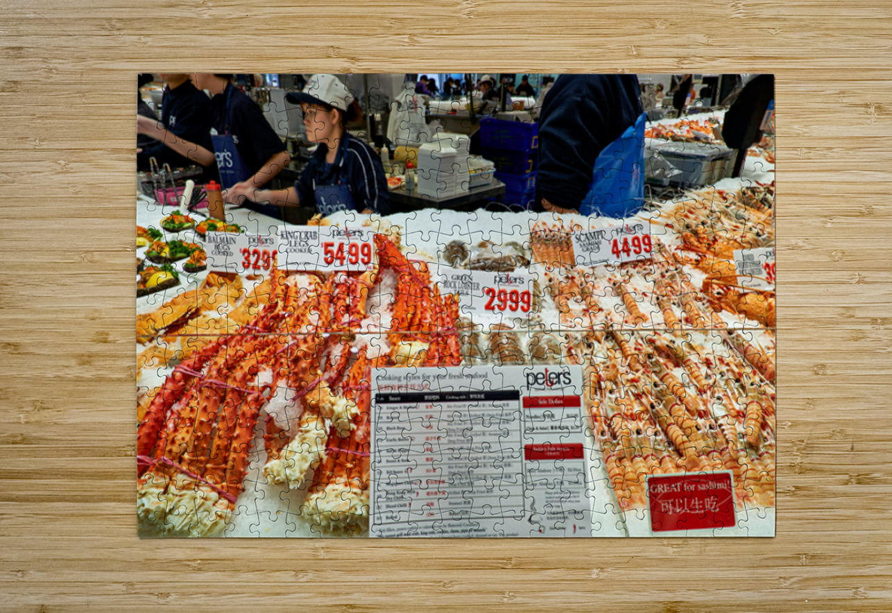 Sydney Fish Market staff serve customers with fresh seafood including king crab legs scampi and lobsters. The market offers various cooking styles and