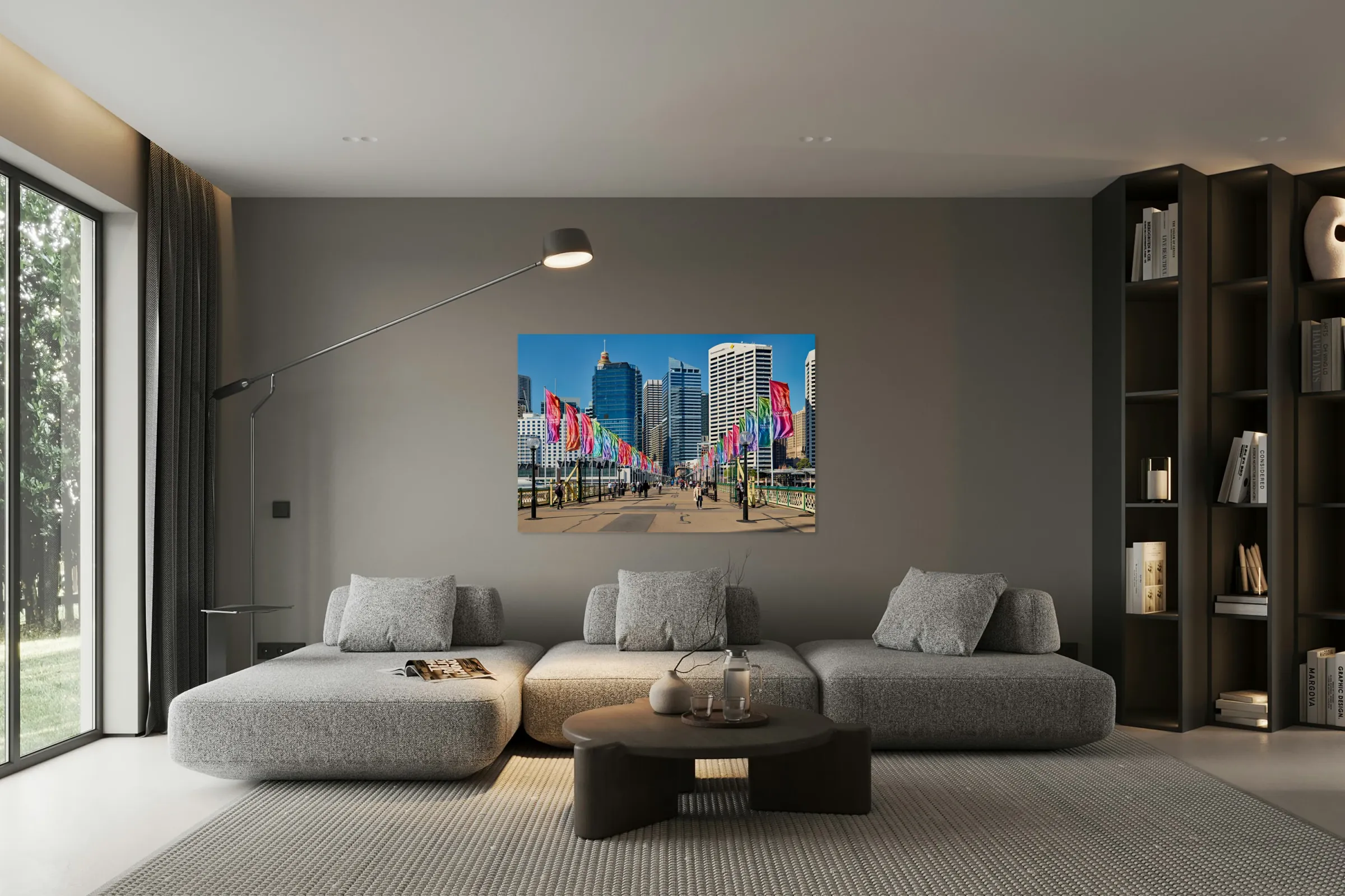 Colorful flags line bridge in Darling Harbour Sydney on a sunny  Picture Frame Printing