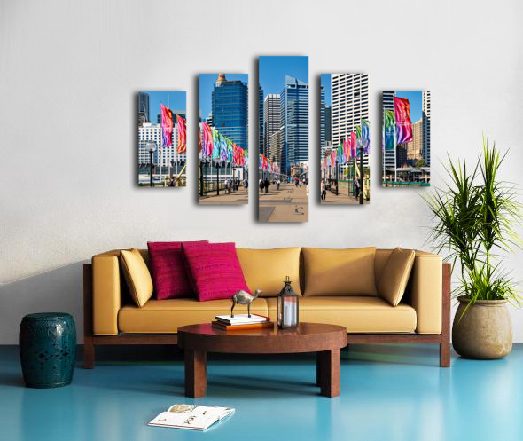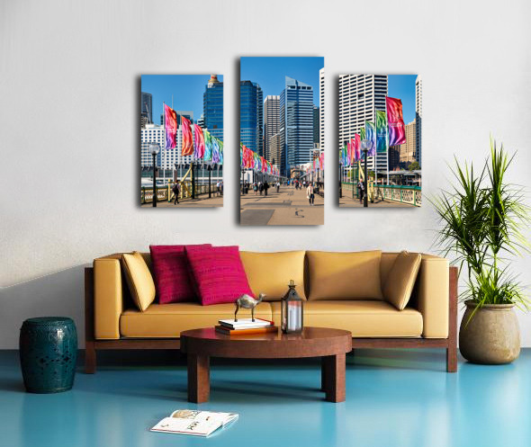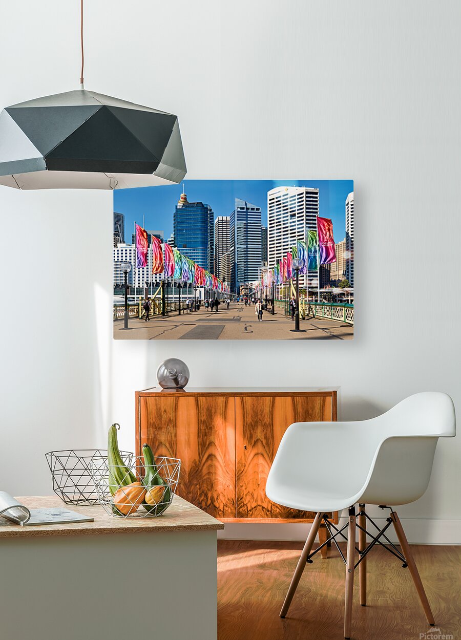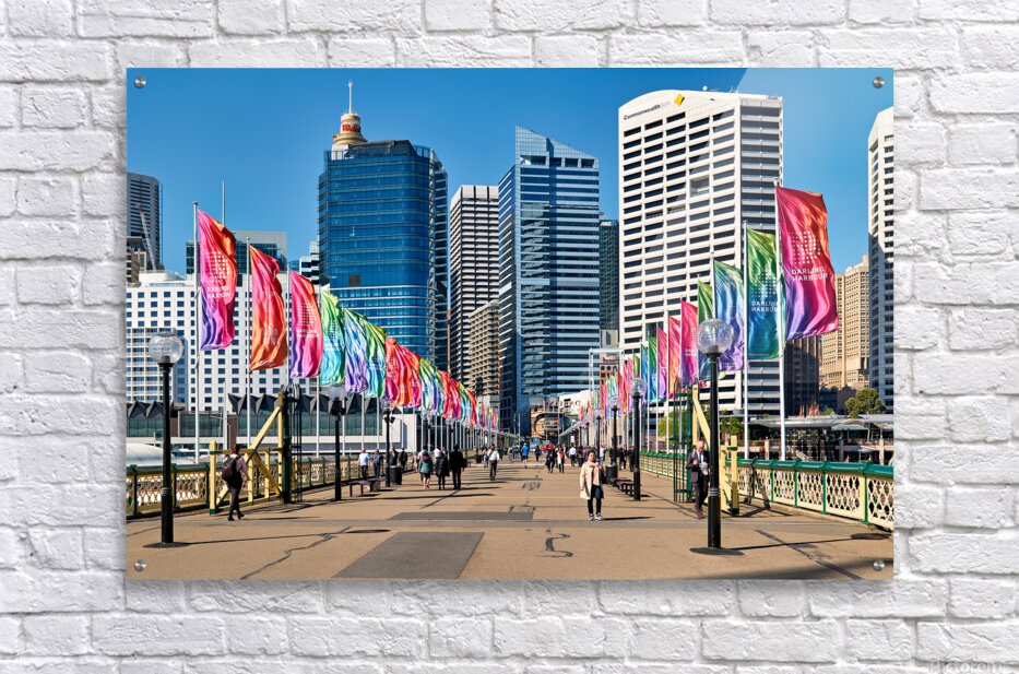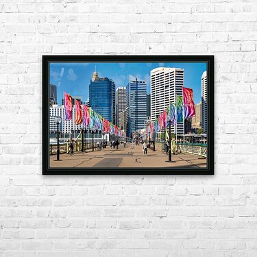 Get this artwork "Colorful flags line bridge in Darling Harbour Sydney on a sunny " in a framed print.
