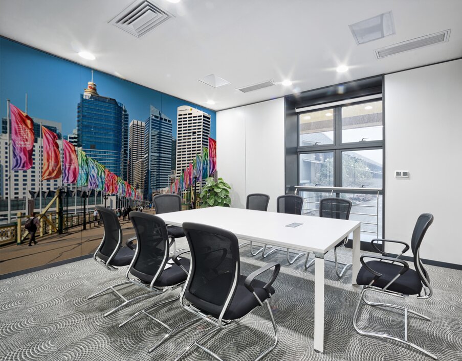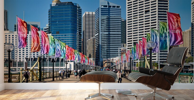 People walk on a bridge with colorful flags in Darling Harbour. Tall buildings stand in the background. It is a sunny day in Sydney.