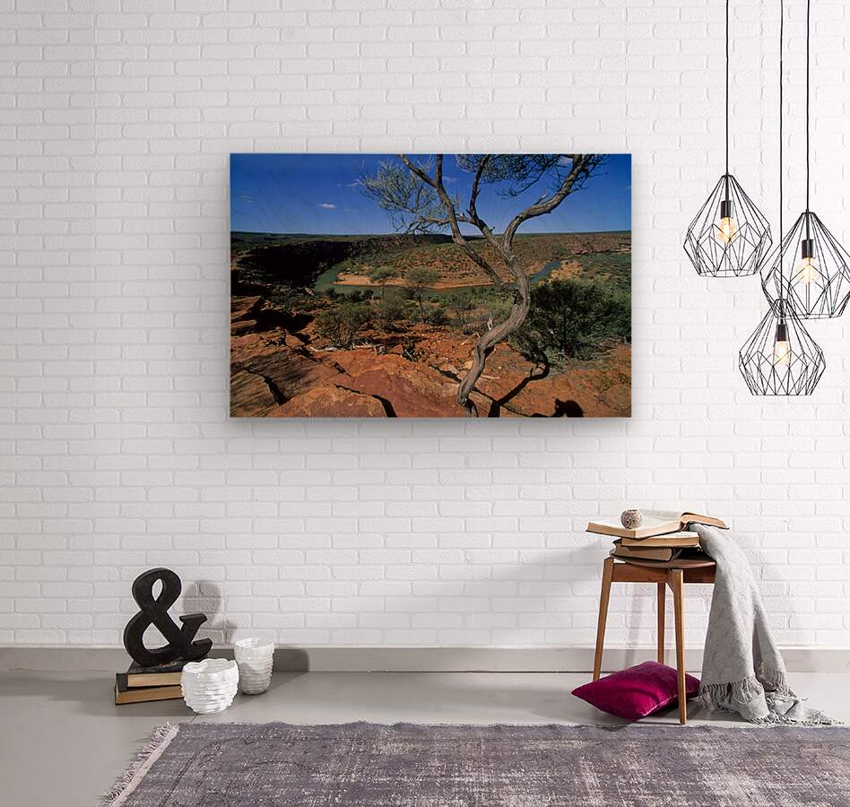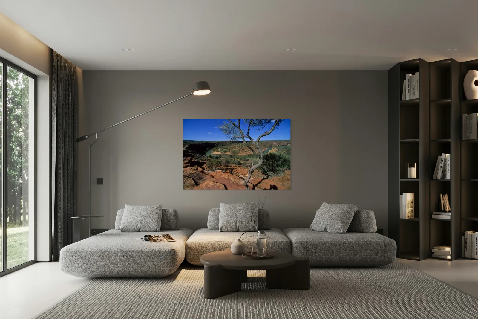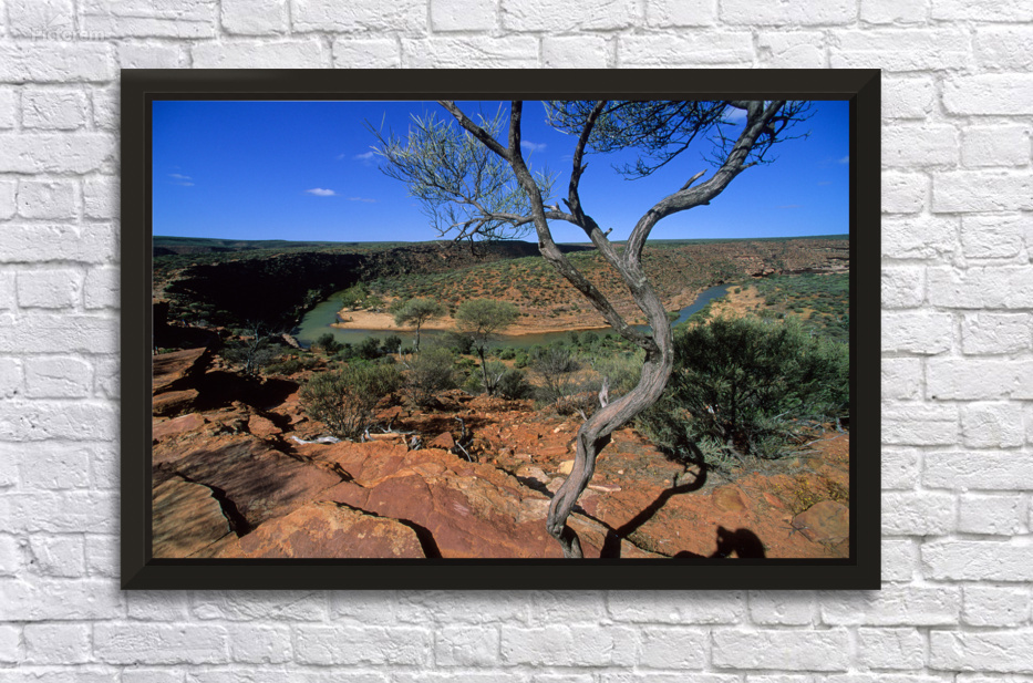 "A gnarled tree overlooks a river in a vast canyon." in a framed print.