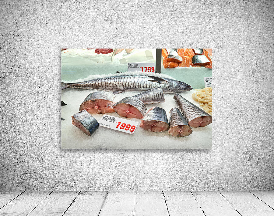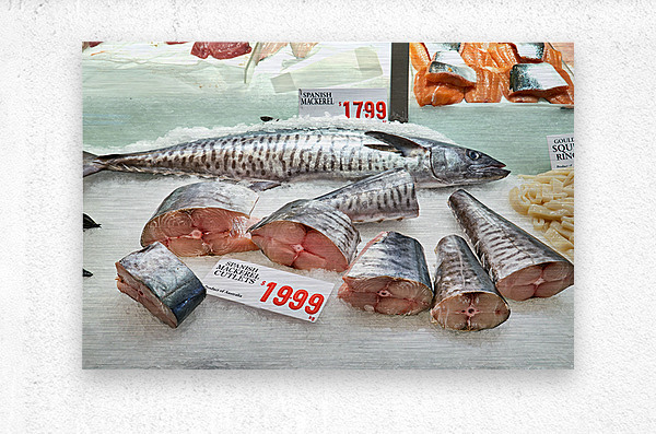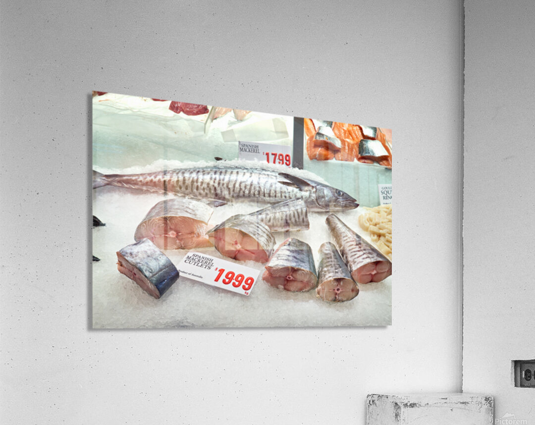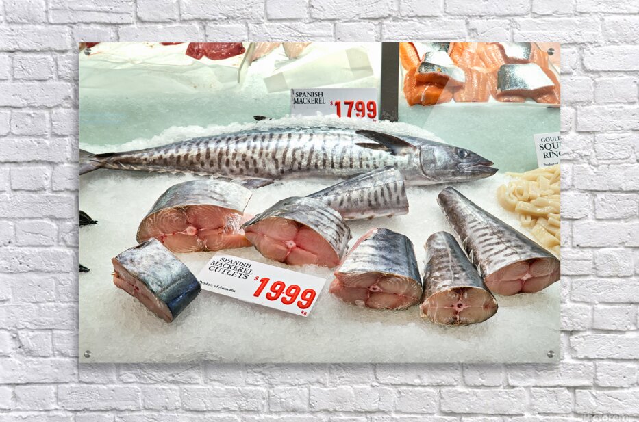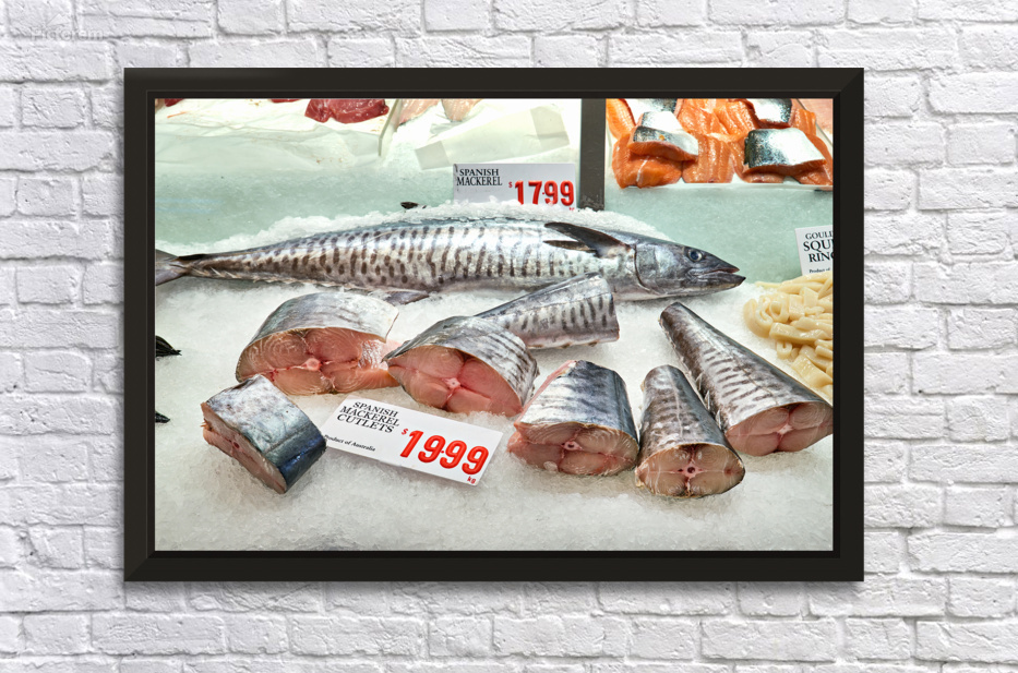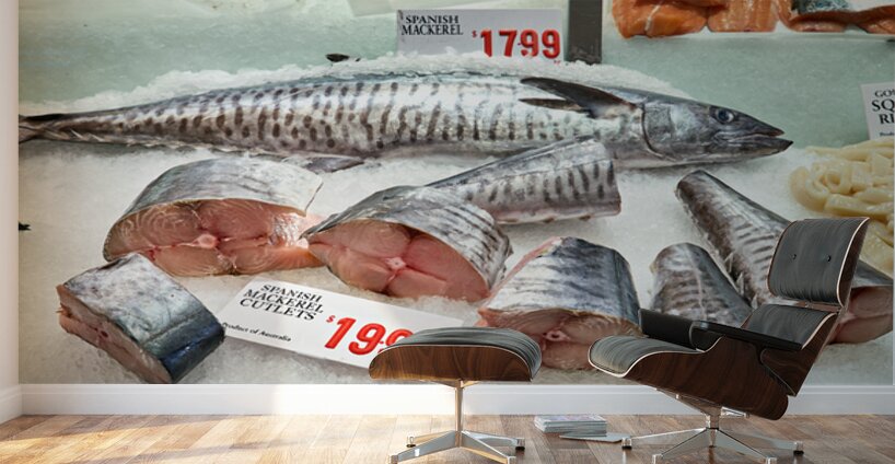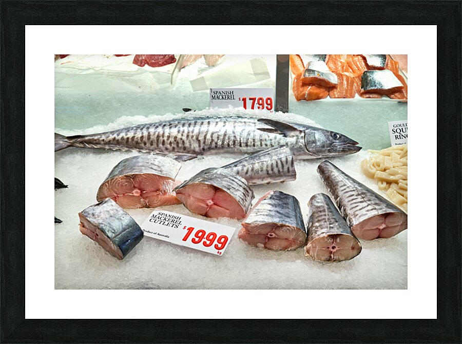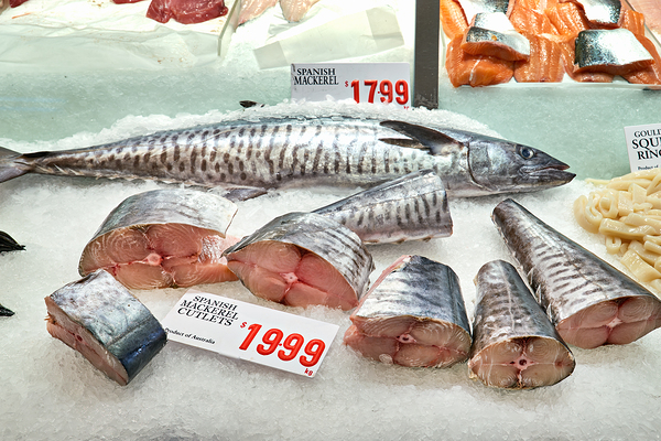 Spanish Mackerel cutlets are displayed on ice at a fish market in Australia. The fish is priced at $19.99 per kg.