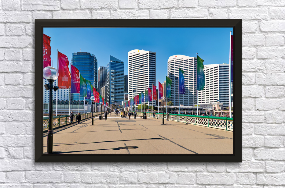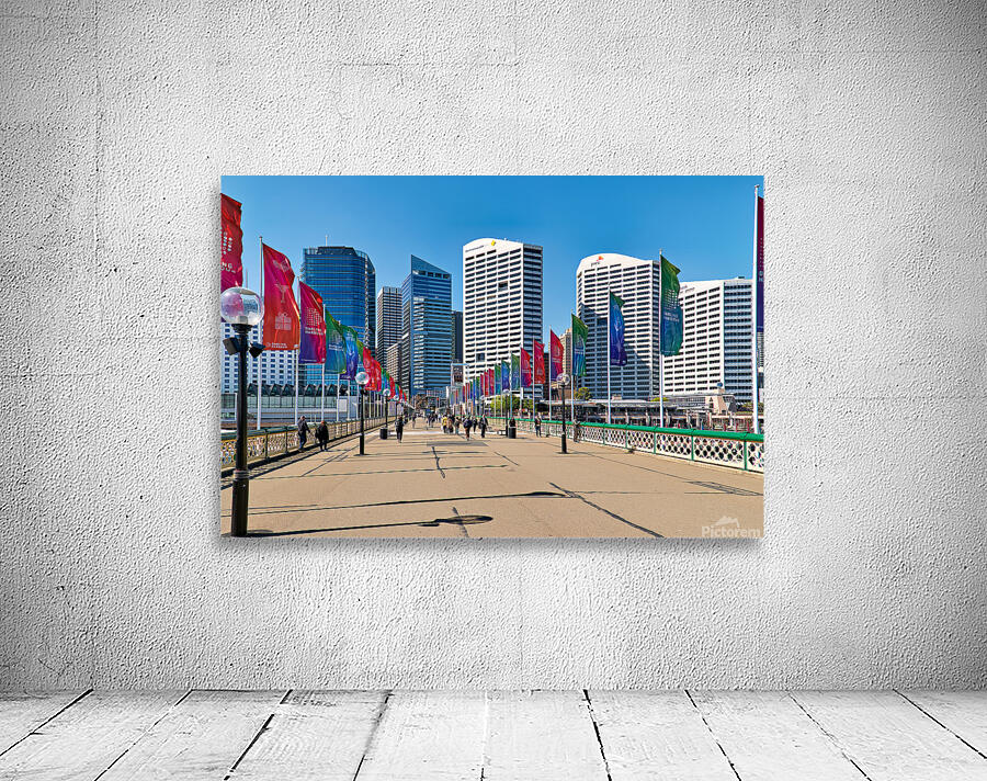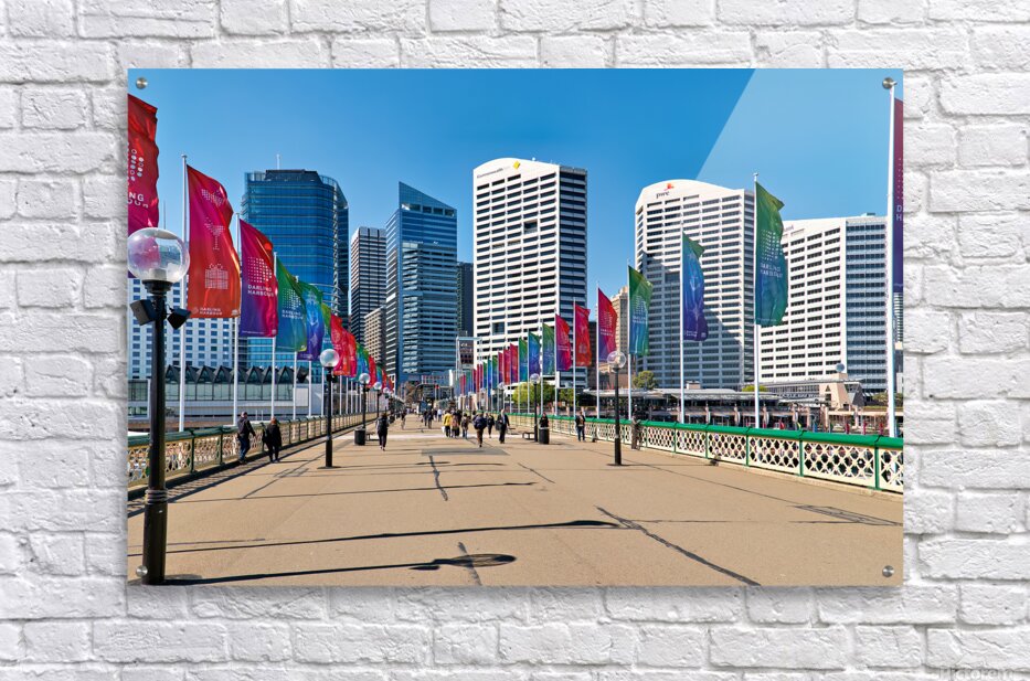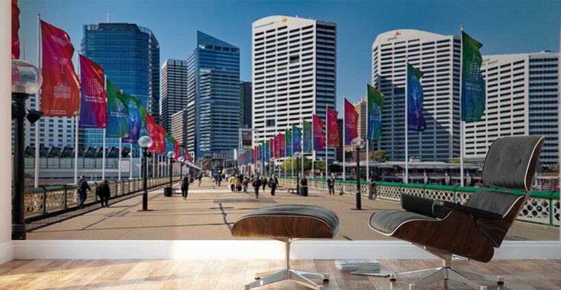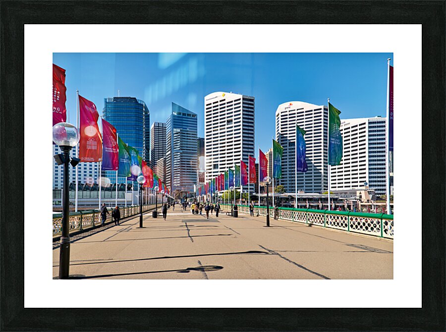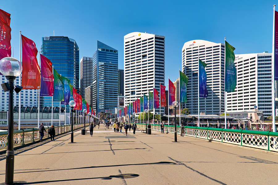 Sydney Australia - People walk across a bridge adorned with colorful flags in Darling Harbour a vibrant waterfront precinct.