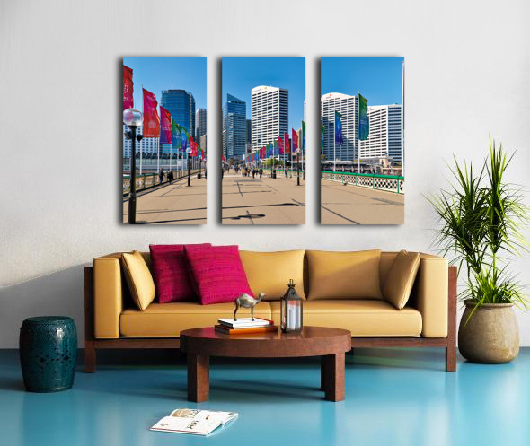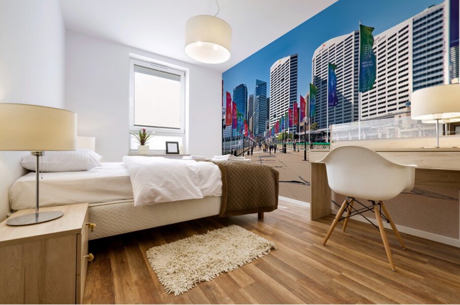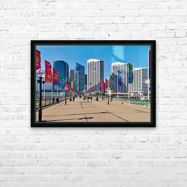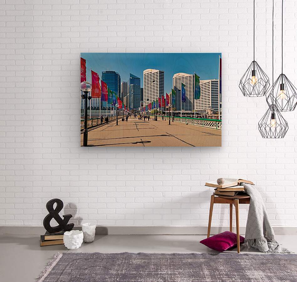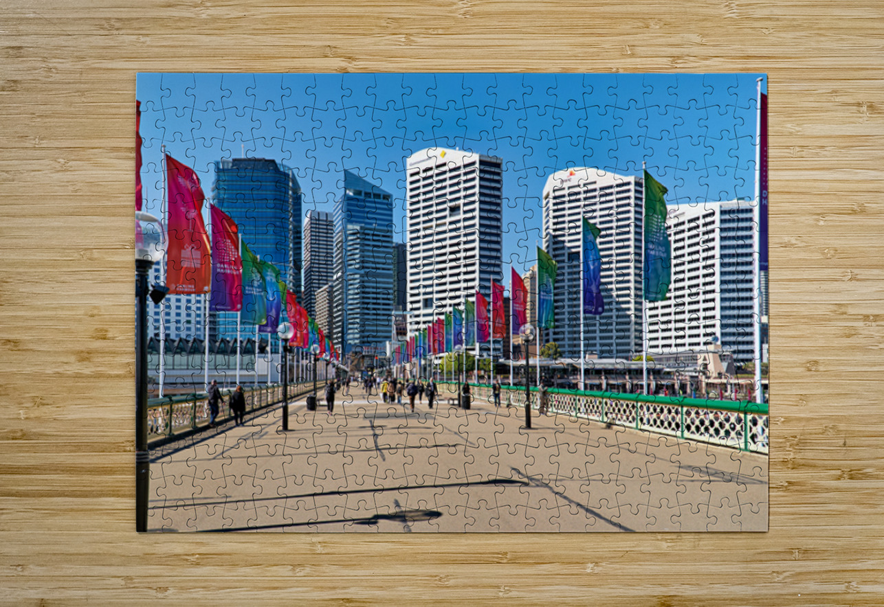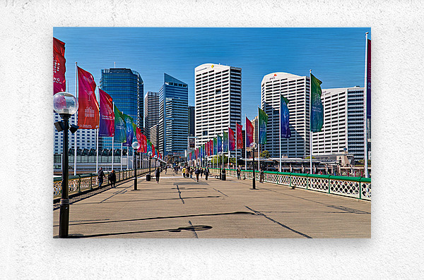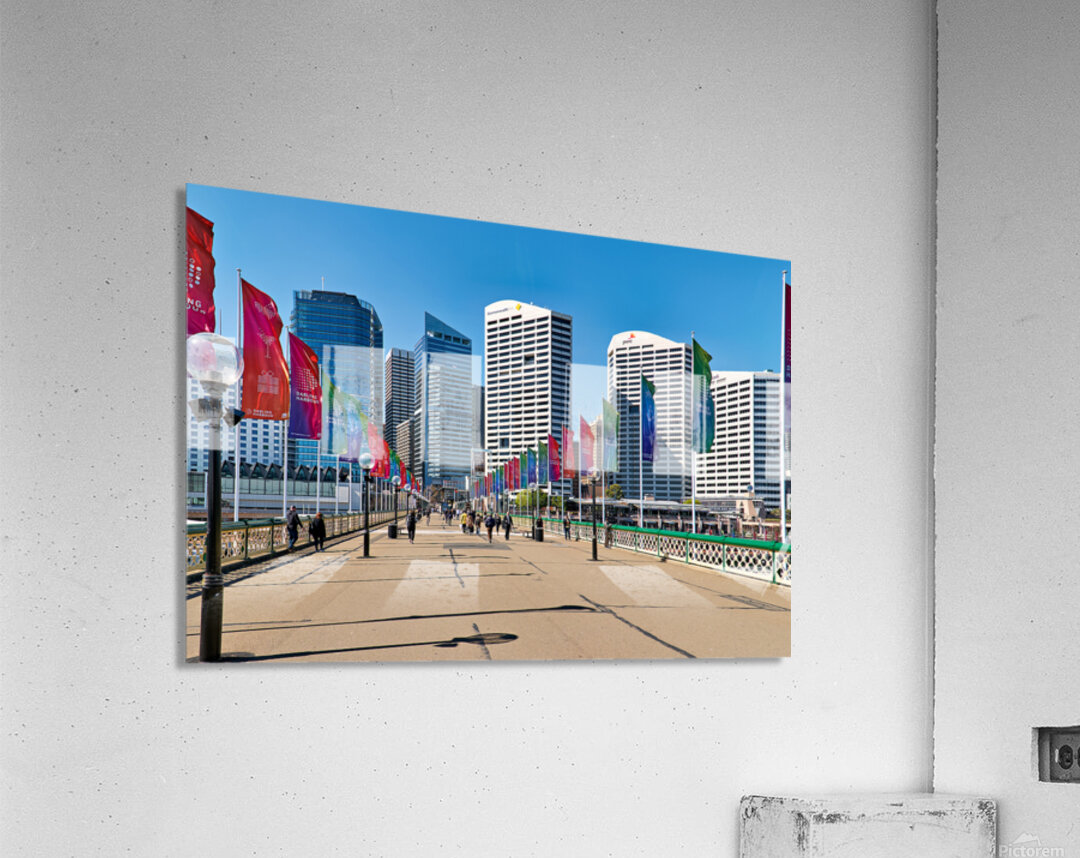 Sydney Australia - People walk across a bridge adorned with colorful flags in Darling Harbour a vibrant waterfront precinct.