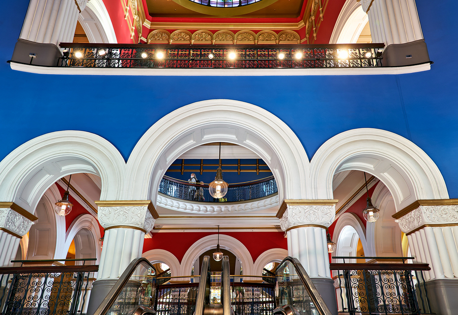 People walk through the grand escalators inside Queen Victoria Building. The structure features large arches and colorful walls.