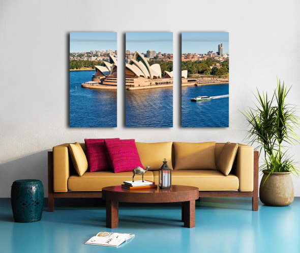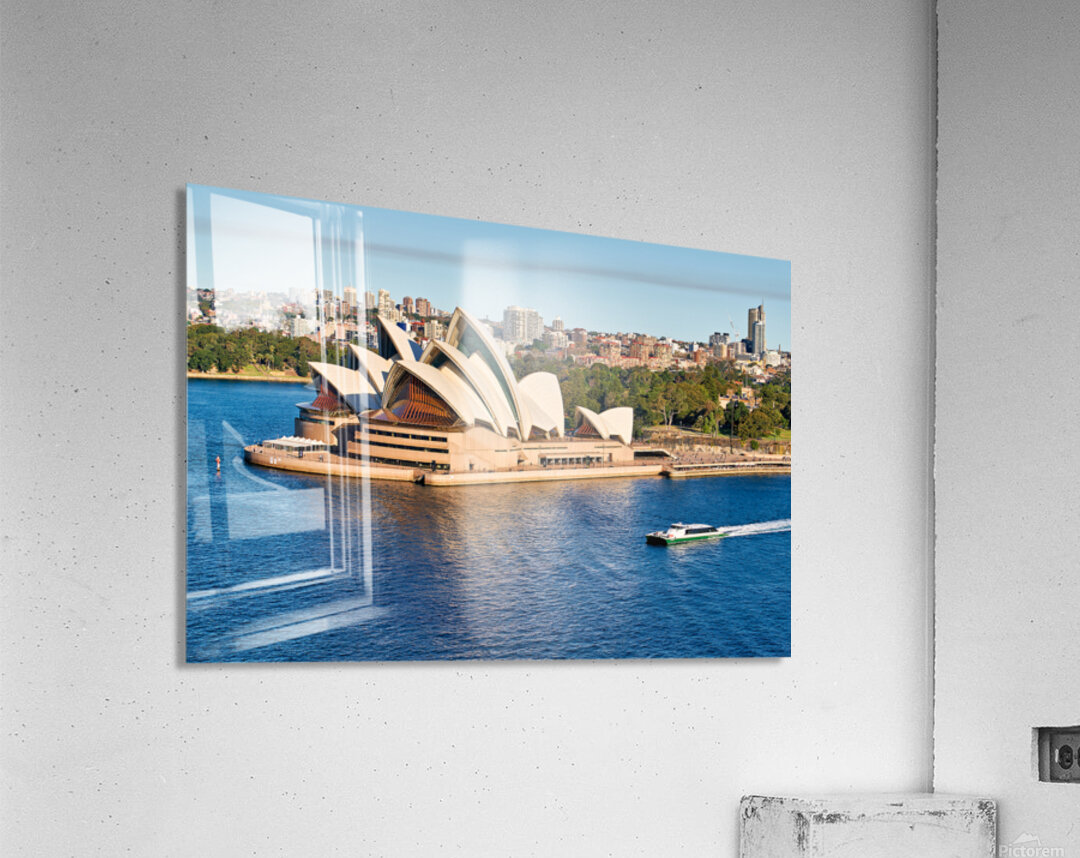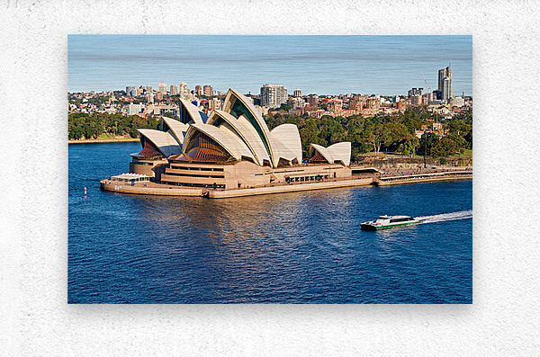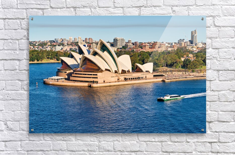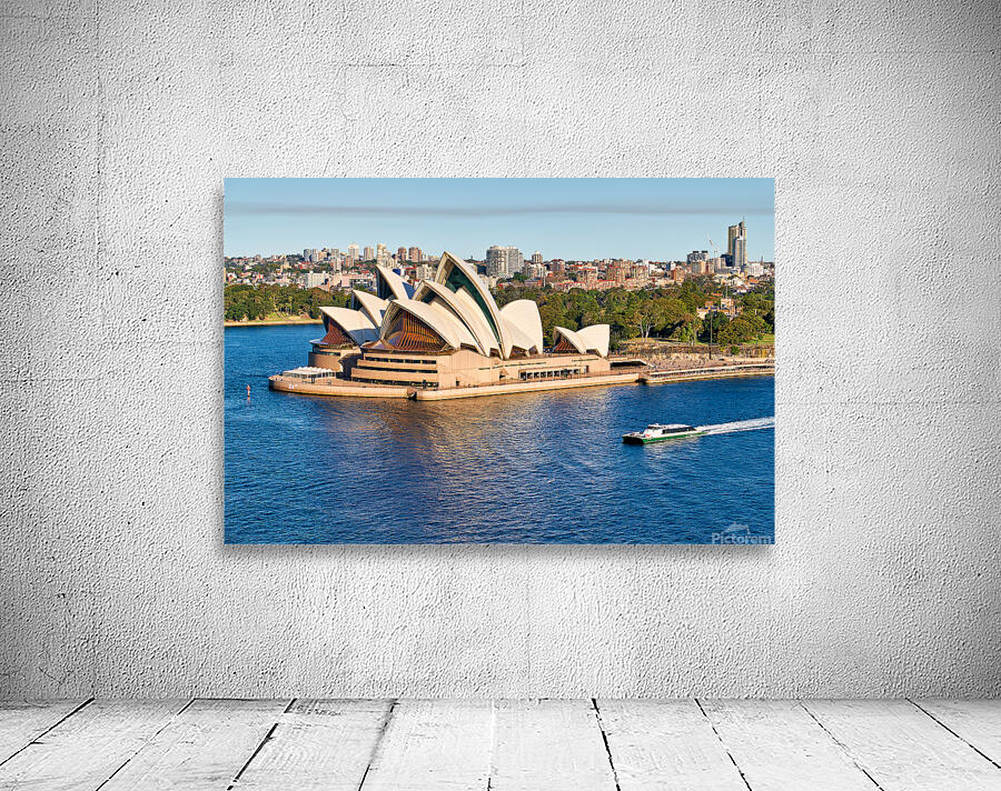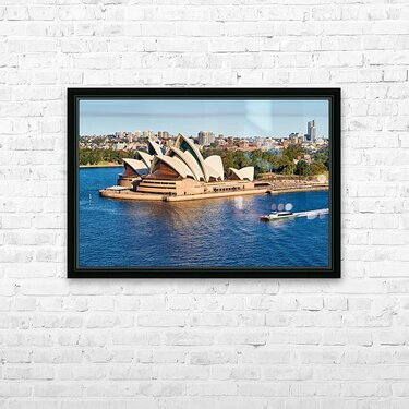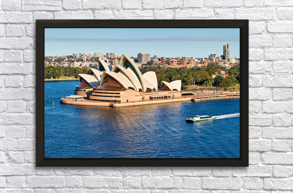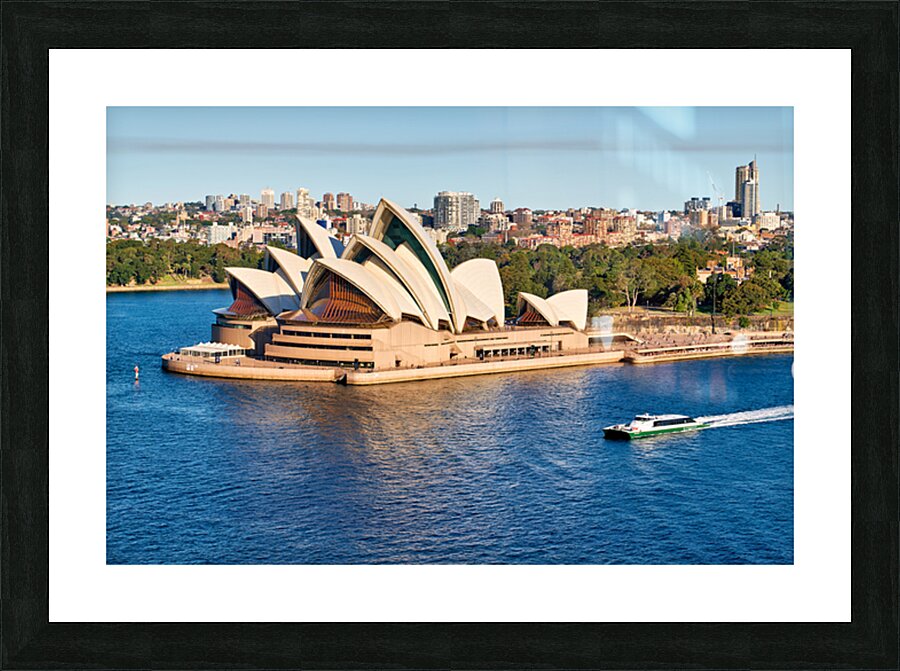 "Sydney Opera House and harbor with ferry boat." in a framed print.