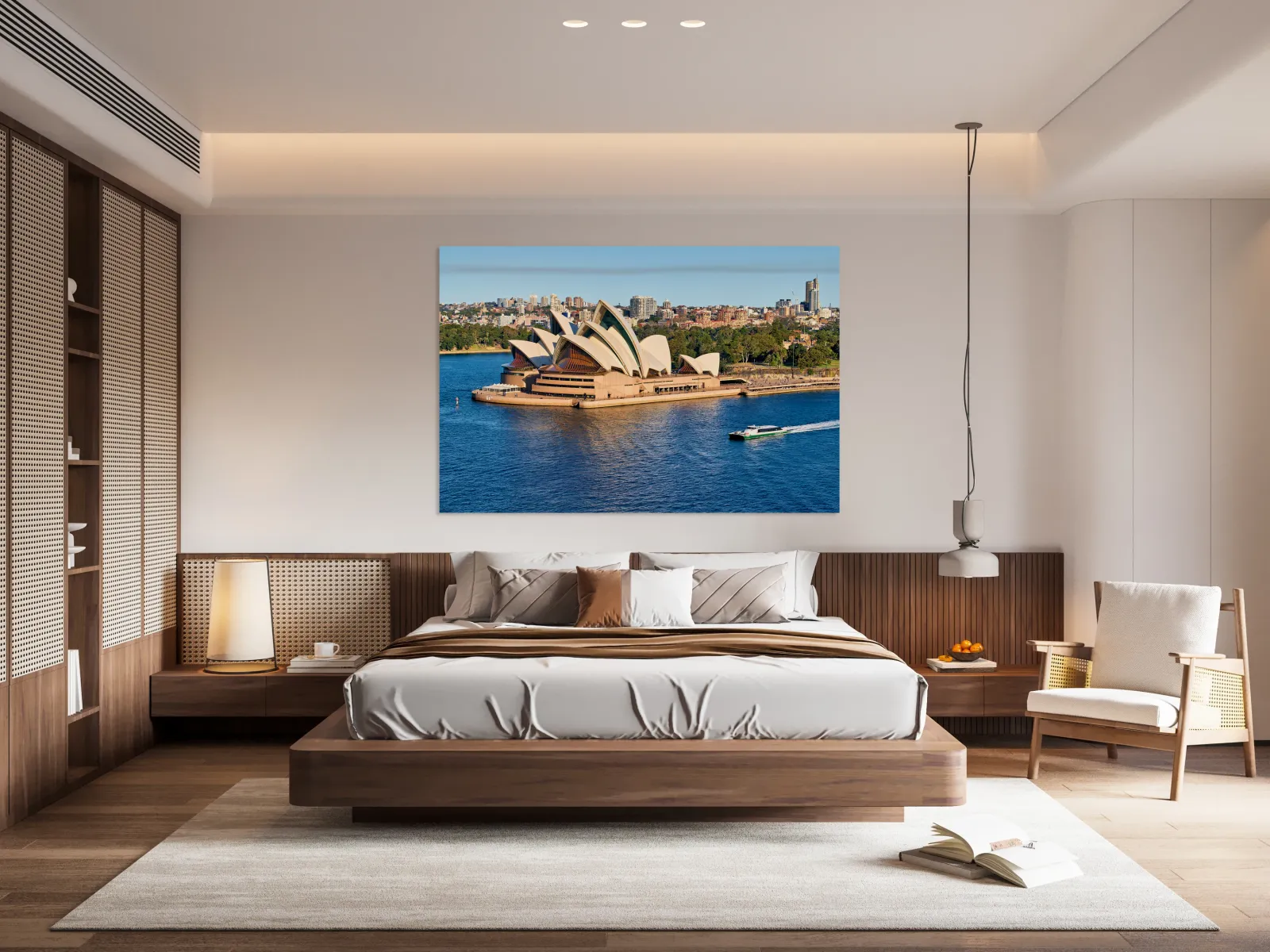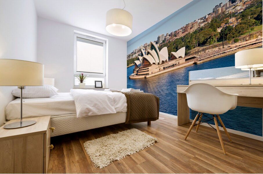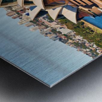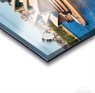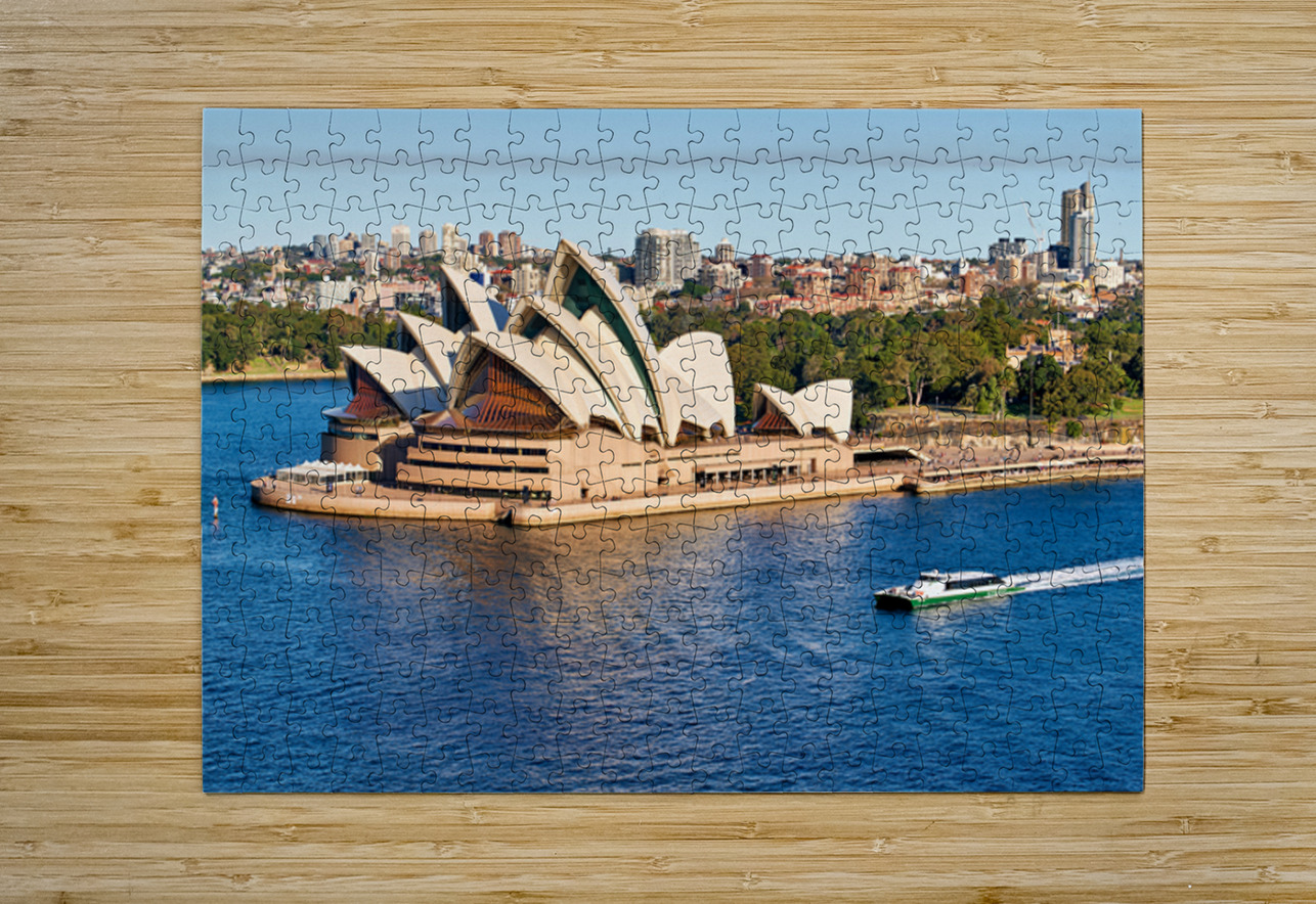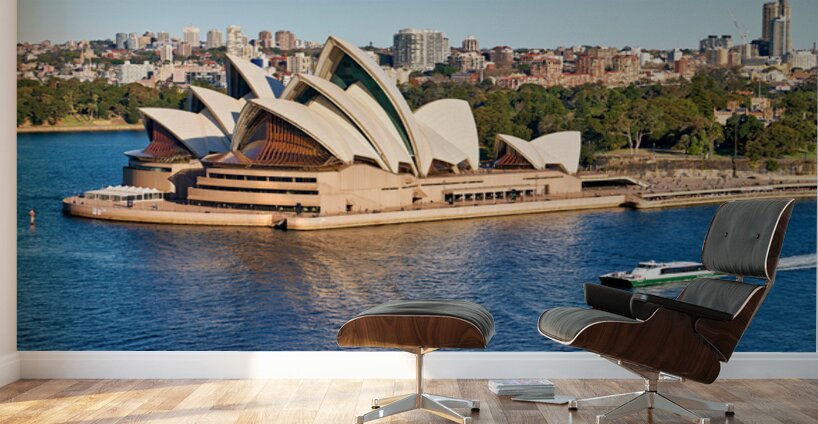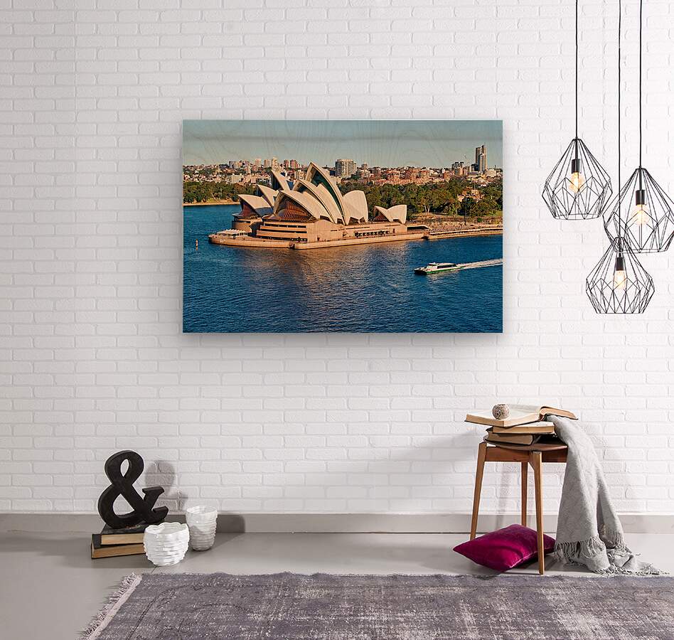 "Sydney Opera House and harbor with ferry boat." in a framed print.