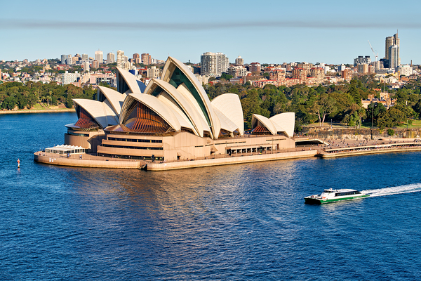 Sydney Opera House Australia. A ferry boat sails across the blue water in front of the iconic landmark on a sunny day.