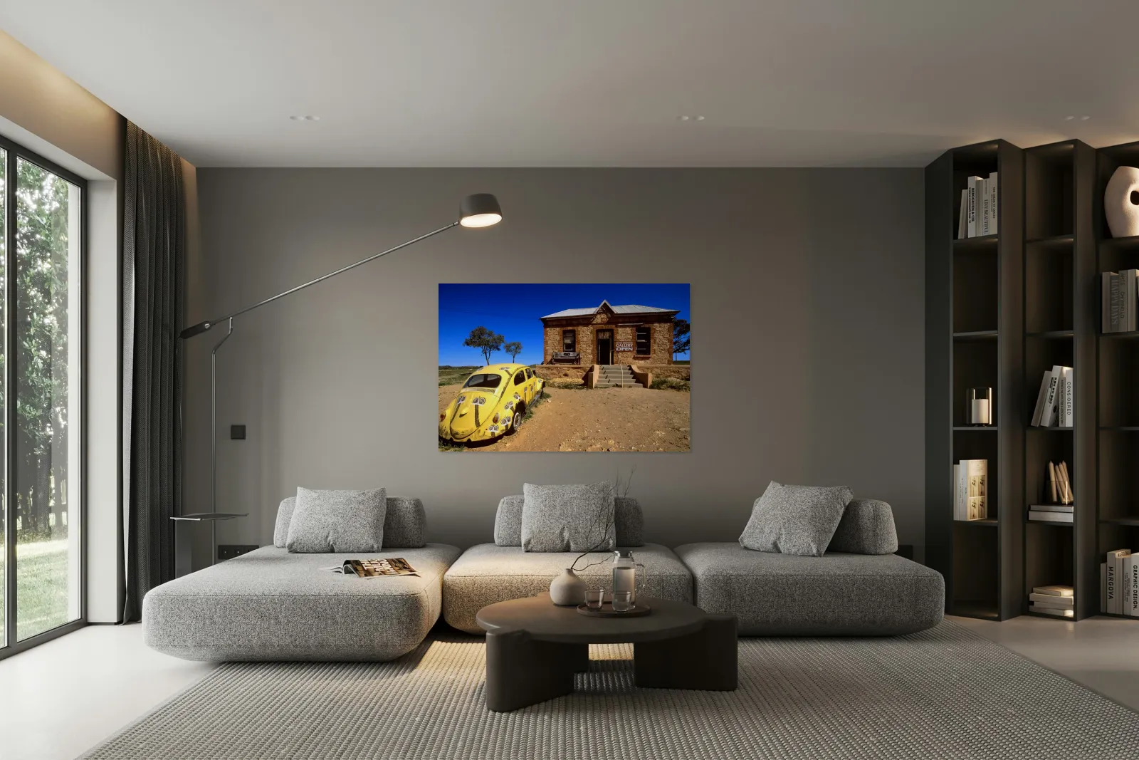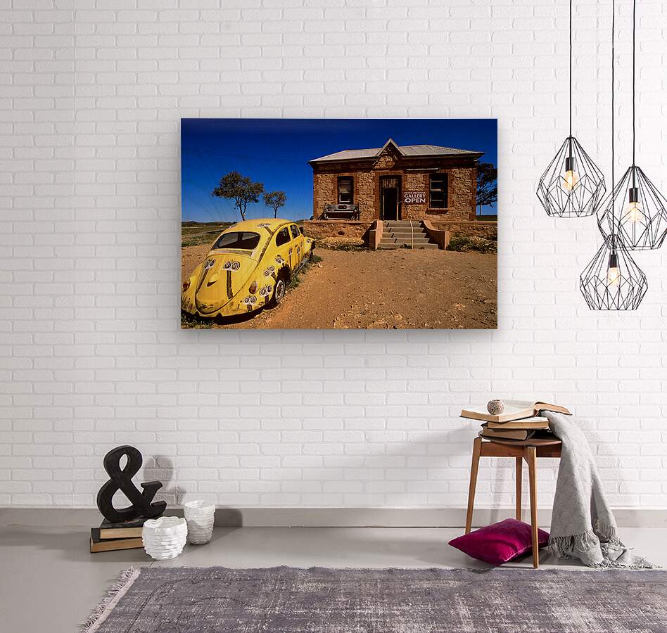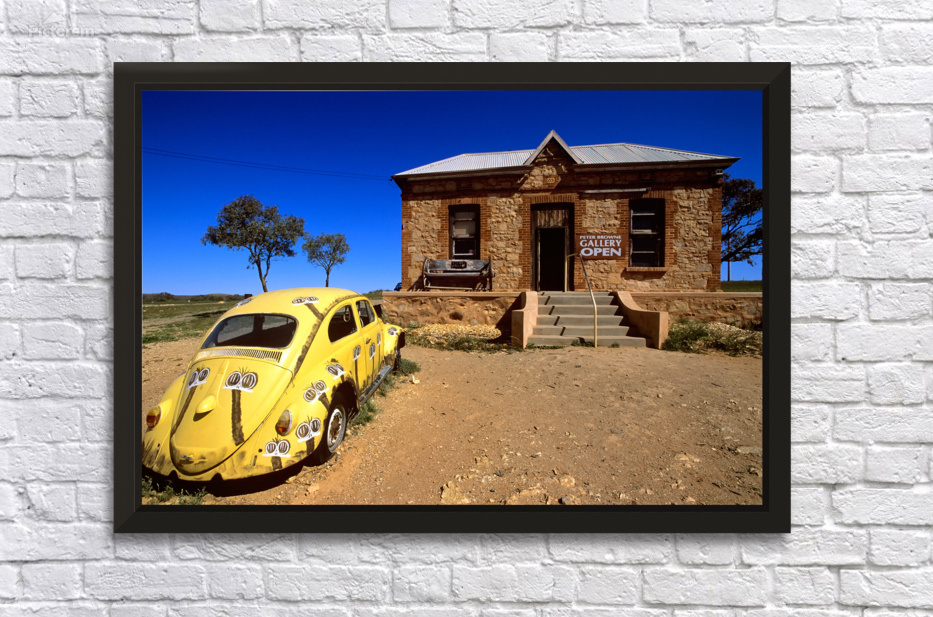 A decorated yellow VW Beetle sits outside the Peter Browne Gallery in the old Municipal Chambers building in Silverton New South Wales Australia.