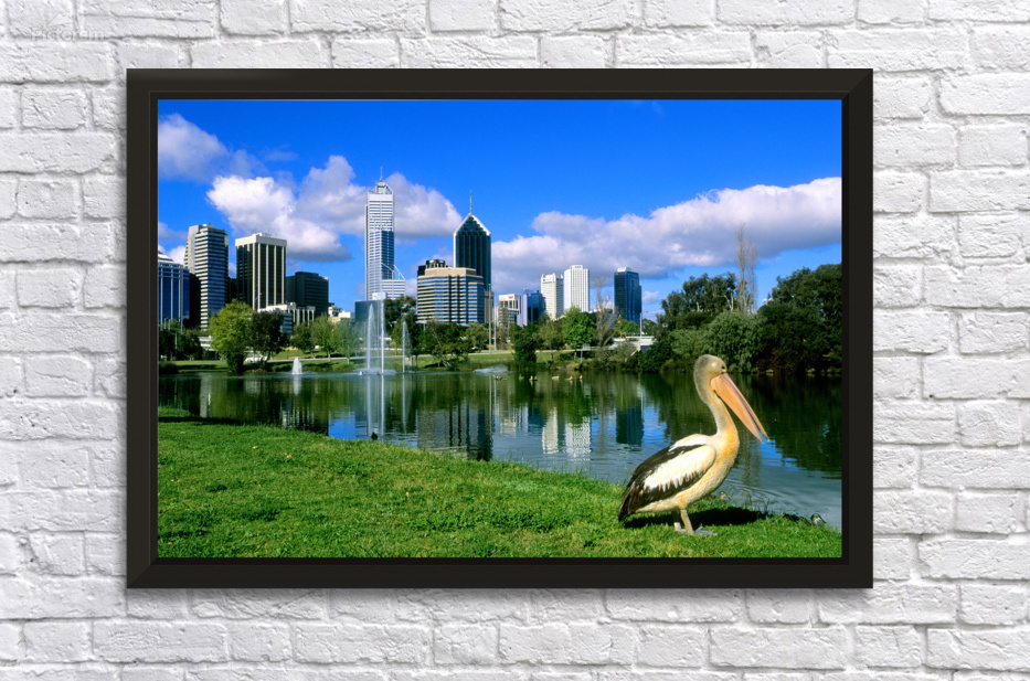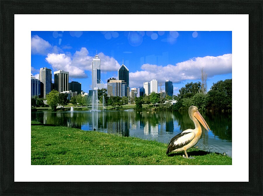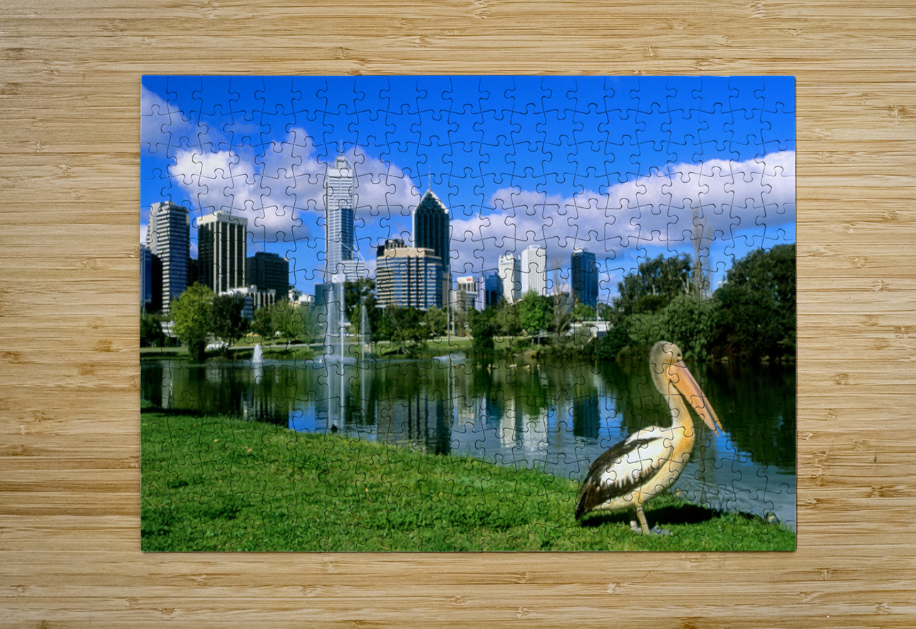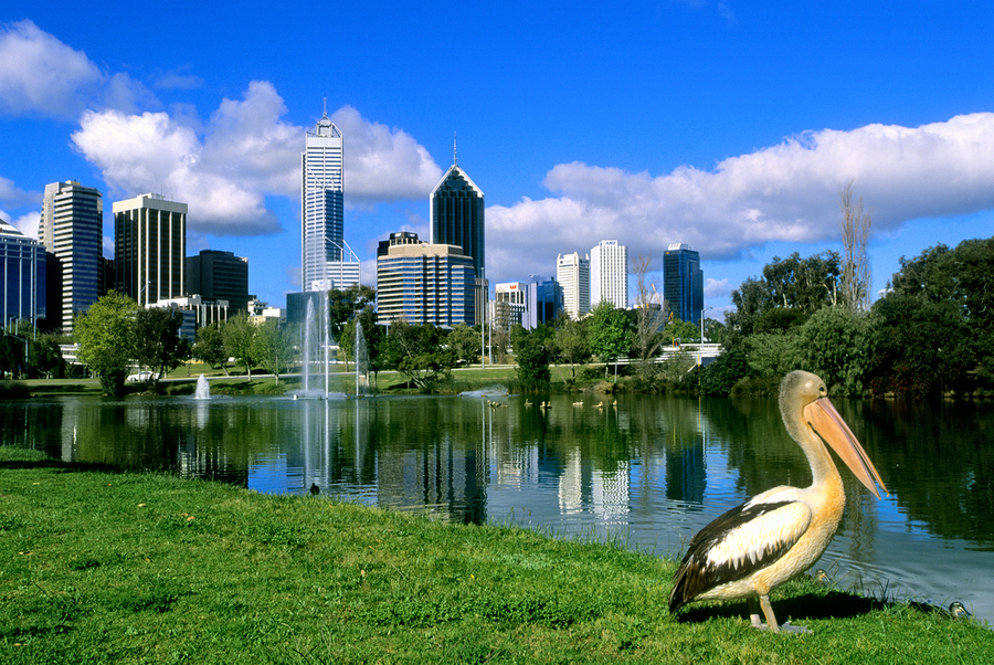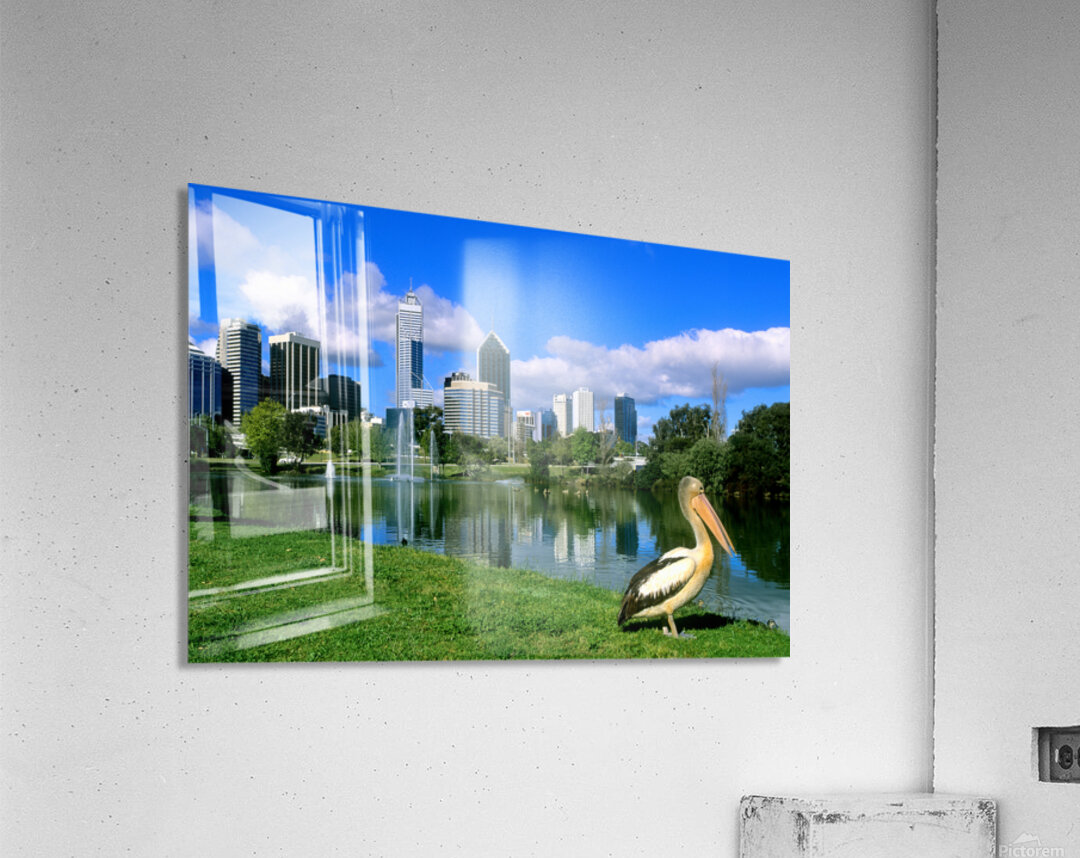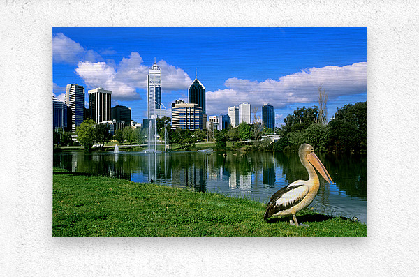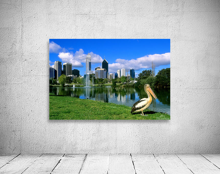 An Australian pelican stands on the grassy bank of a park lake with the city skyline of Perth Western Australia reflected in the water behind it.