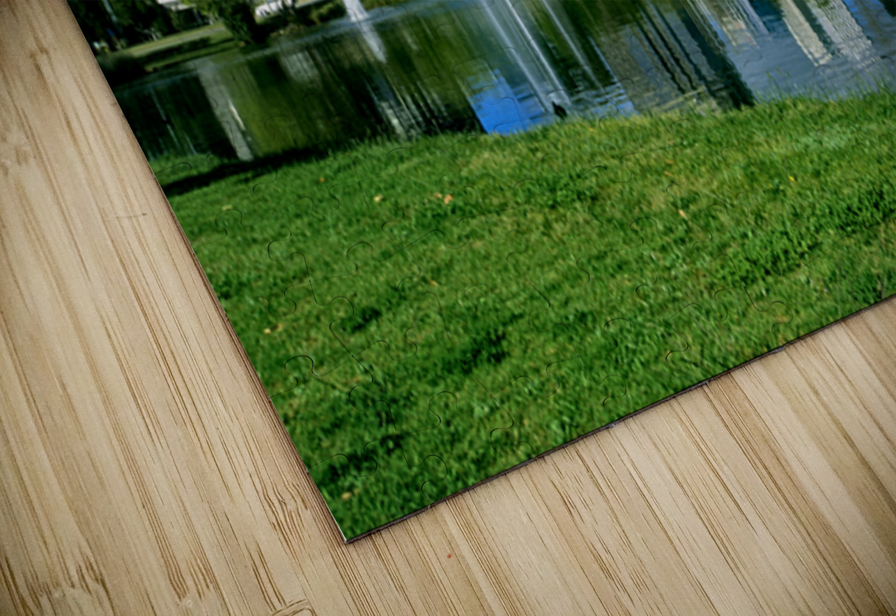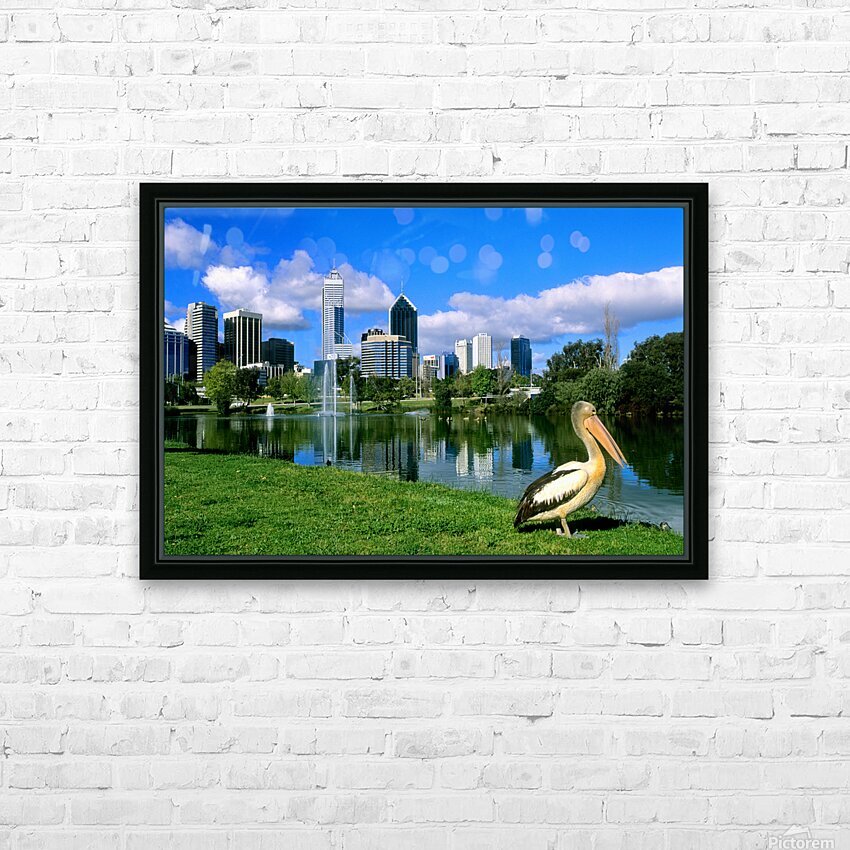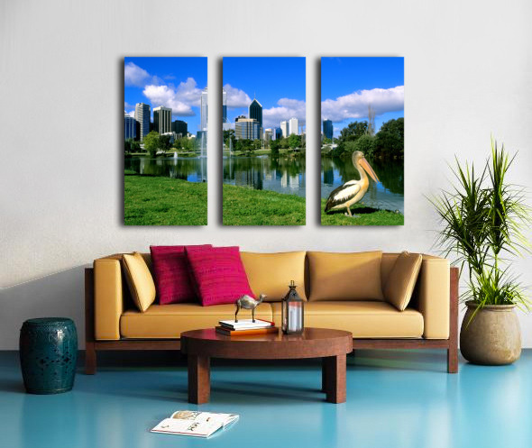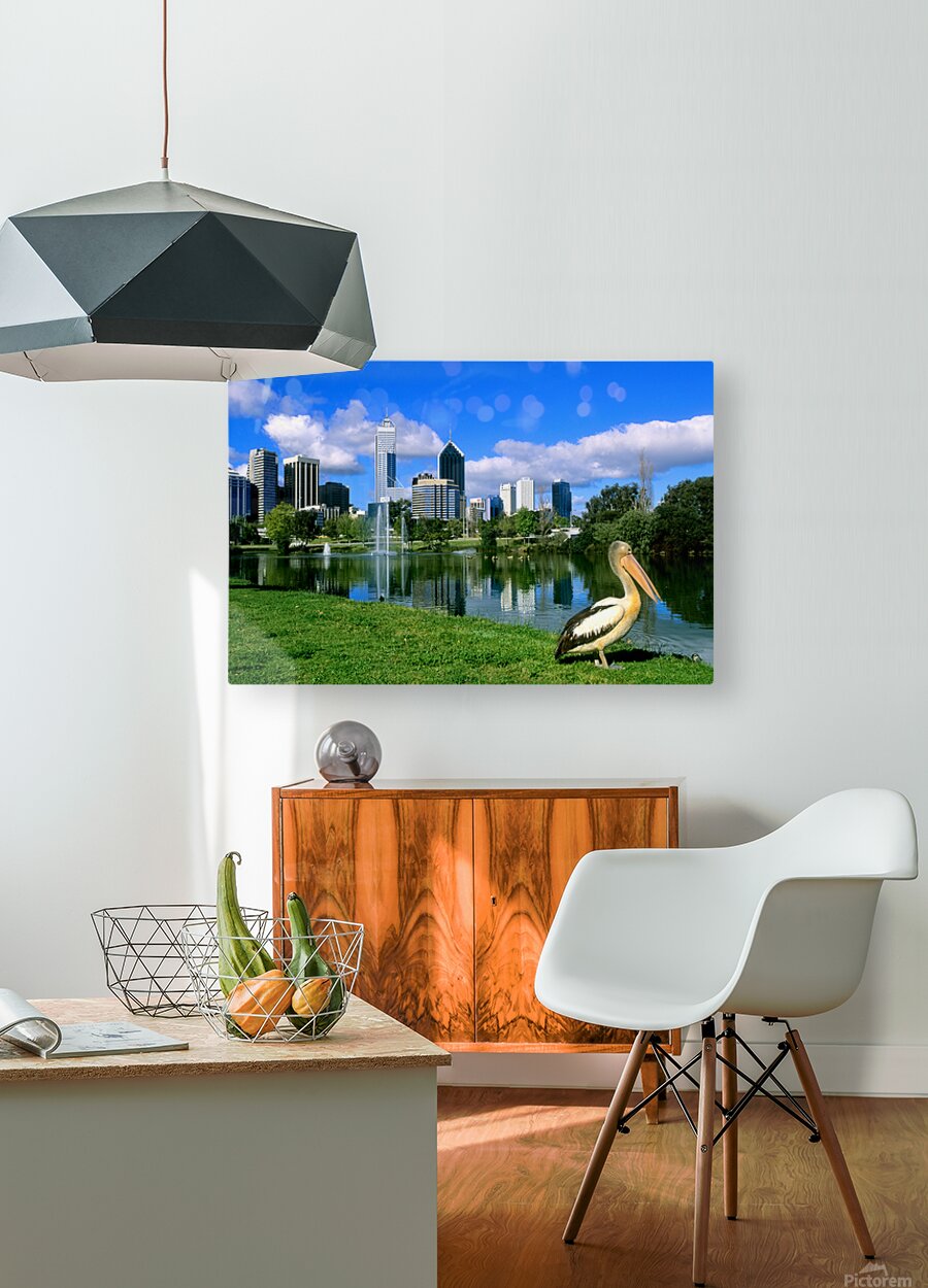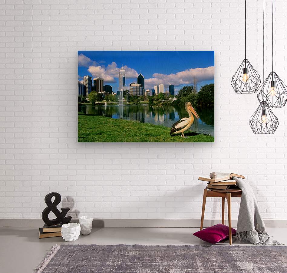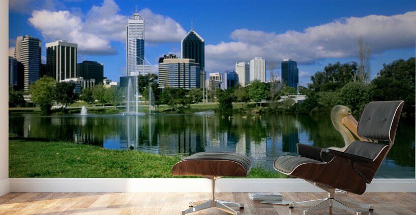 An Australian pelican stands on the grassy bank of a park lake with the city skyline of Perth Western Australia reflected in the water behind it.