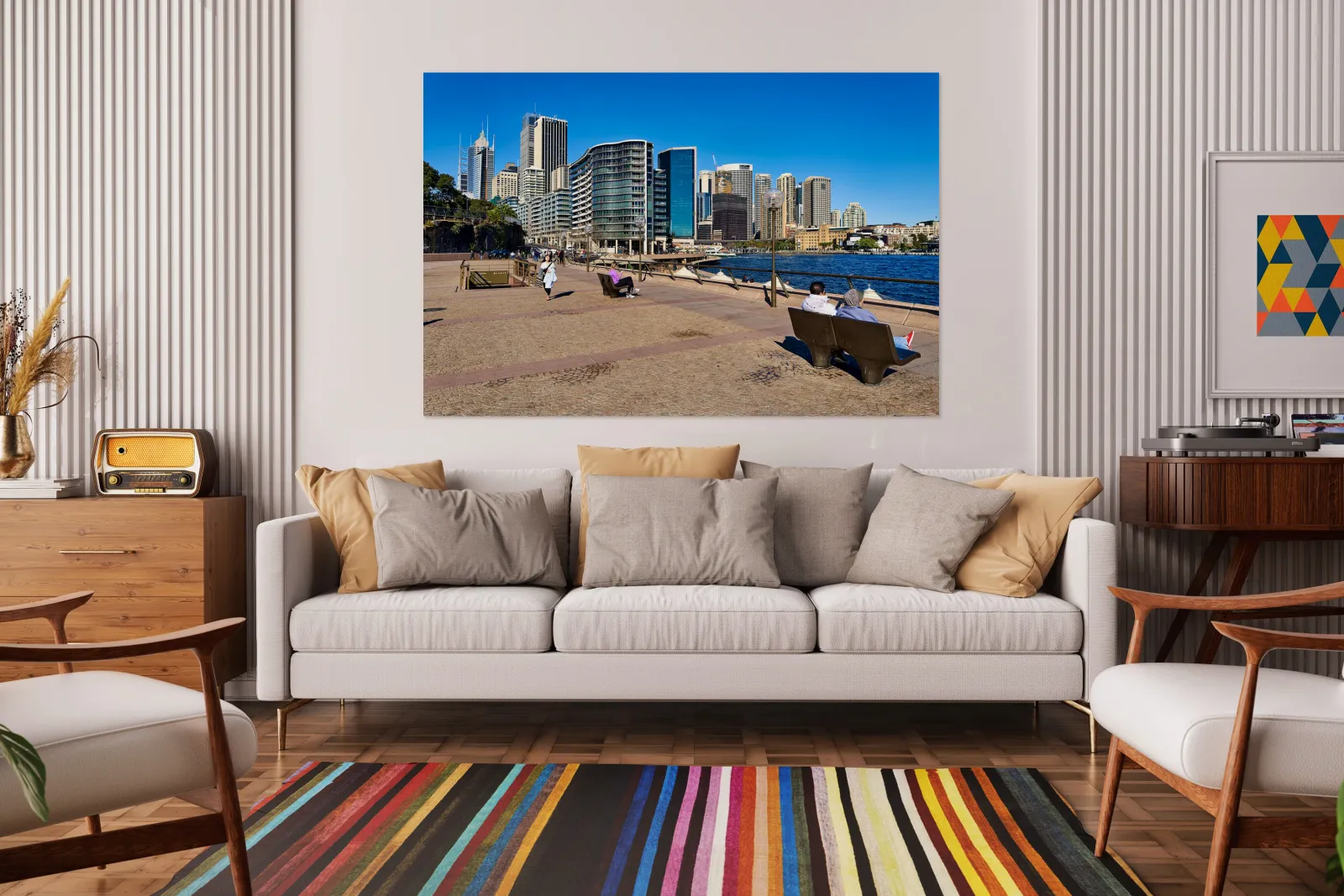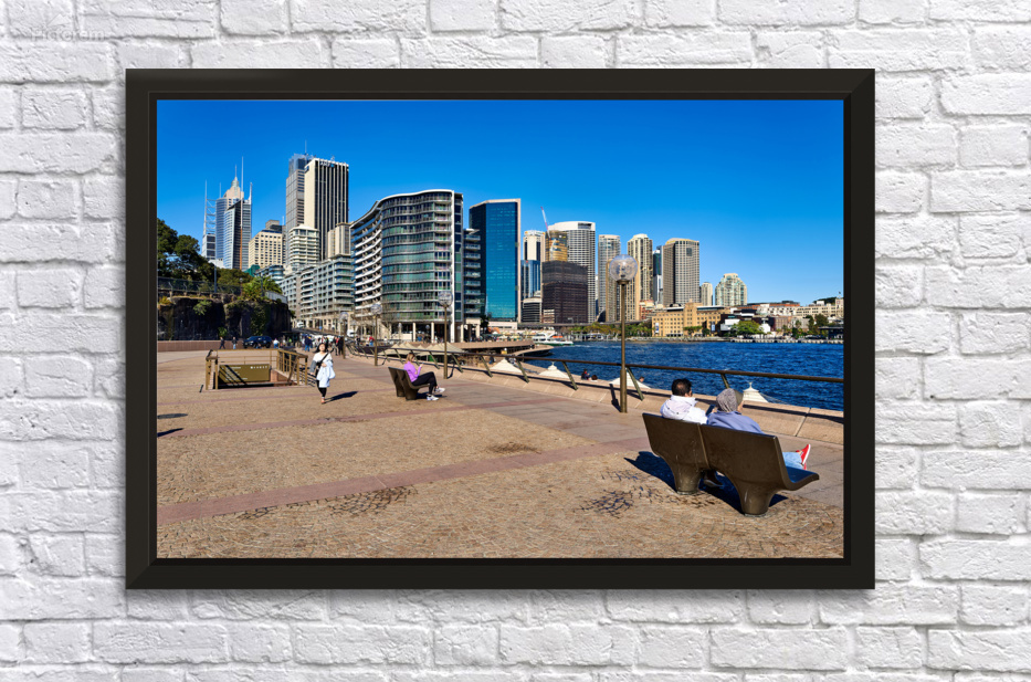Sydney Australia - People enjoy a sunny day at Circular Quay with the city skyline in the background.