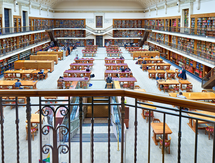 People work at tables in the reading room of Mitchell Library in Sydney. Many books are stored on shelves around the room.