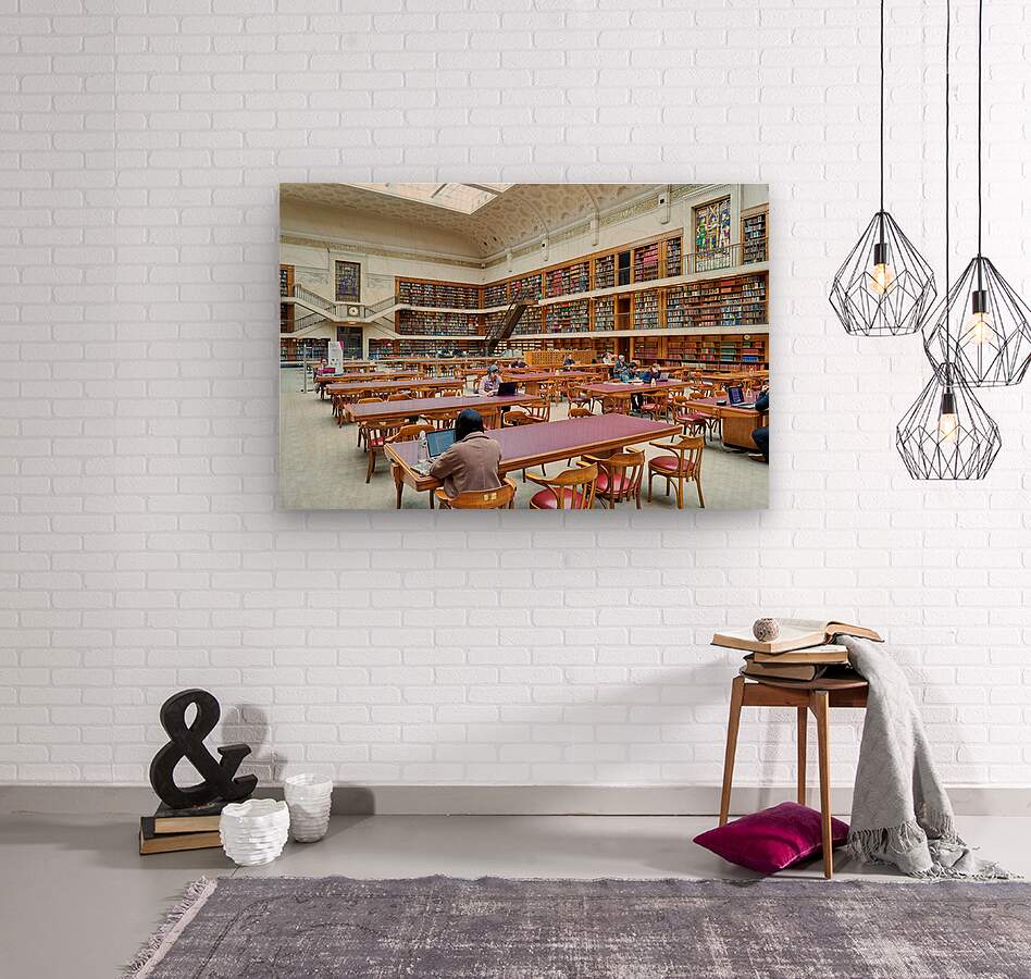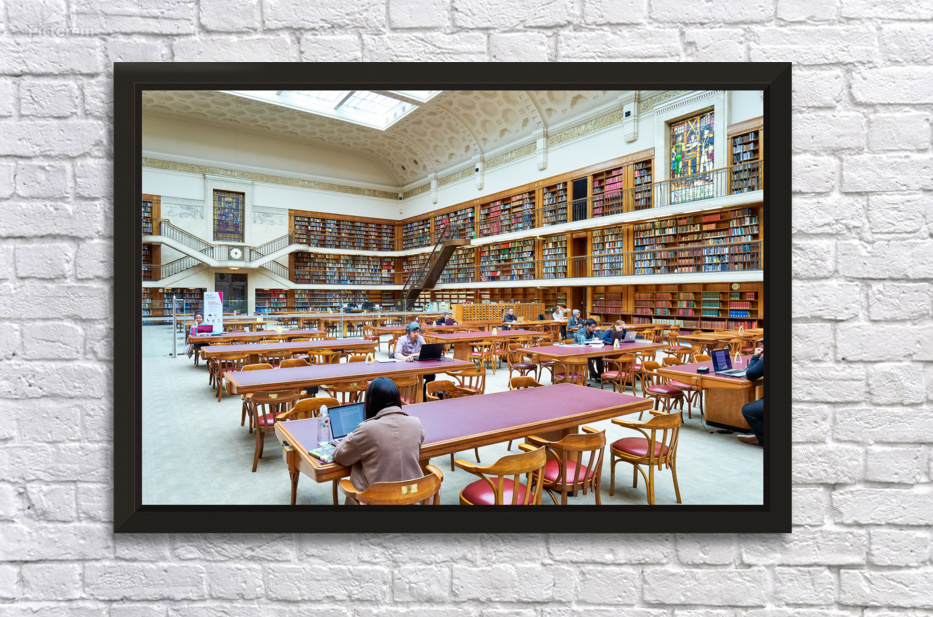 People are working at tables in the reading room of Mitchell Library in Sydney. Books line the walls in this large space dedicated to study.