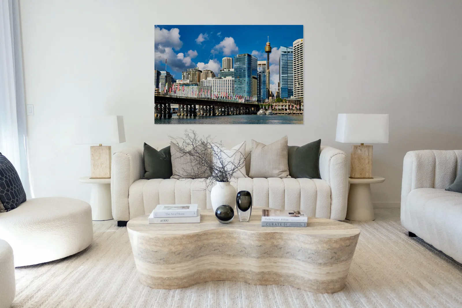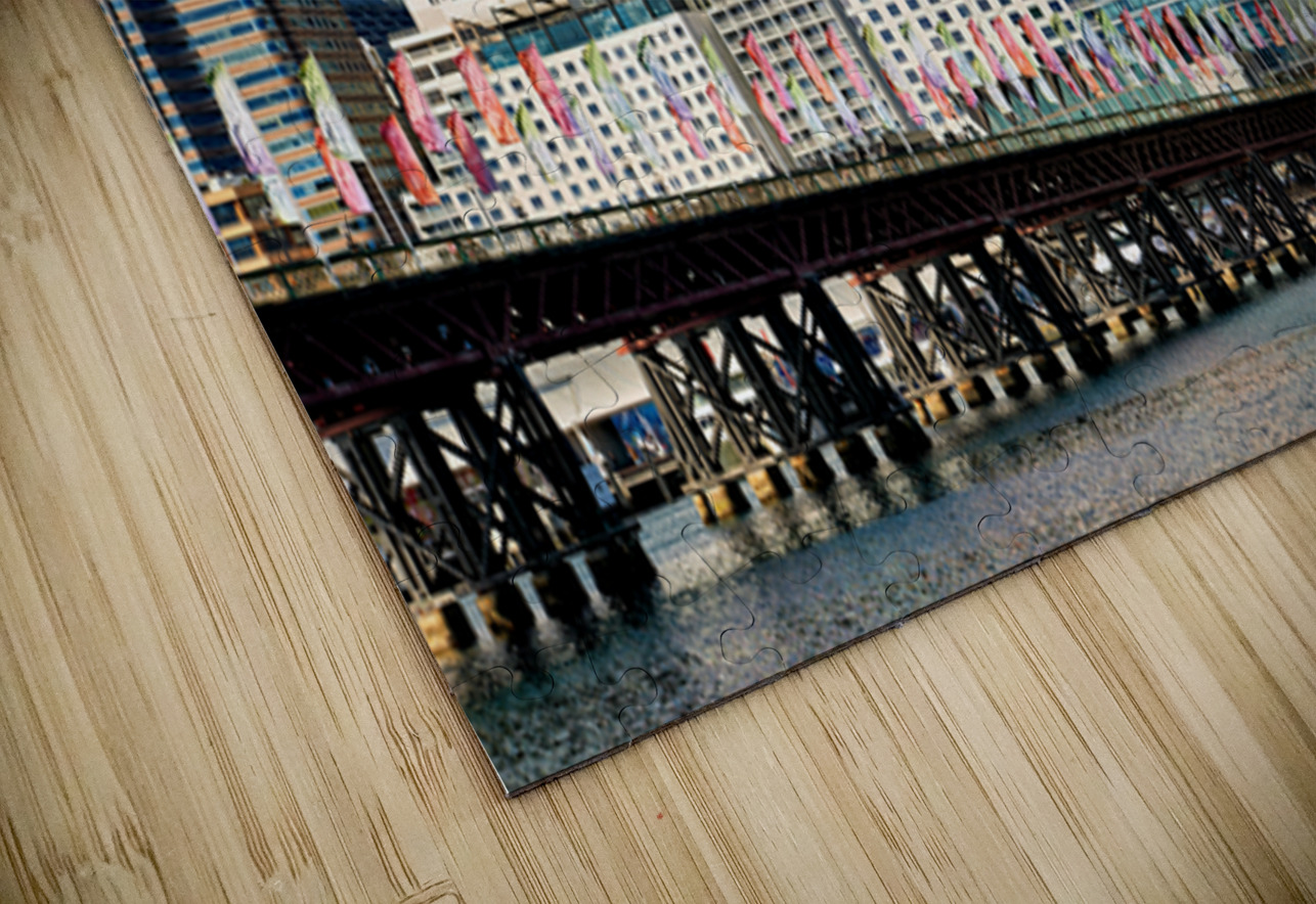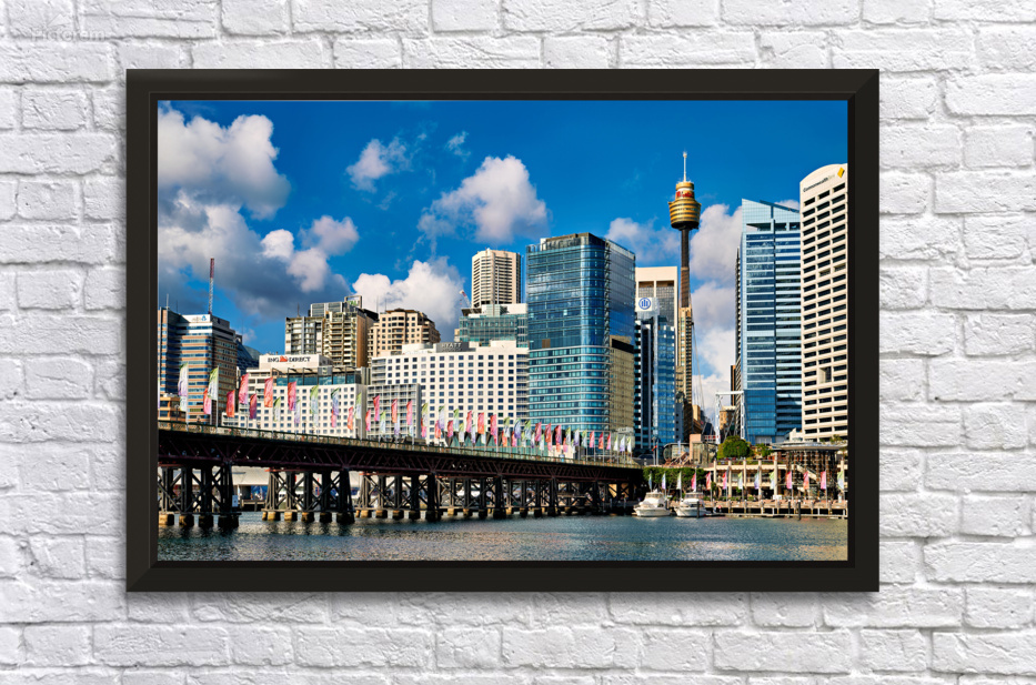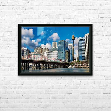 "Sydney Harbour skyline with bridge and boats." in a framed print.