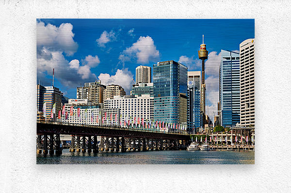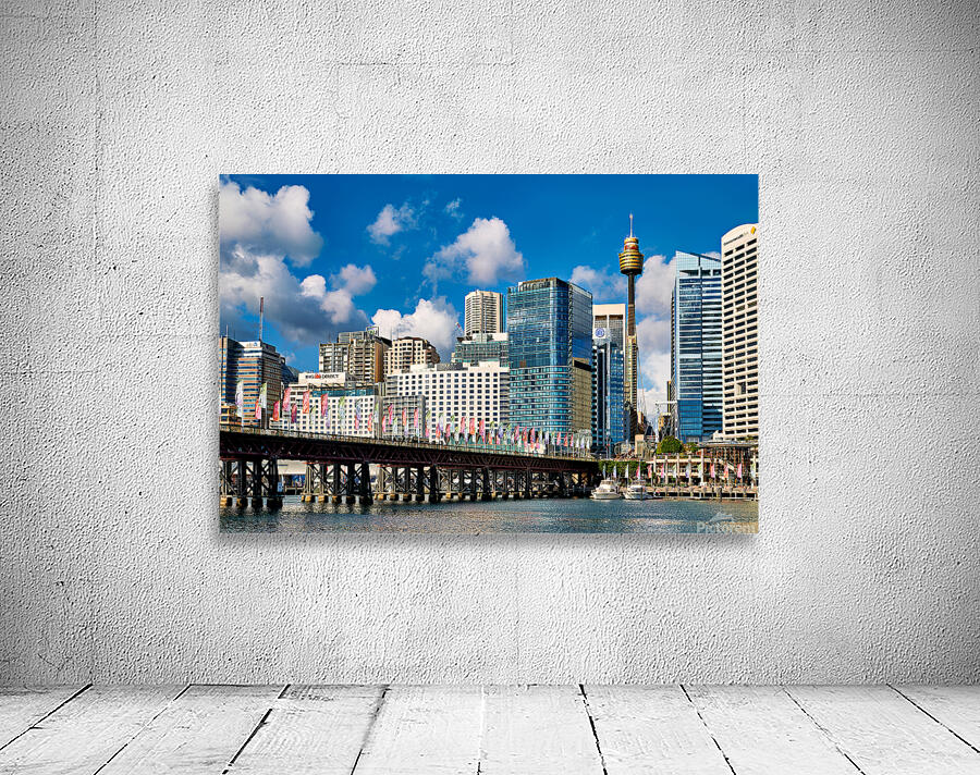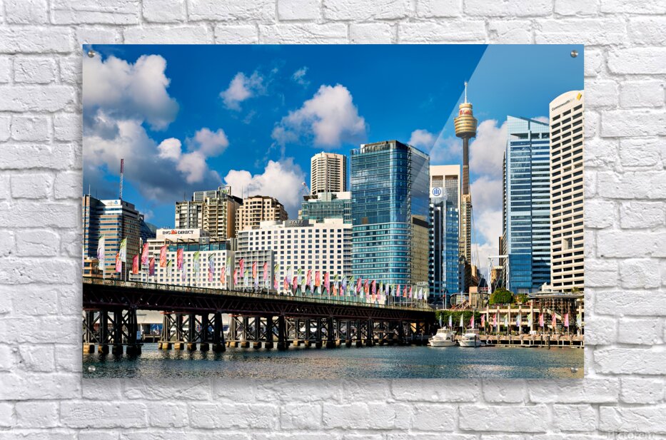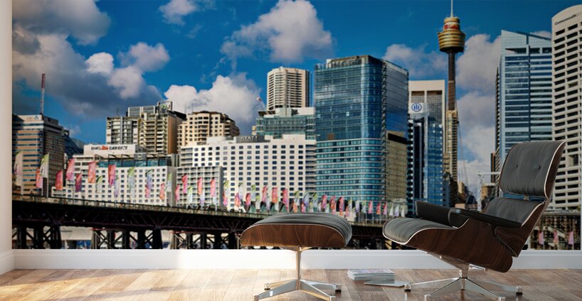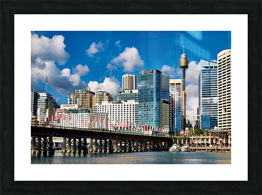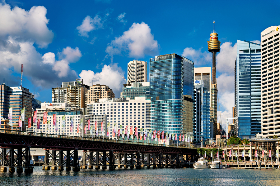 Darling Harbour Sydney Australia features the iconic Sydney Tower Eye and modern skyscrapers with colorful flags decorating the waterfront promenade.