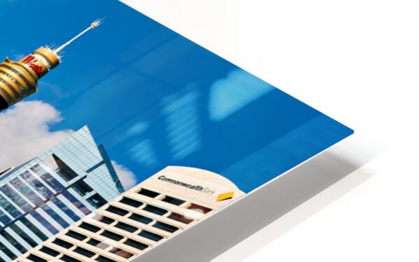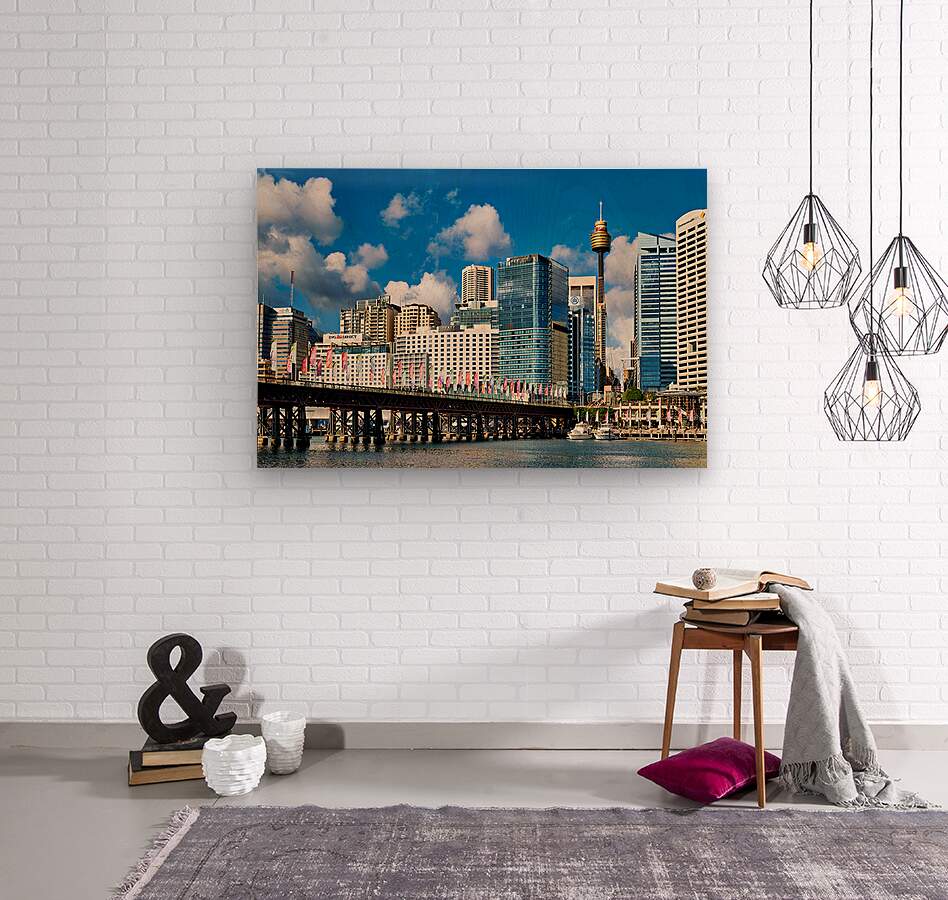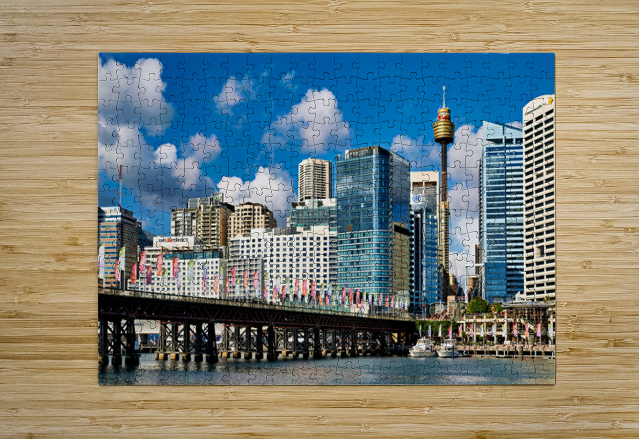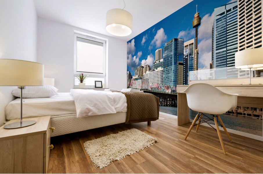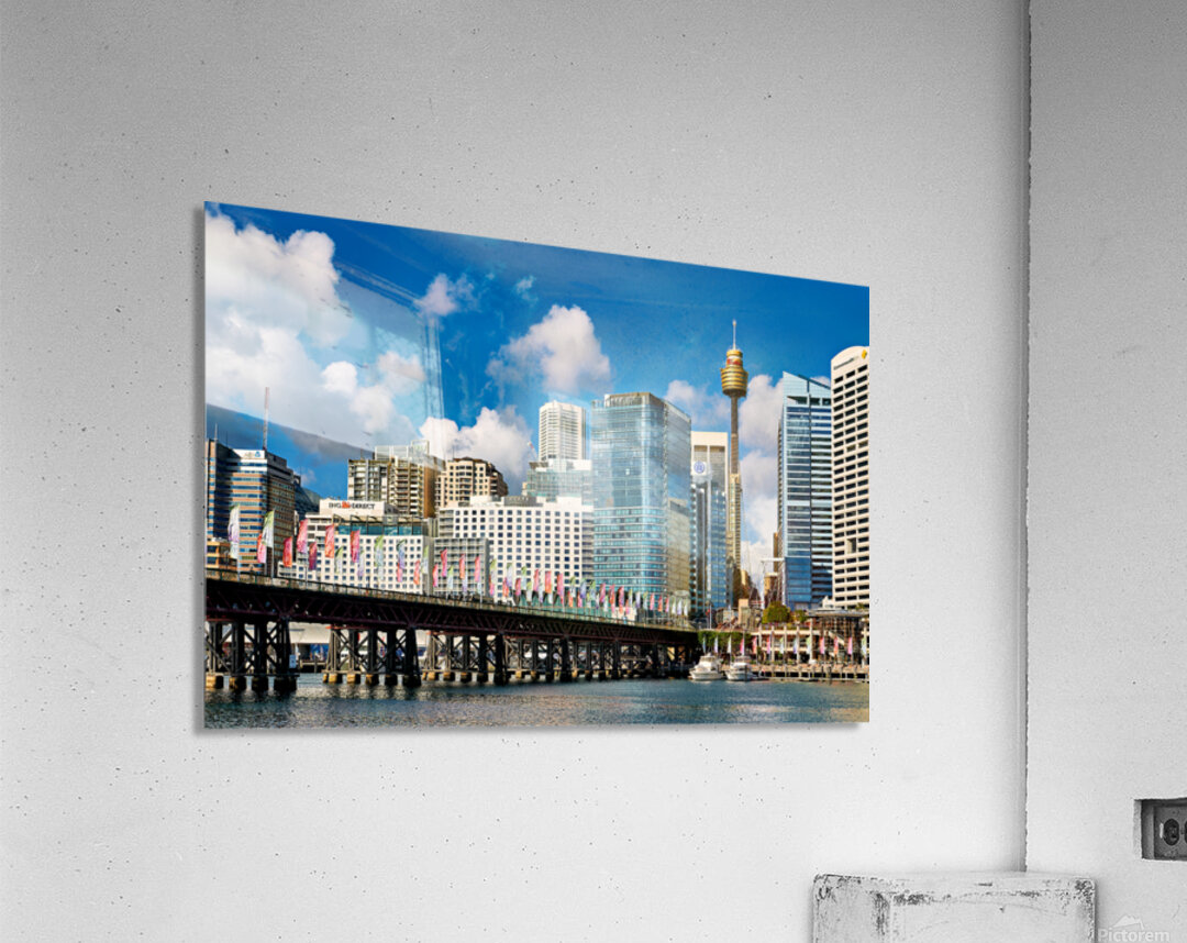 Darling Harbour Sydney Australia features the iconic Sydney Tower Eye and modern skyscrapers with colorful flags decorating the waterfront promenade.