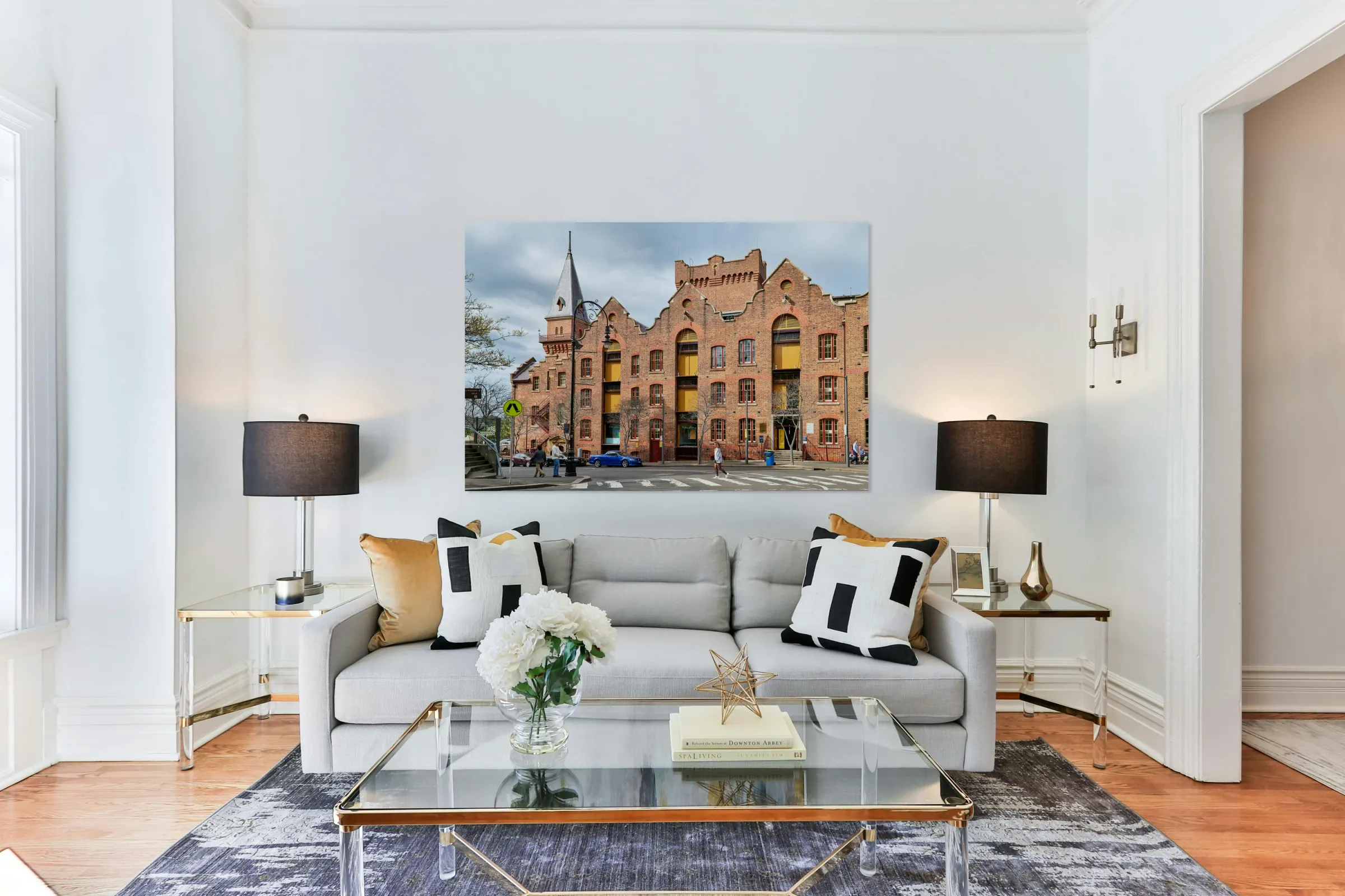 Historic brick building with a tower and people walking. Picture Frame Printing