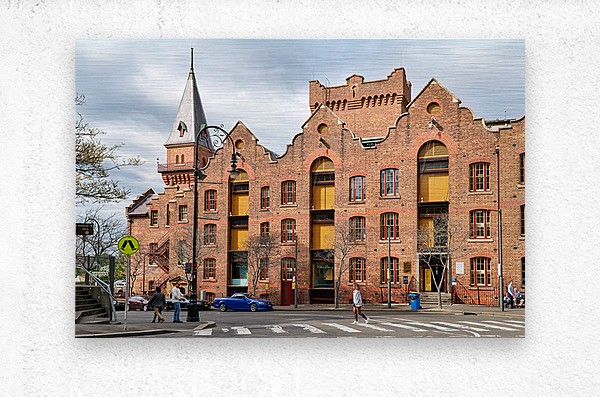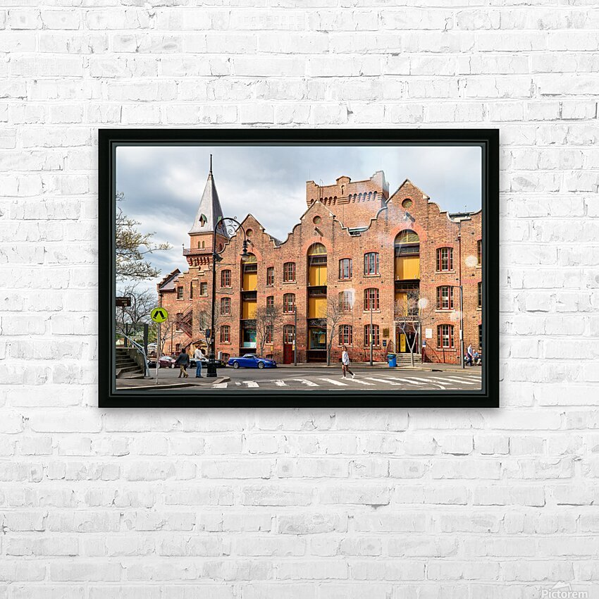 Historic brick building with a tower and people walking. Picture Frame Printing